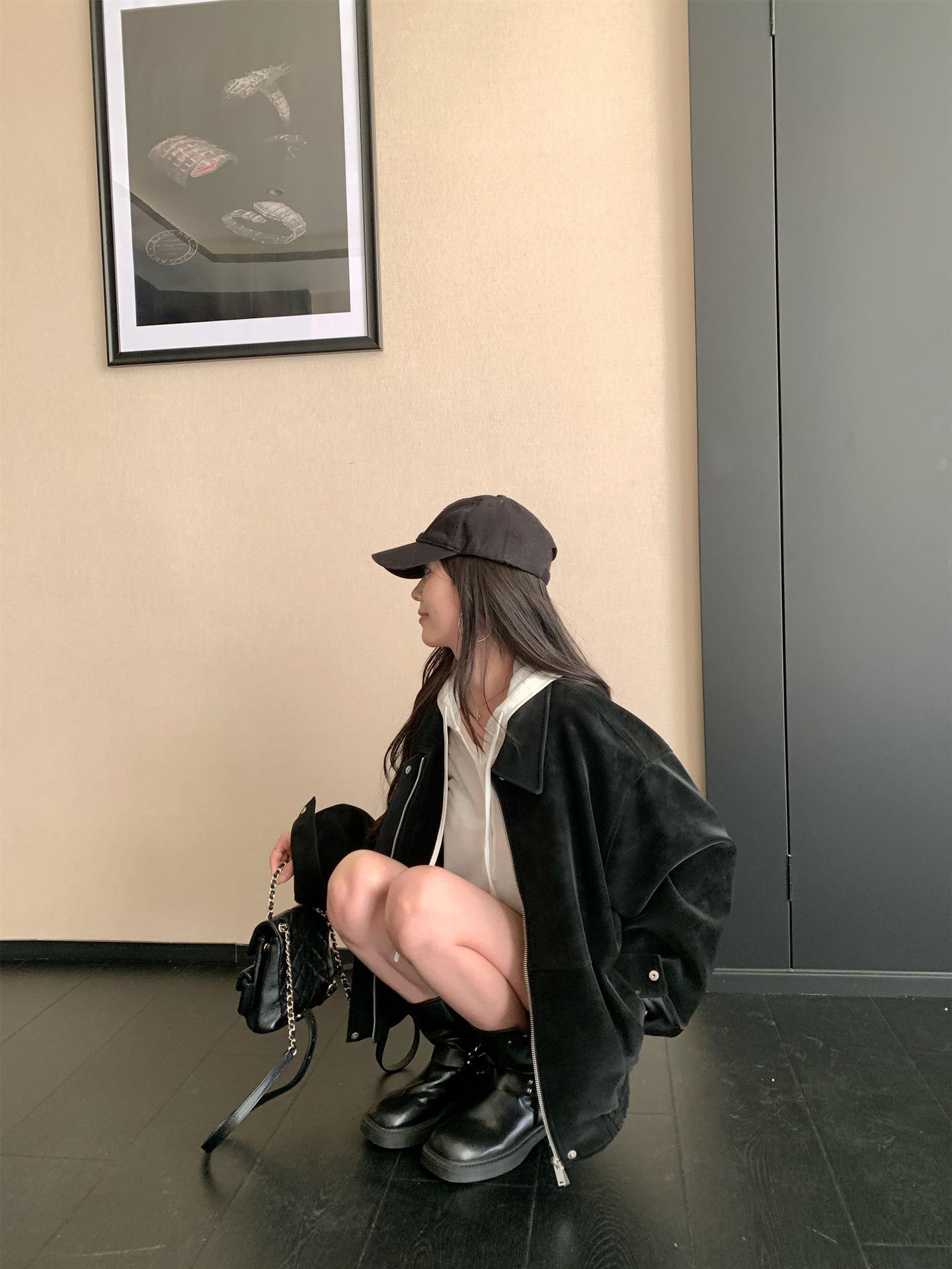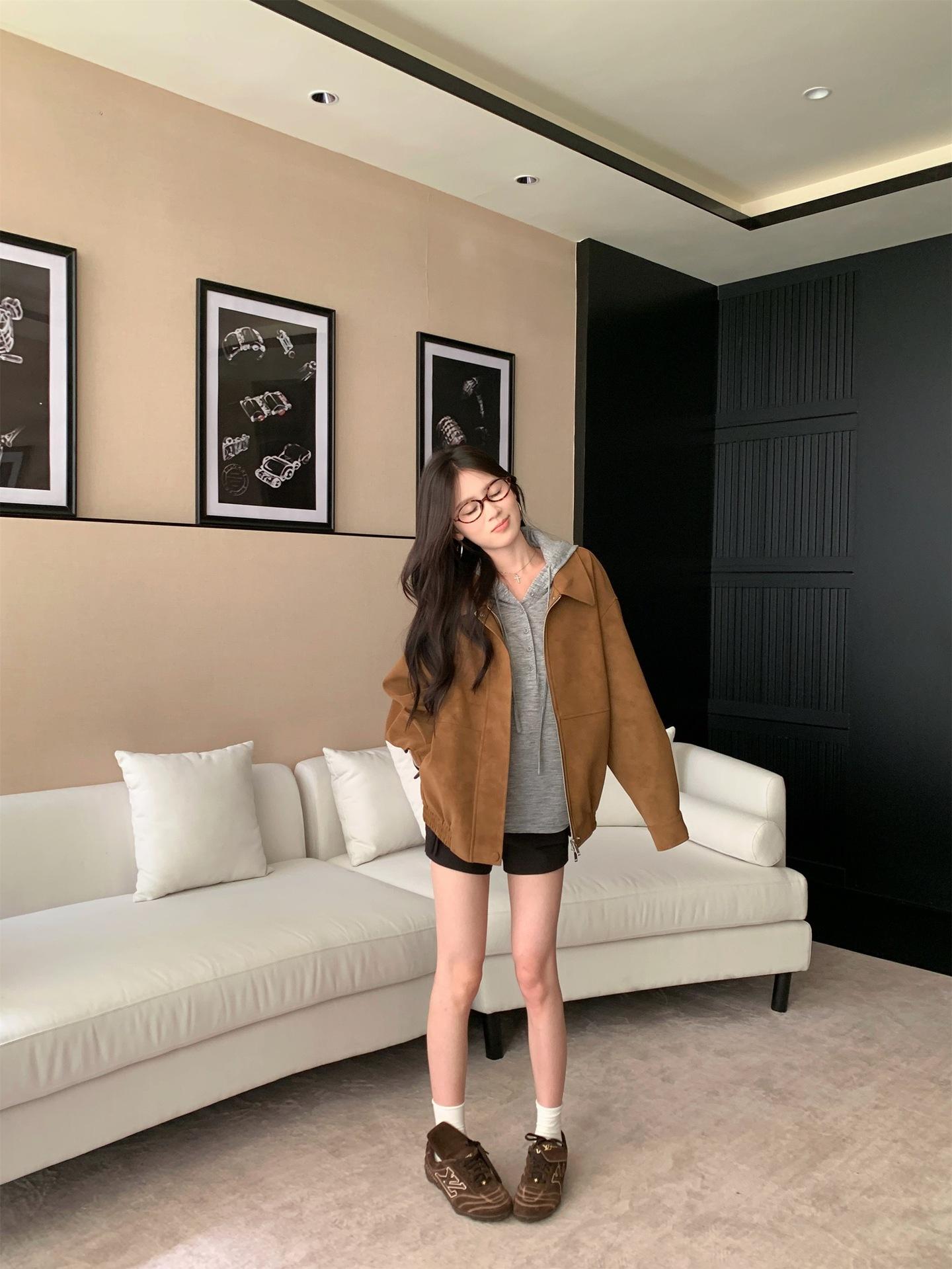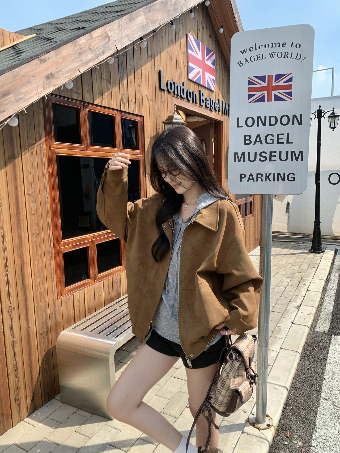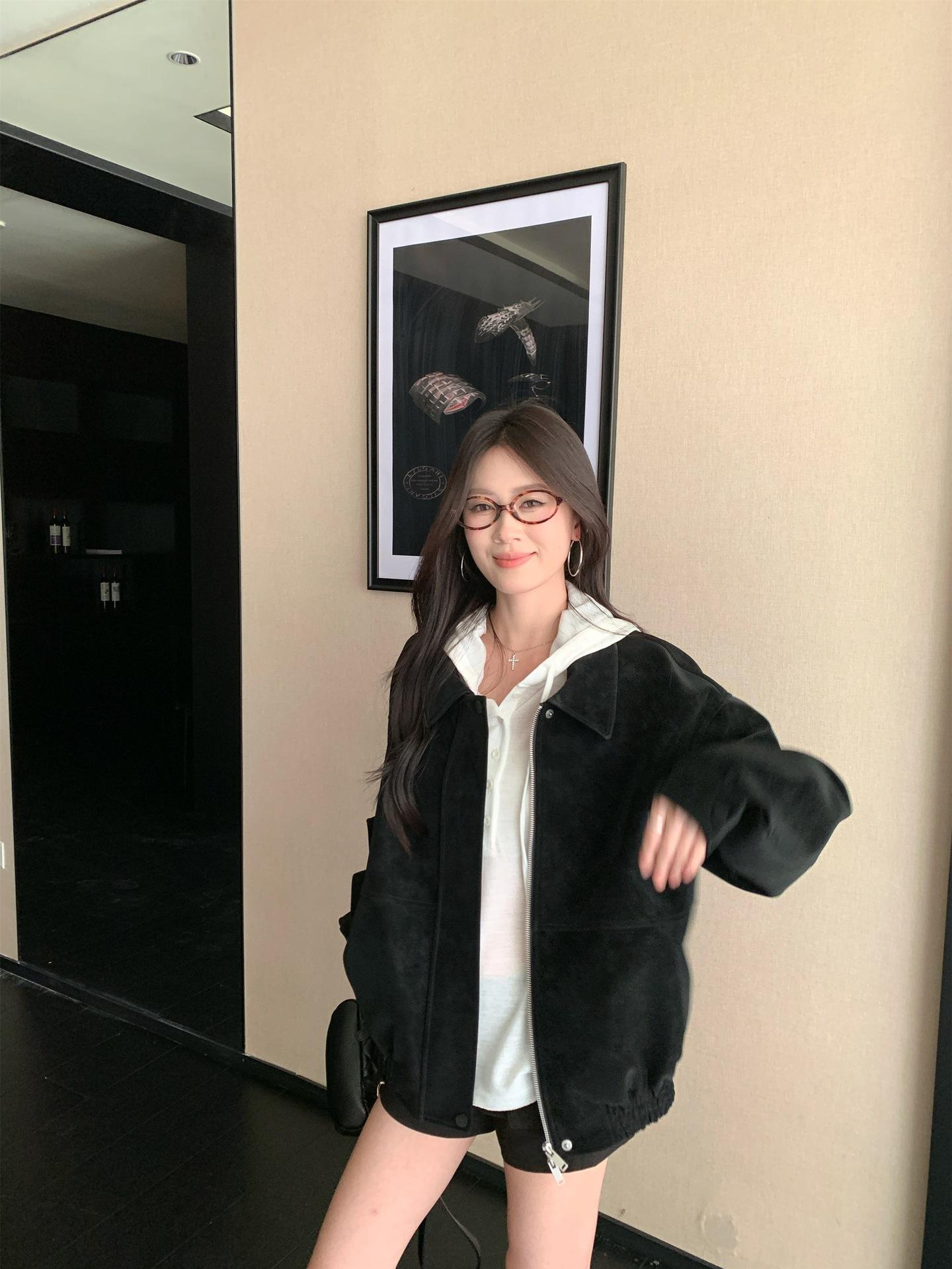 Foto Real Chaqueta de Gamuza Retro Mujer Otoño 2025 Americana Holgada Cuello Solapa Casual Versátil Adelgazante Abrigo Top