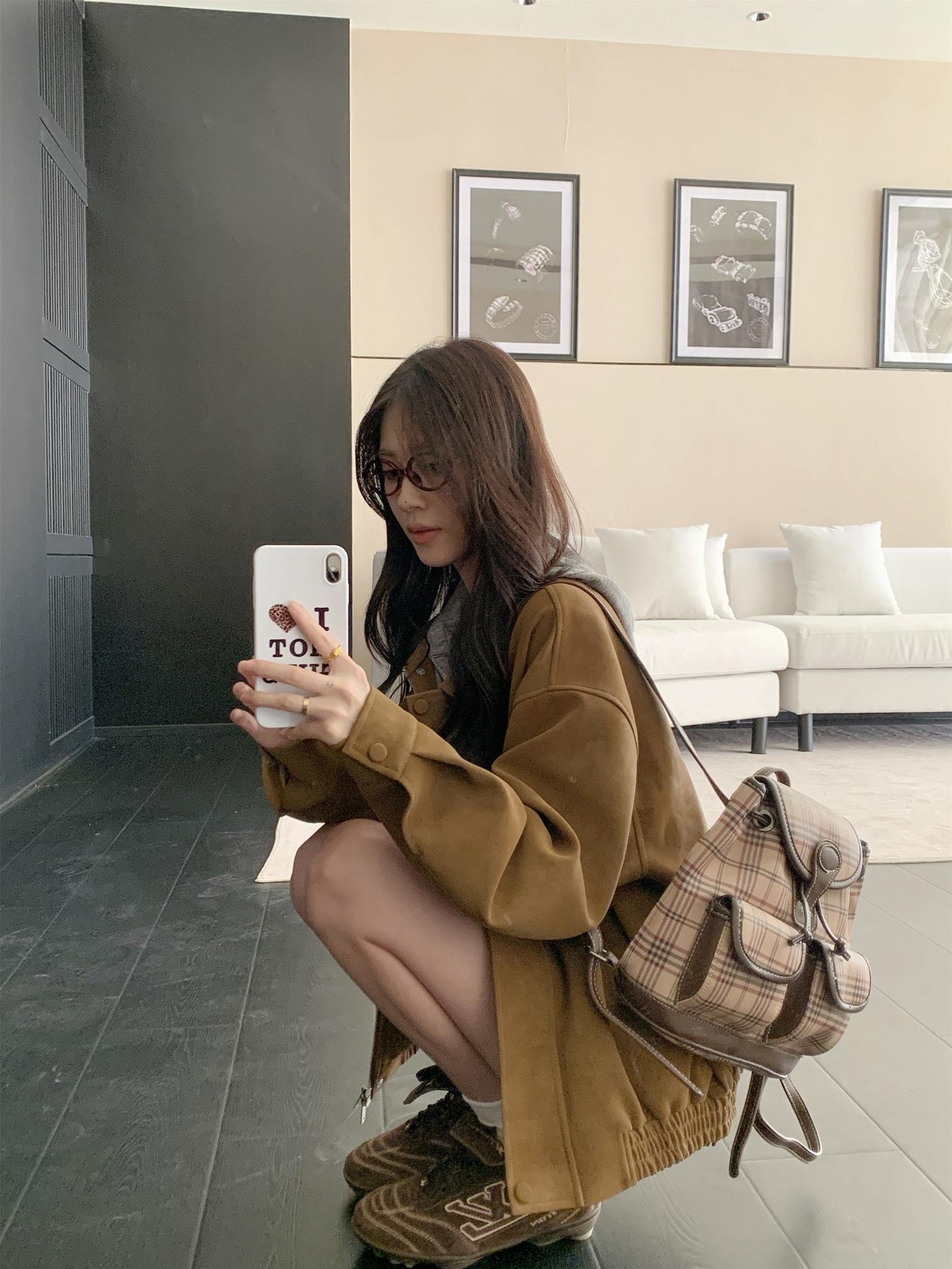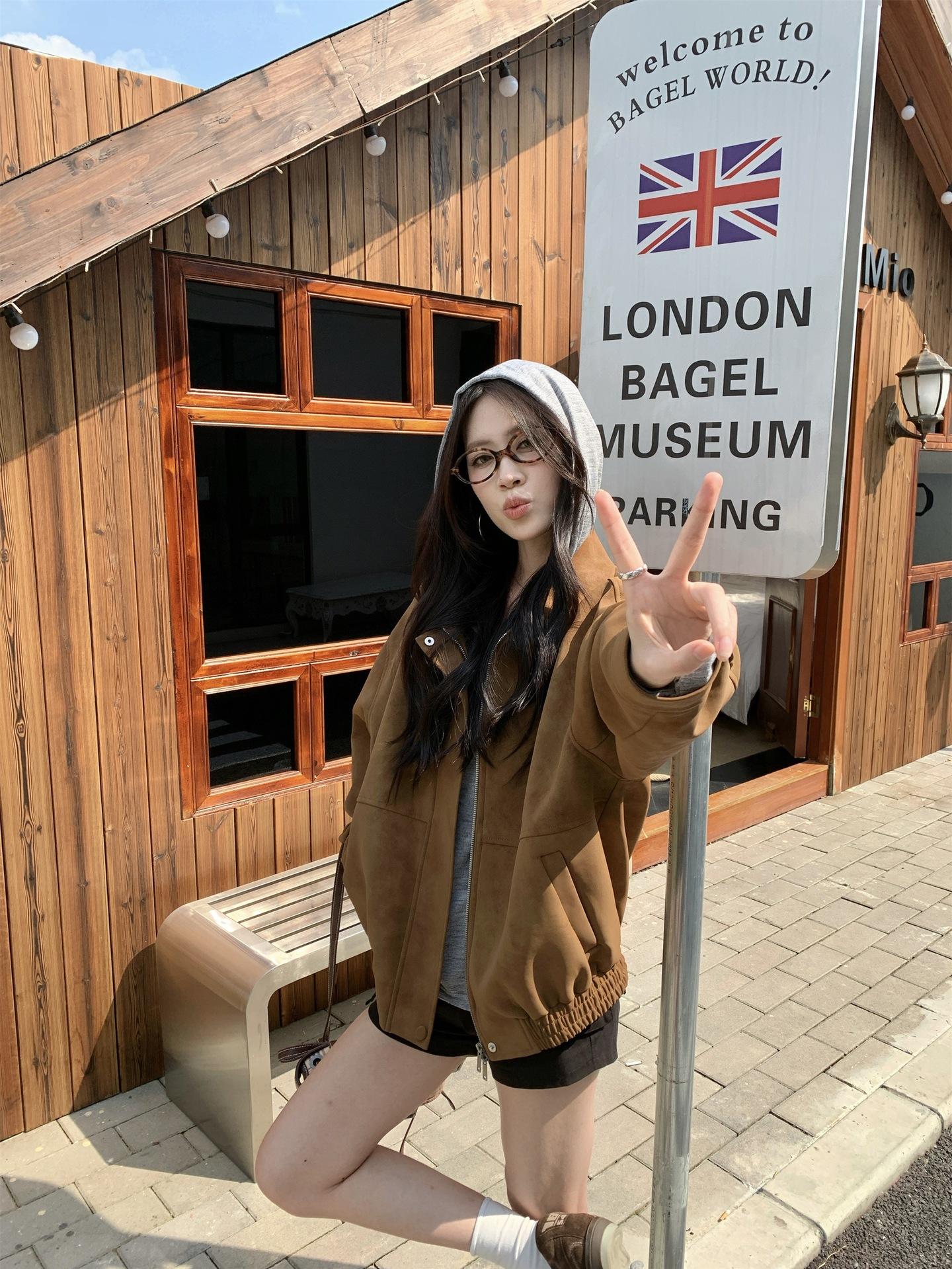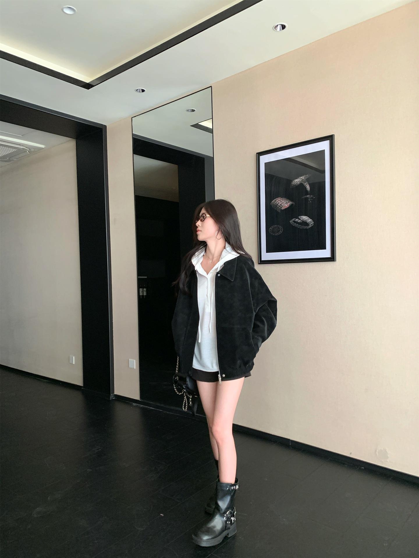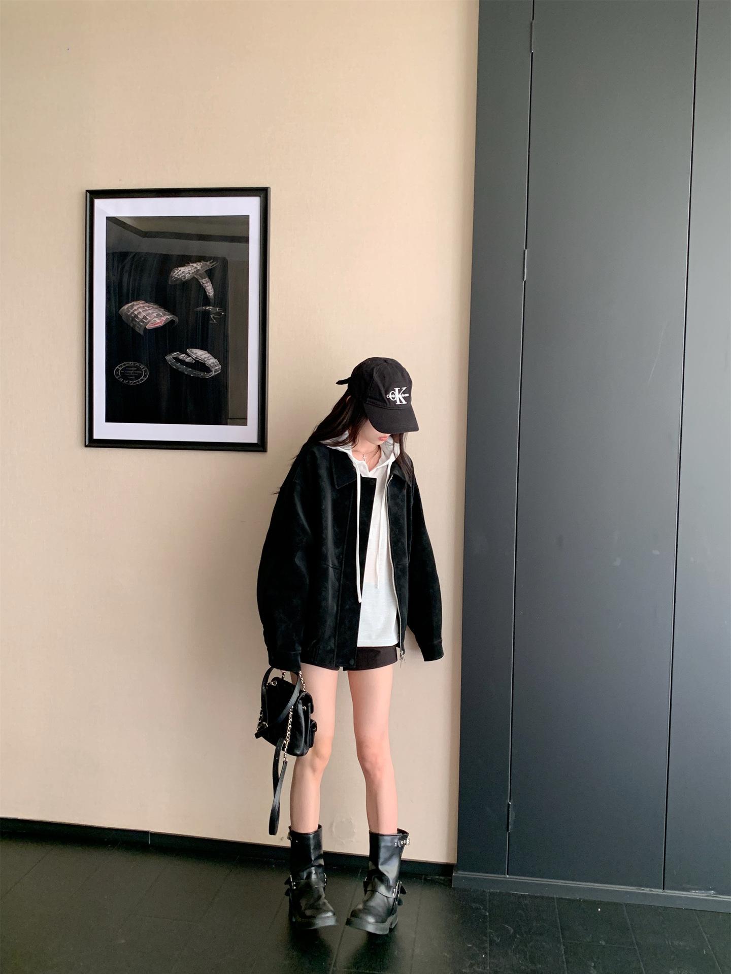 Foto Real Chaqueta de Gamuza Retro Mujer Otoño 2025 Americana Holgada Cuello Solapa Casual Versátil Adelgazante Abrigo Top