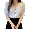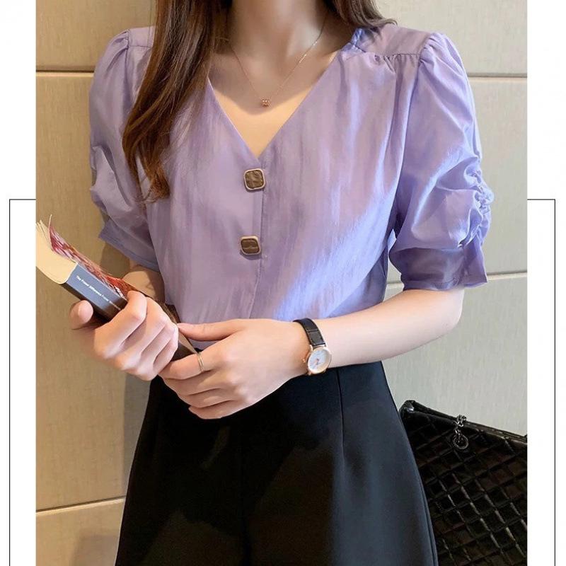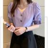 Blusa de gasa Camisa de manga corta para mujer 2021 Verano Nueva Suelta Cuello en V Morado Manga abullonada Top Moda Camisa pequeña de tendencia