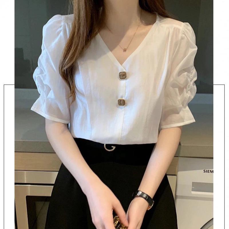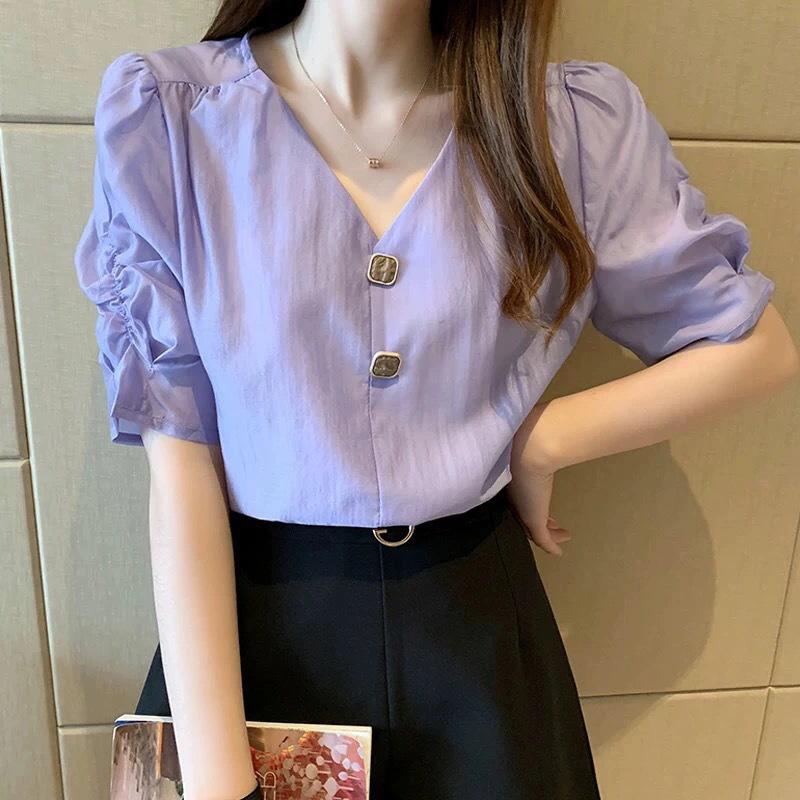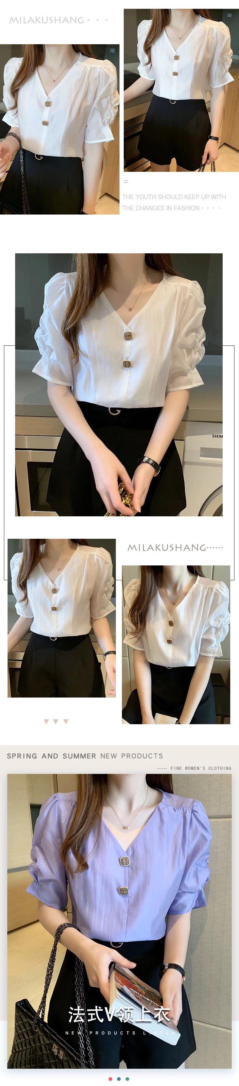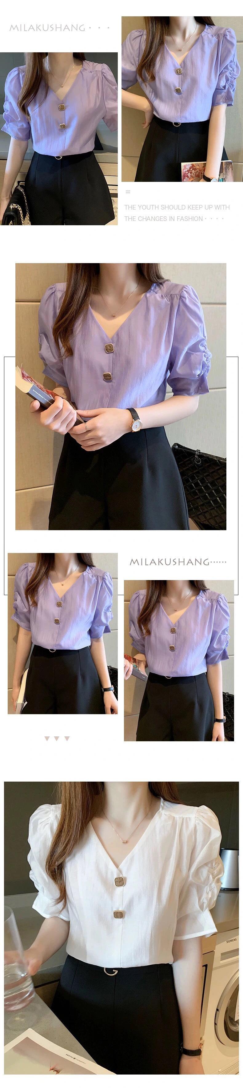 Compra Blusa de Gasa para Mujer, Camisa de Manga Corta, Verano 2023 Nuevo Top Holgado con Cuello en V Manga Abullonada Morado, Elegante y Chic al por mayor en Joom.pro