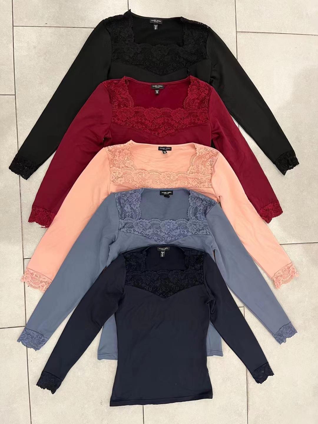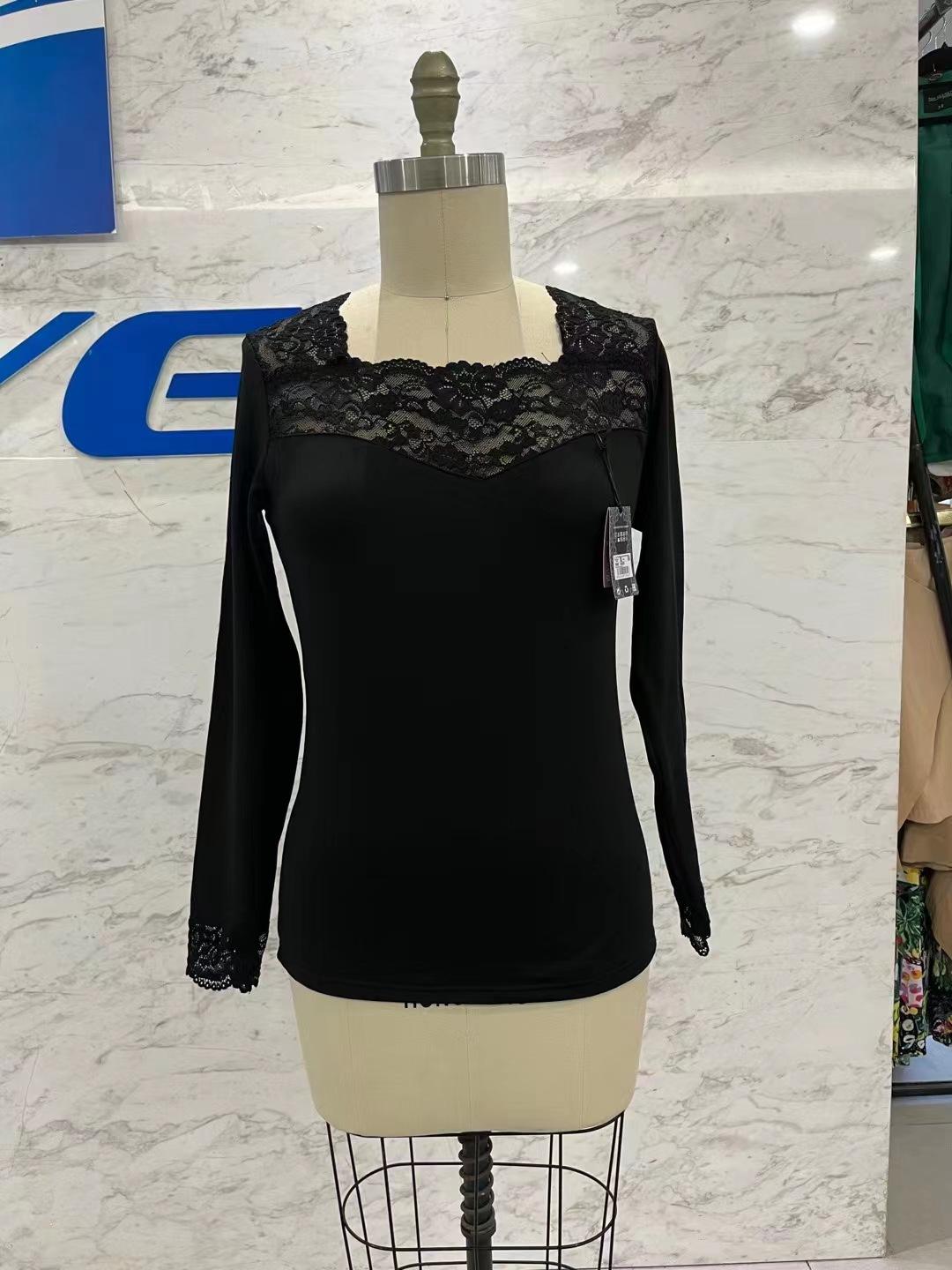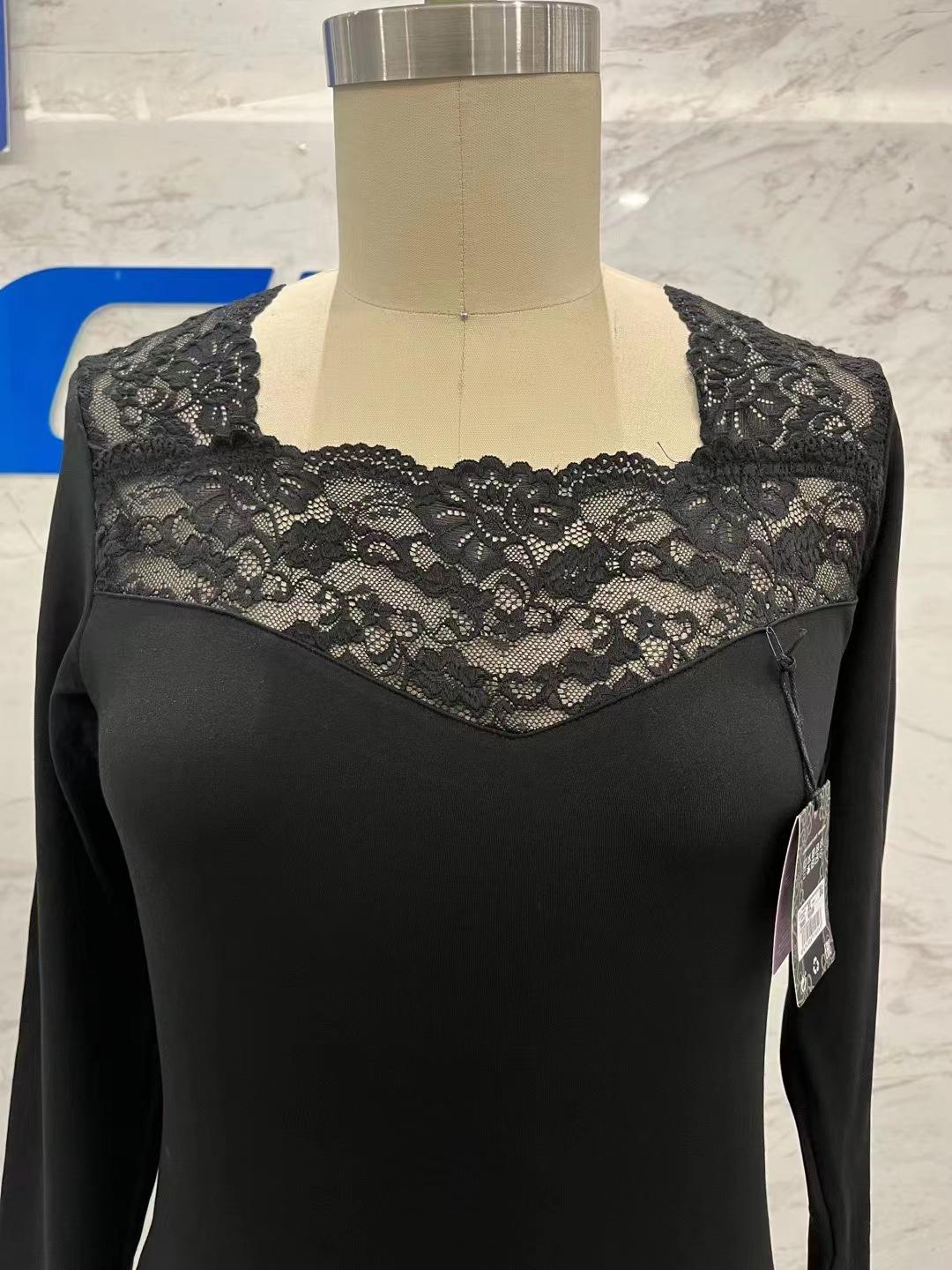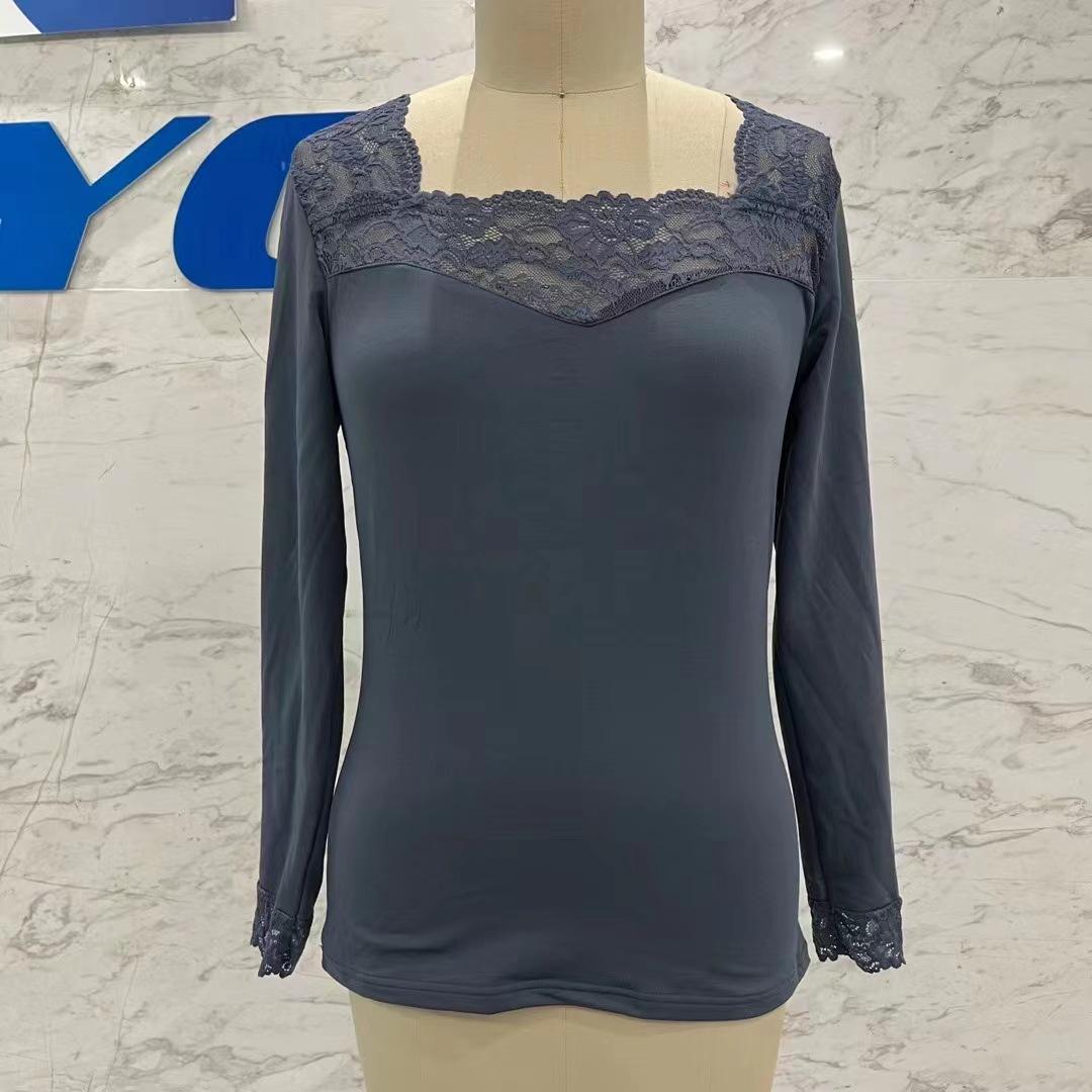 Playera de Encaje de Manga Larga para Mujer Damas Fibra de Poliéster Elástica Top Femenino Cuello Cuadrado Playera de Encaje