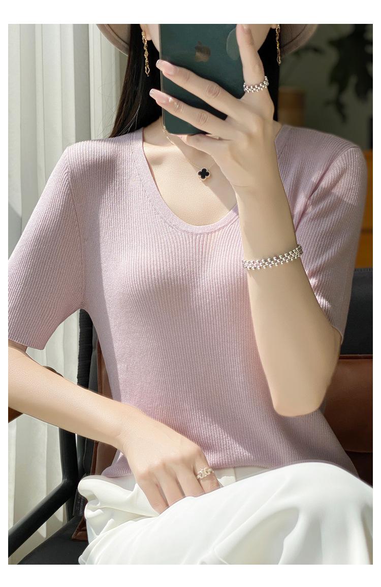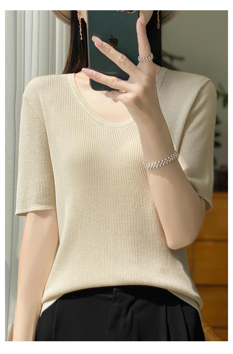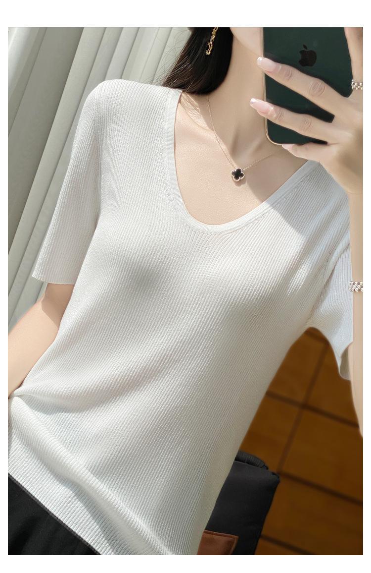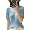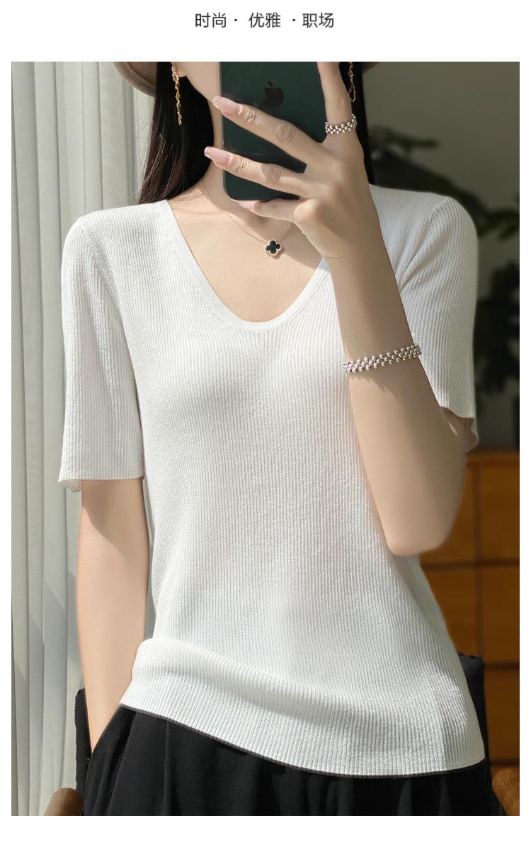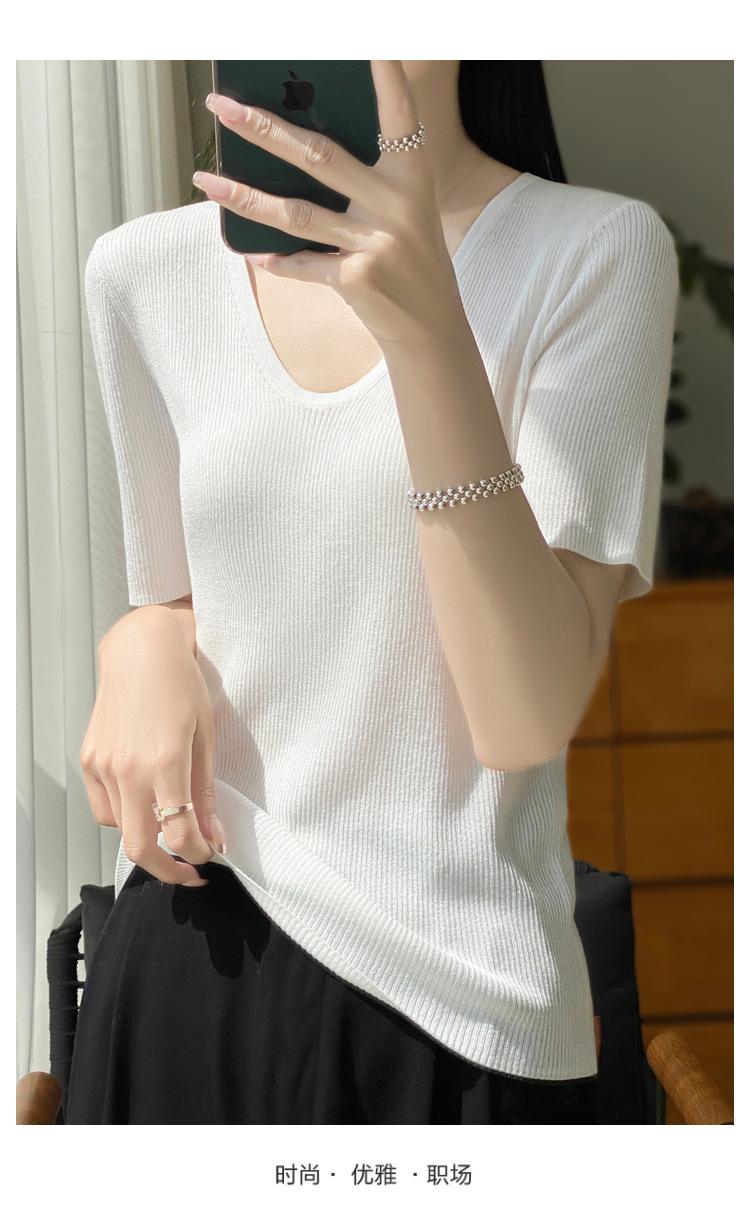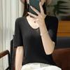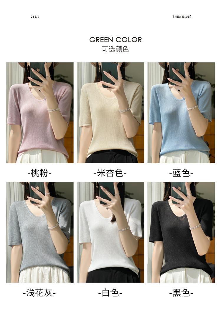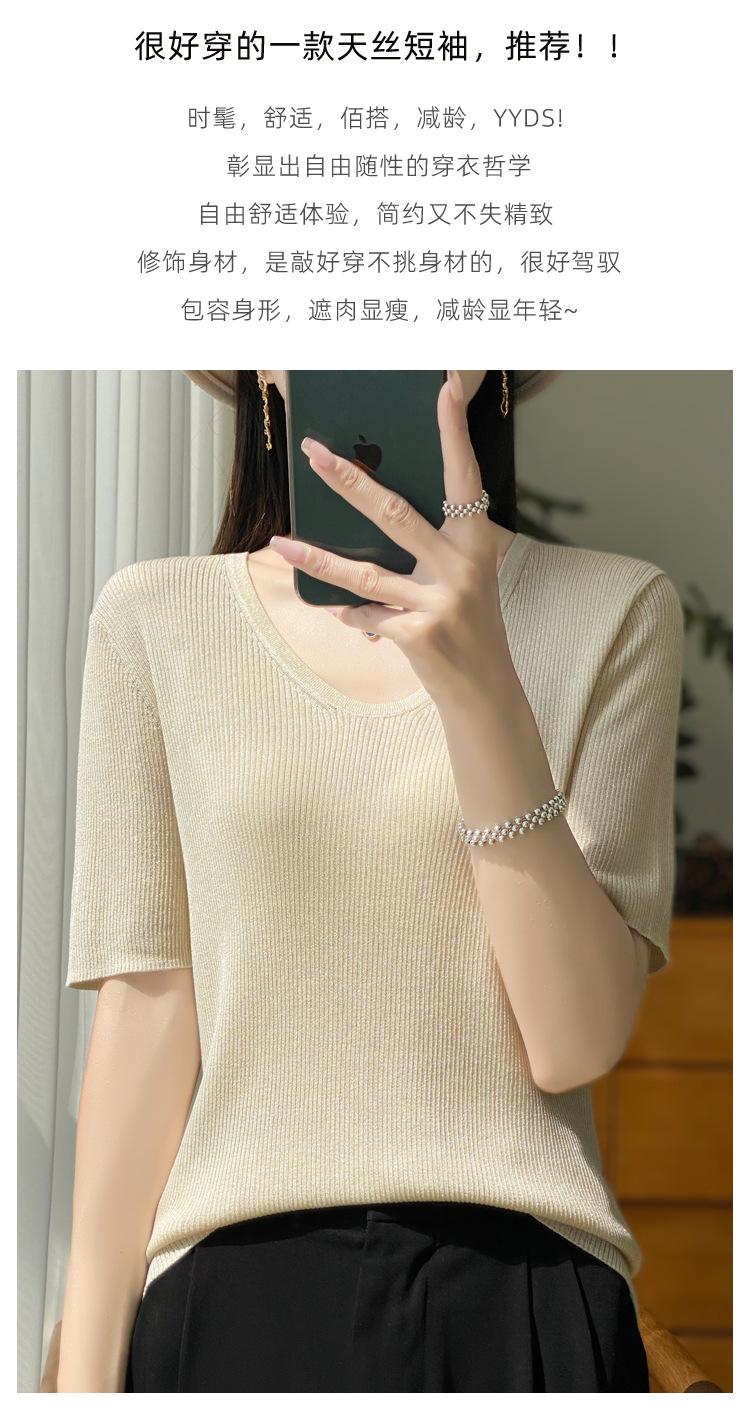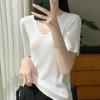 Primavera/Verano 2024 Nueva camiseta de manga corta de Tencel con cuello en U, color sólido, camisa tejida, top delgado elegante para mujer
