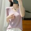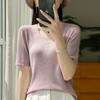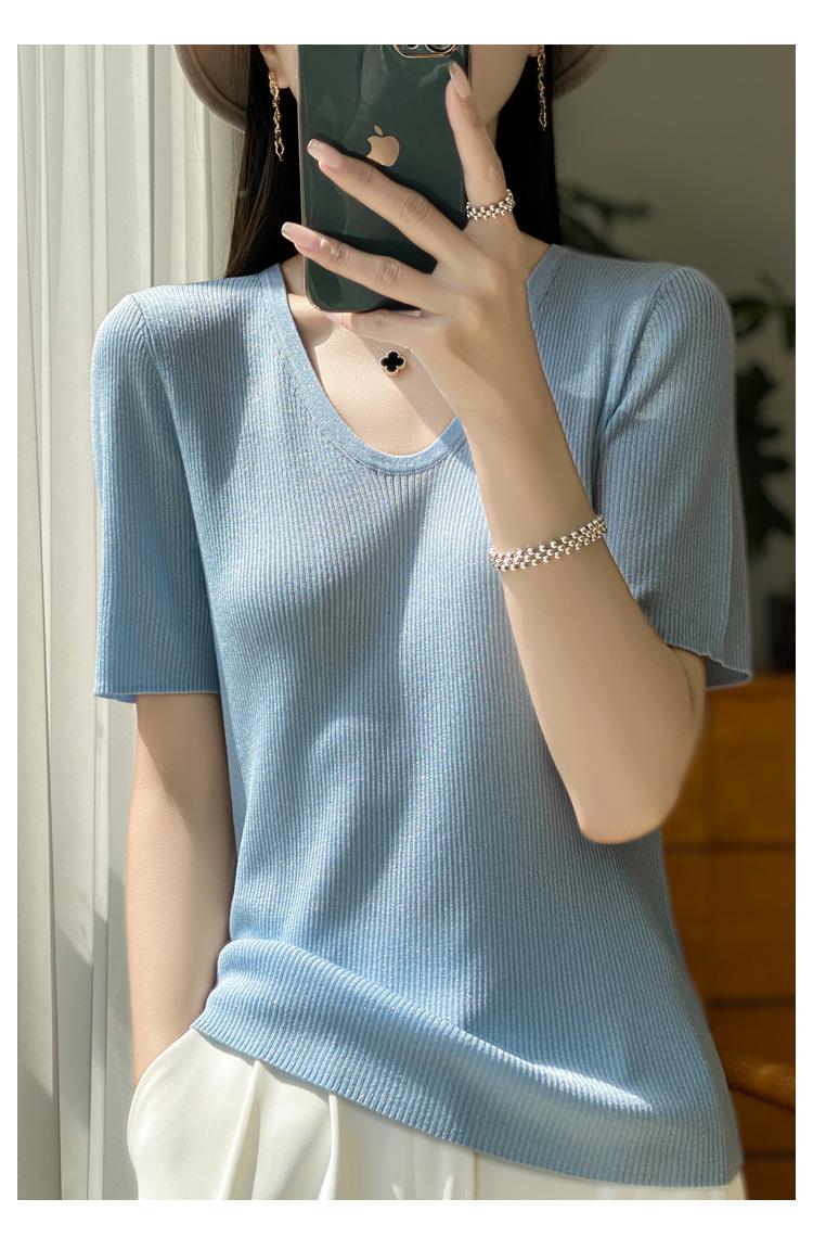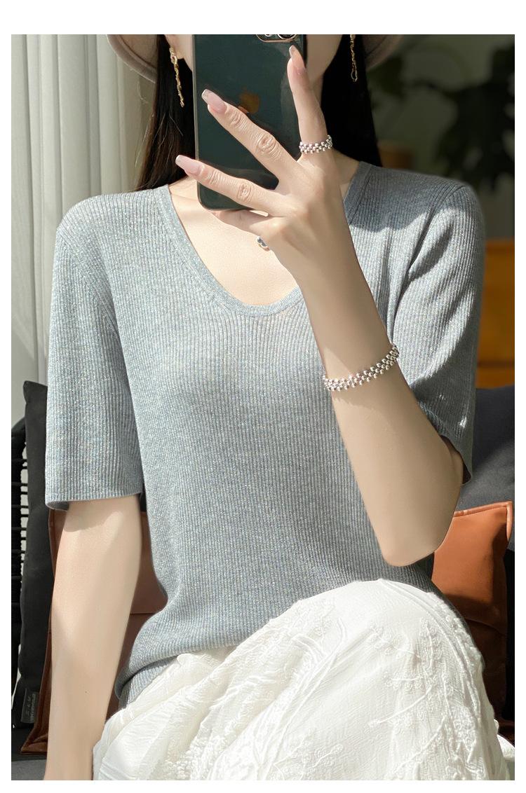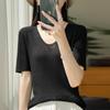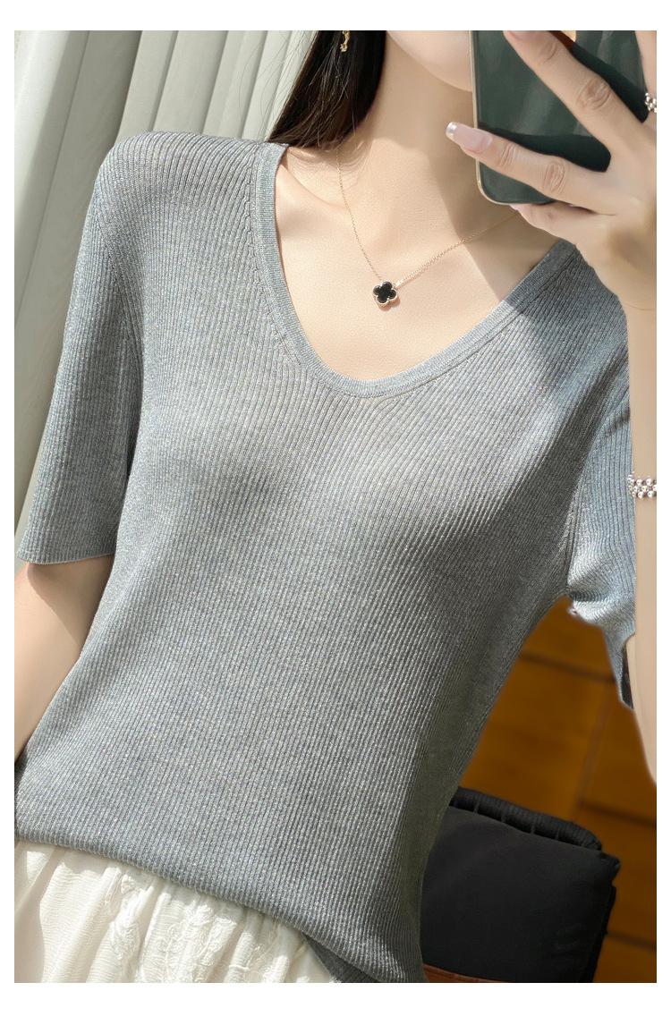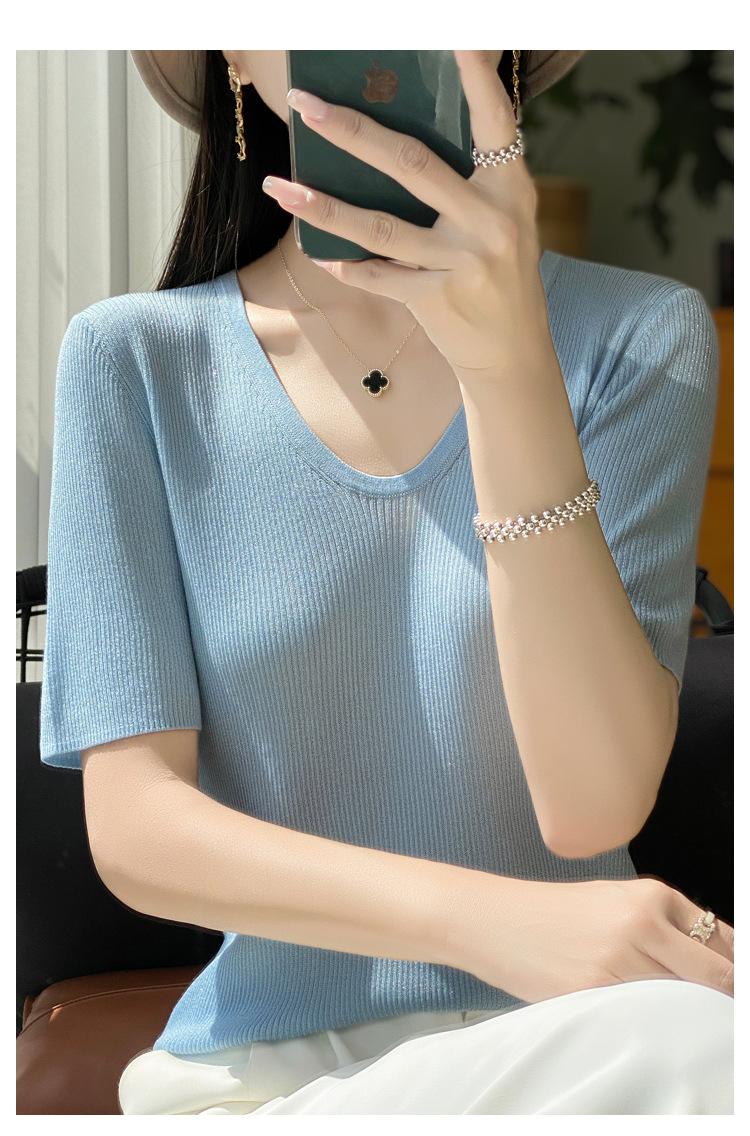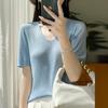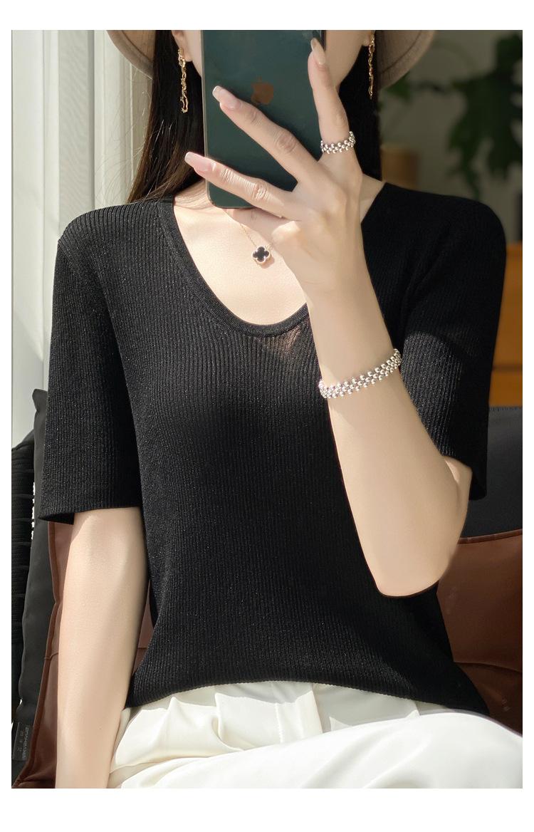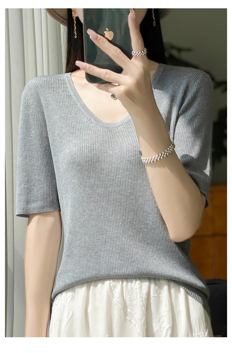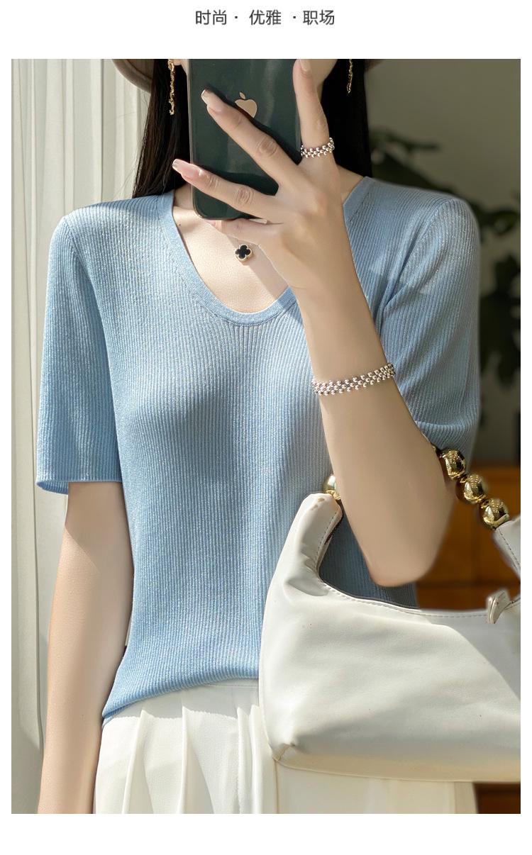 Primavera/Verano 2024 Nueva camiseta de manga corta de Tencel con cuello en U, color sólido, camisa tejida, top delgado elegante para mujer