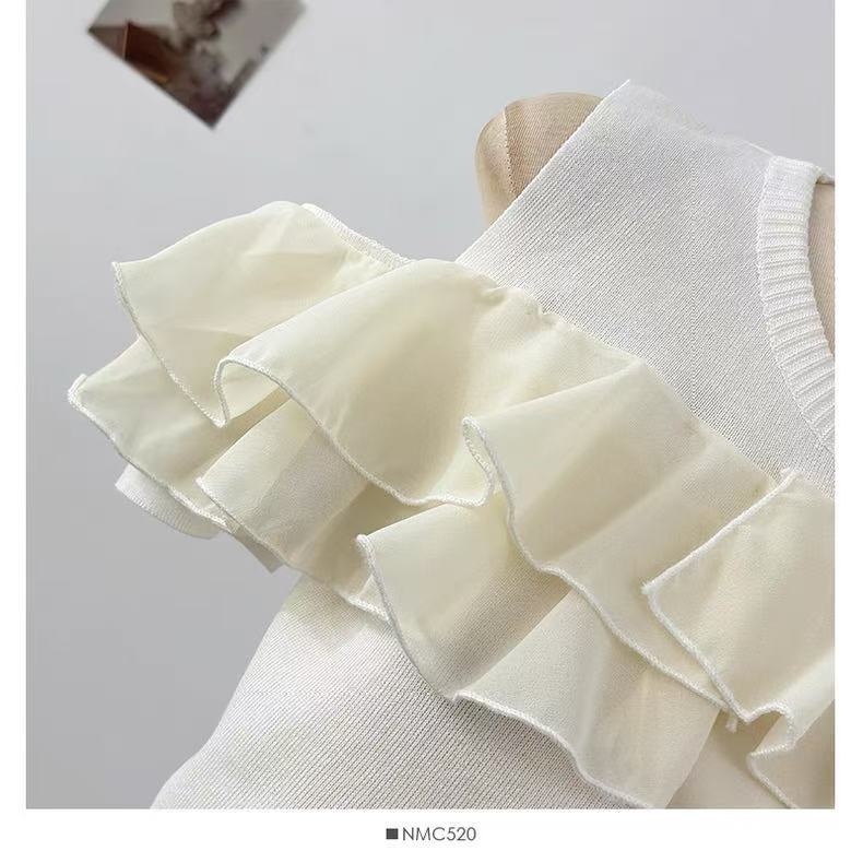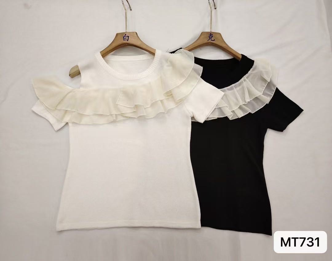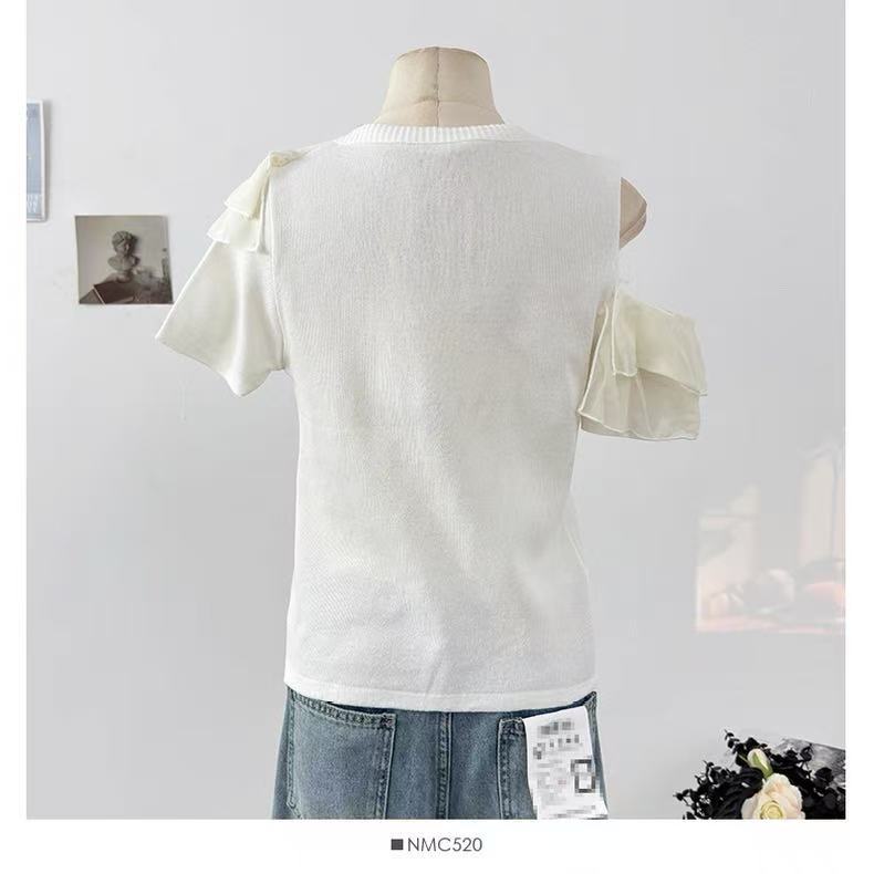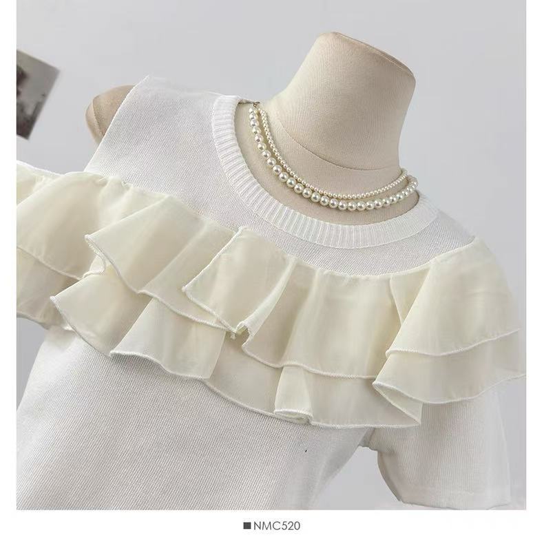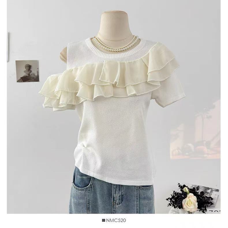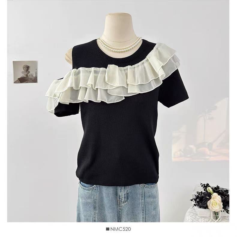 Playera de Manga Corta con Cuello Redondo y Bloque de Color Irregular con Volantes para Mujer Verano 2026 Temperamento de Alta Gama Top Adelgazante