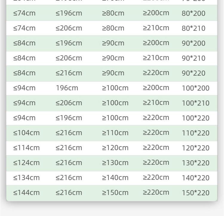 70*200, 70*210, 75*200, 75*210, 80*200, 80*205, 80*210, 85*200, 85*205, 85*210, 90*200, 90*205, 90*210, 90*220...