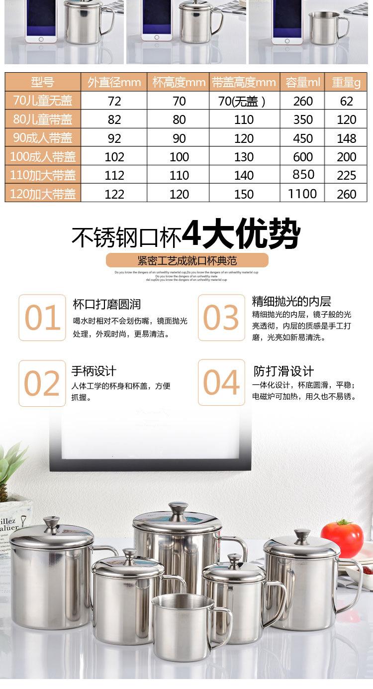 | Vaso bucal de acero inoxidable 304 | 304KB-09 | 9cm con tapa | 9,6 cm | 9 cm | 9 cm | 12 centímetros | 158 gramos | 144 piezas/caja |