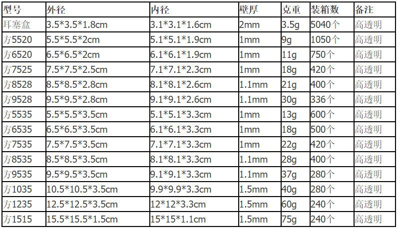 3.5*3.5*1.8cm (earplug box), 4.5*4.5*2cm, 5.5*5.5*2cm, 5.5*5.5*3.5cm, 6.5*6.5*2cm, 6.5*6.5*3.5cm, 7.5*7.5*2.5c...