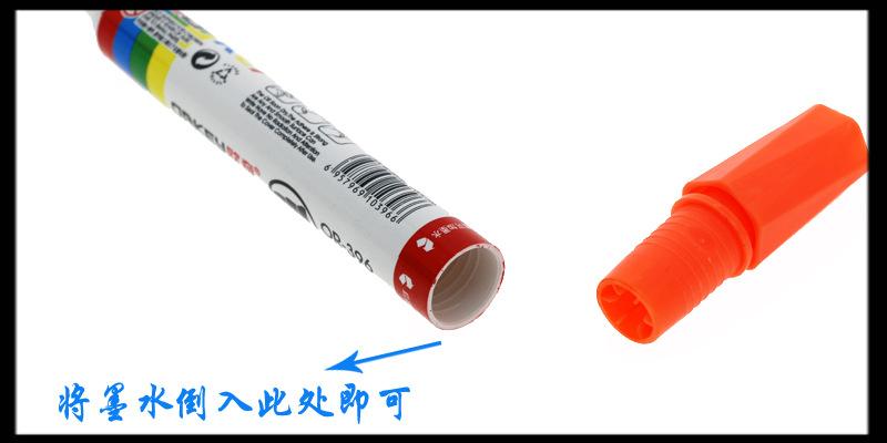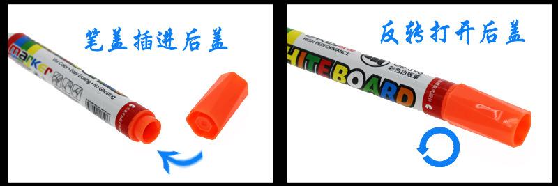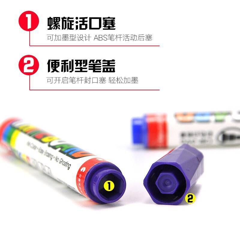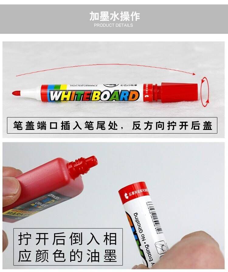 Consejos amables:Este modelo es un marcador de pizarra recargable, al recargar, debe hacerse cuando la punta no esté seca, es decir, cuando sienta que casi se está acabando, ¡puede añadir tinta! Recuerde volver a colocar la tapa firmemente cuando no esté en uso, de lo contrario, la tinta se evaporará fácilmente, lo que provocará que la punta se seque y se vuelva inutilizable.