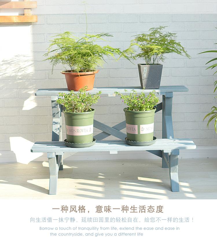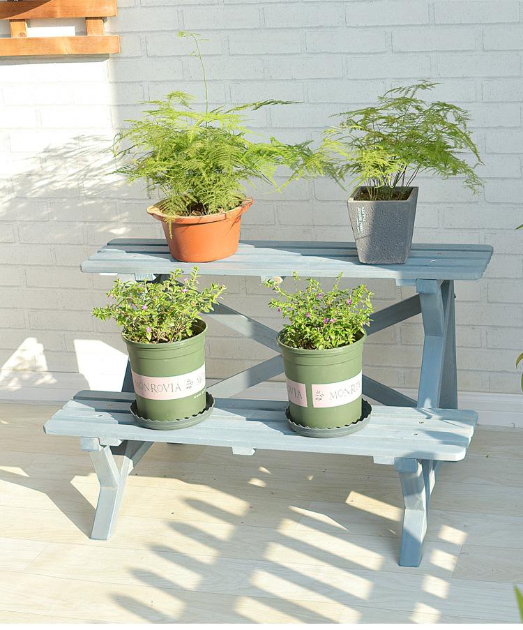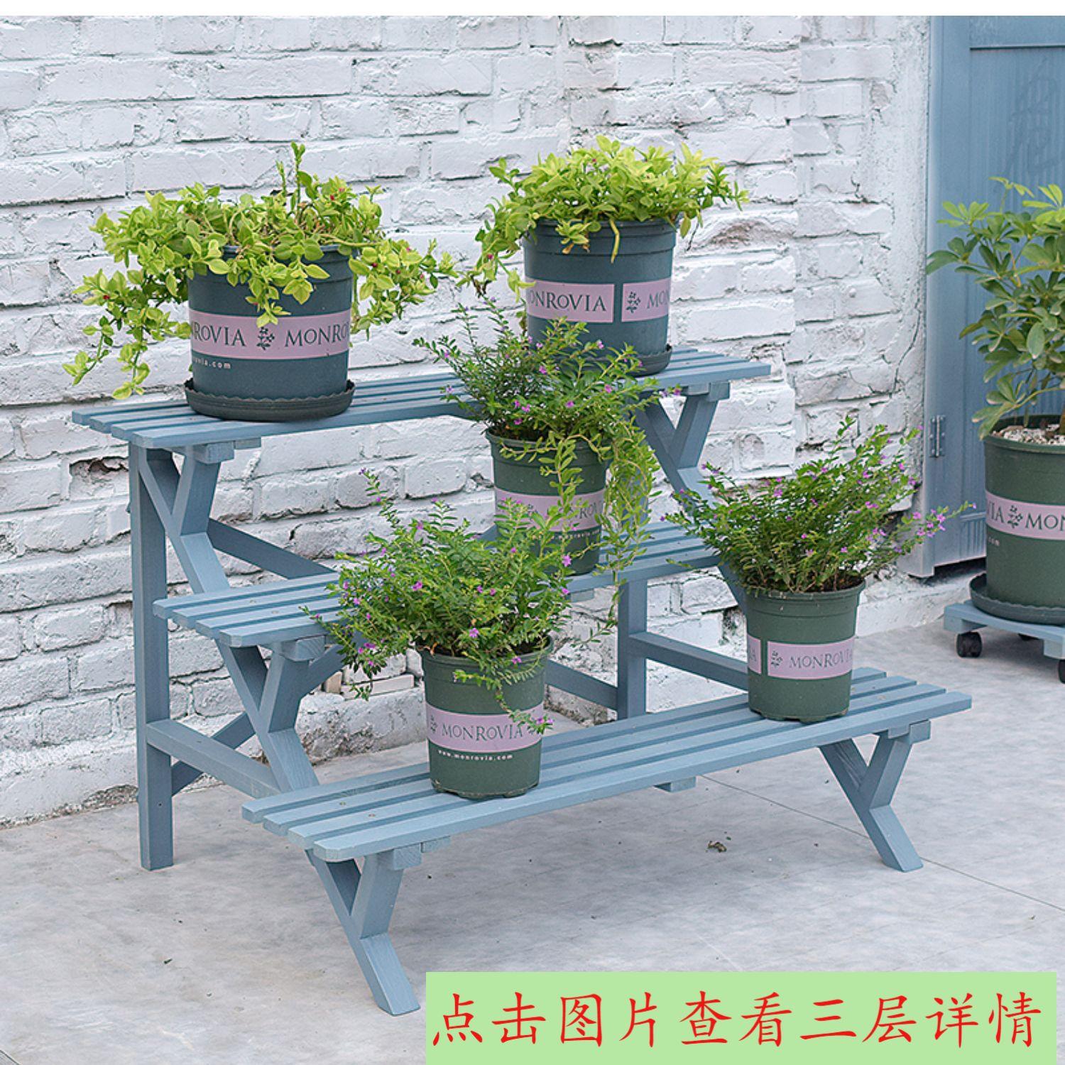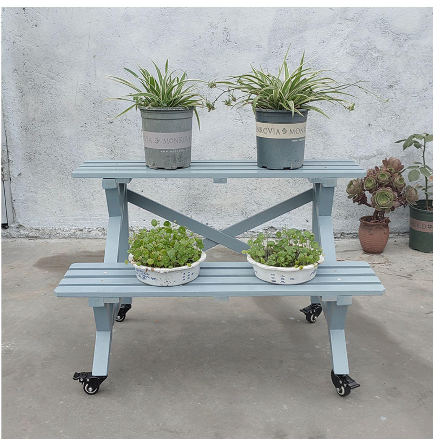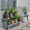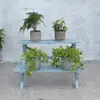Soporte para Flores de Madera Maciza Azul Retro de Dos Pisos Escalonado al por Mayor Balcón Patio Exterior Impermeable y Anticorrosivo Maceta de Pie