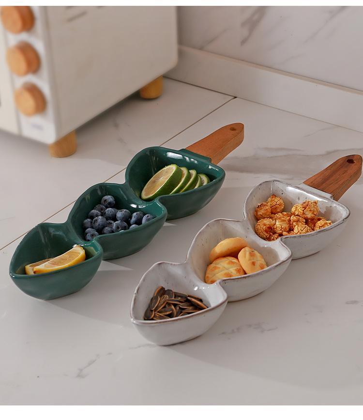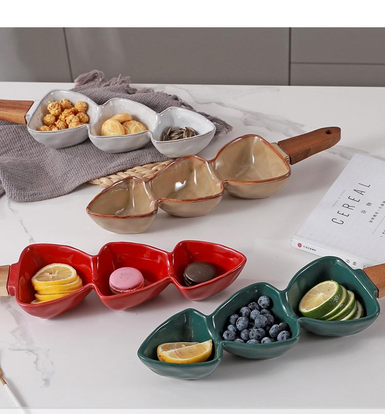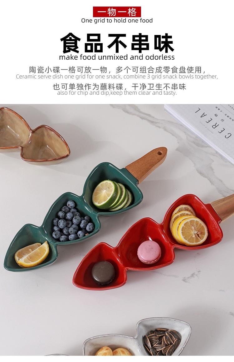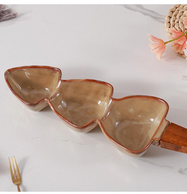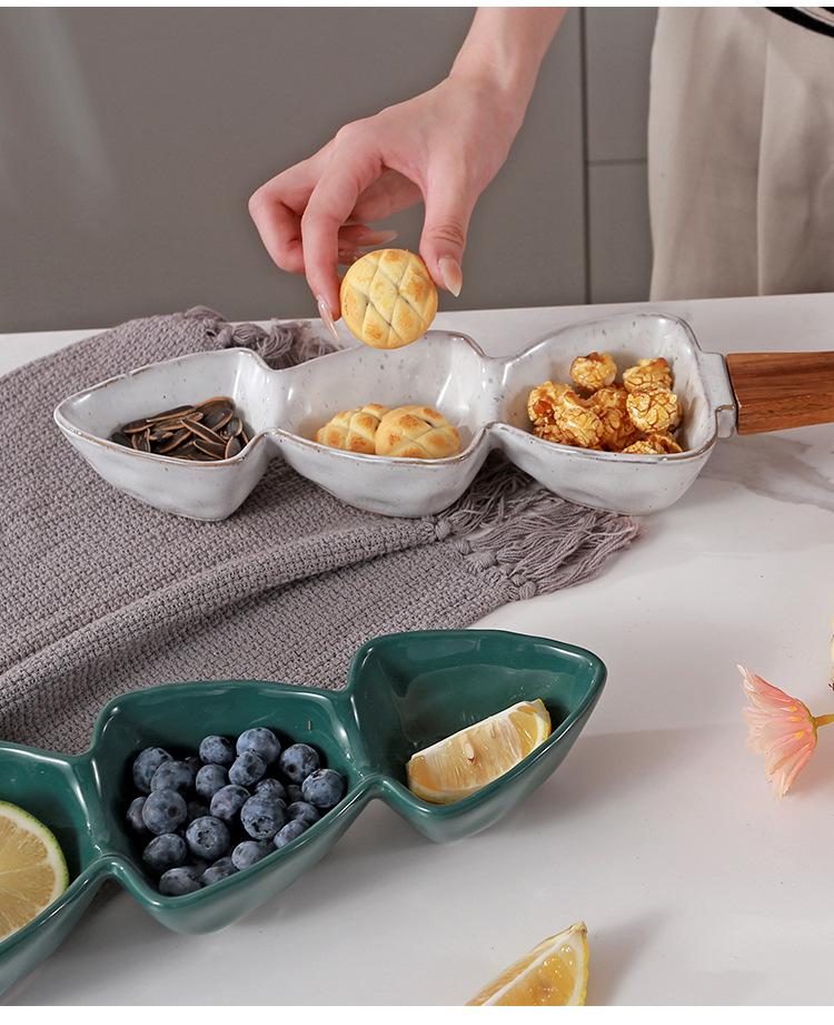 Nuevo Plato Dividido de Cerámica Creativo para Uso Doméstico con Asa de Madera Plato de Cerámica para Frutos Secos Productos de Cerámica Navideños