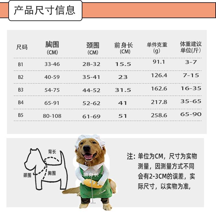 1. Este es un disfraz de transformación de chef. Tejido de cristal supersuave. 100% poliéster. Muy suave. Viene como un conjunto con un sombrero. 2. Pueden usarlo perros pequeños, medianos y grandes. Los gatos también pueden usarlo. La mayoría de los gatos eligen B1. Este estilo se basa principalmente en los datos de la longitud frontal. Las circunferencias de pecho y cuello tienen diseños de atar, lo que permite ajustar la talla. Es adecuado para varios tipos de gatos y perros, en su mayoría. Teddy, Pomerania, Chihuahua, Bichón Frisé, Maltés, Yorkshire Terrier, Shih Tzu, Shiba Inu, Bulldog Francés, Pug, Schnauzer, Corgi, Samoyedo, Golden Retriever, Labrador Retriever, Doberman Pinscher, Galgo, etc. Pueden usarlo perros que pesen entre 3 y 90 libras.