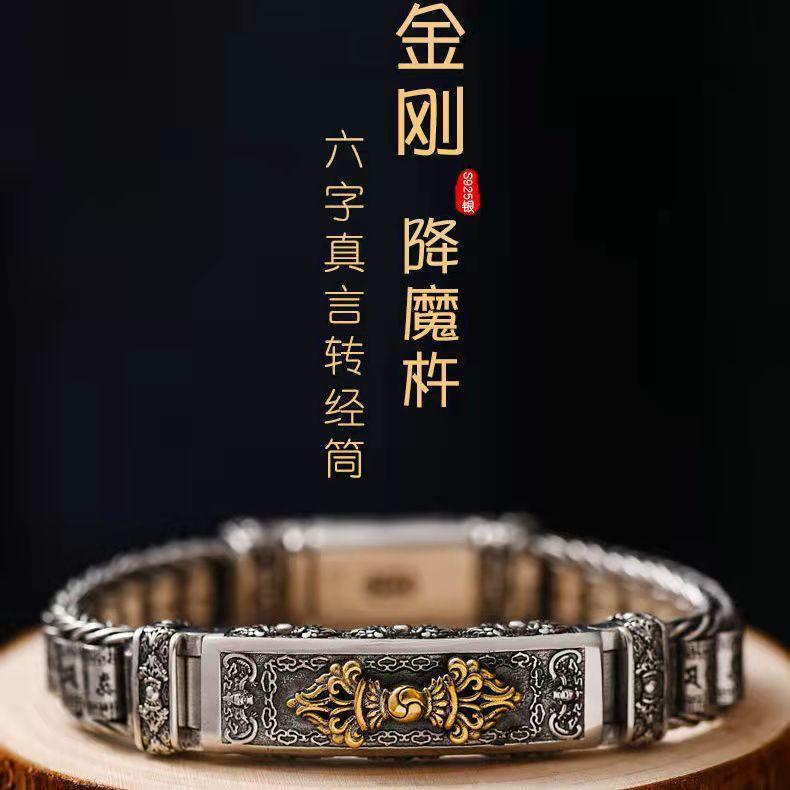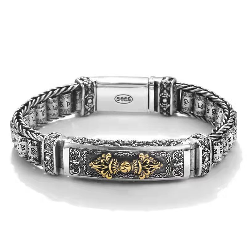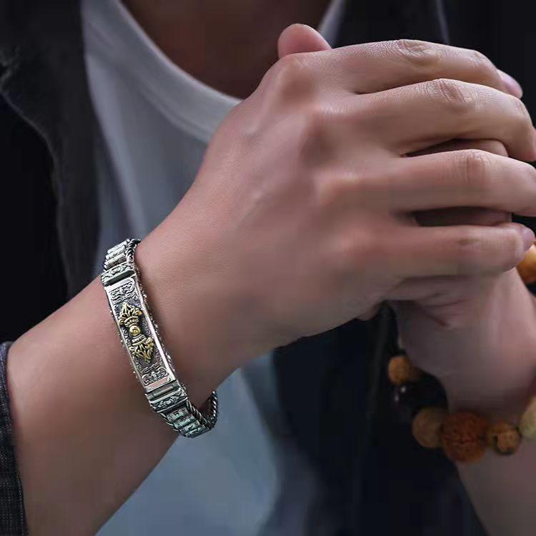 Pulsera de Moda Trendy para Hombre, Audaz y Trendy, Pulsera Vintage con Rueda de Oración Mantra de Seis Palabras, Gruesa y Grande