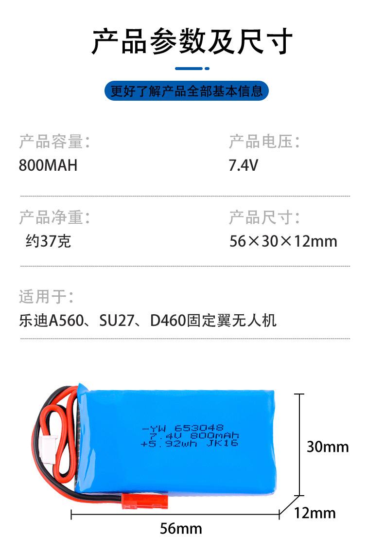 Batería de Litio 2S 7.4V 800MAh 20C para Avión Modelo Adecuada para A560 Ala Fija SU27 D460 Dron
