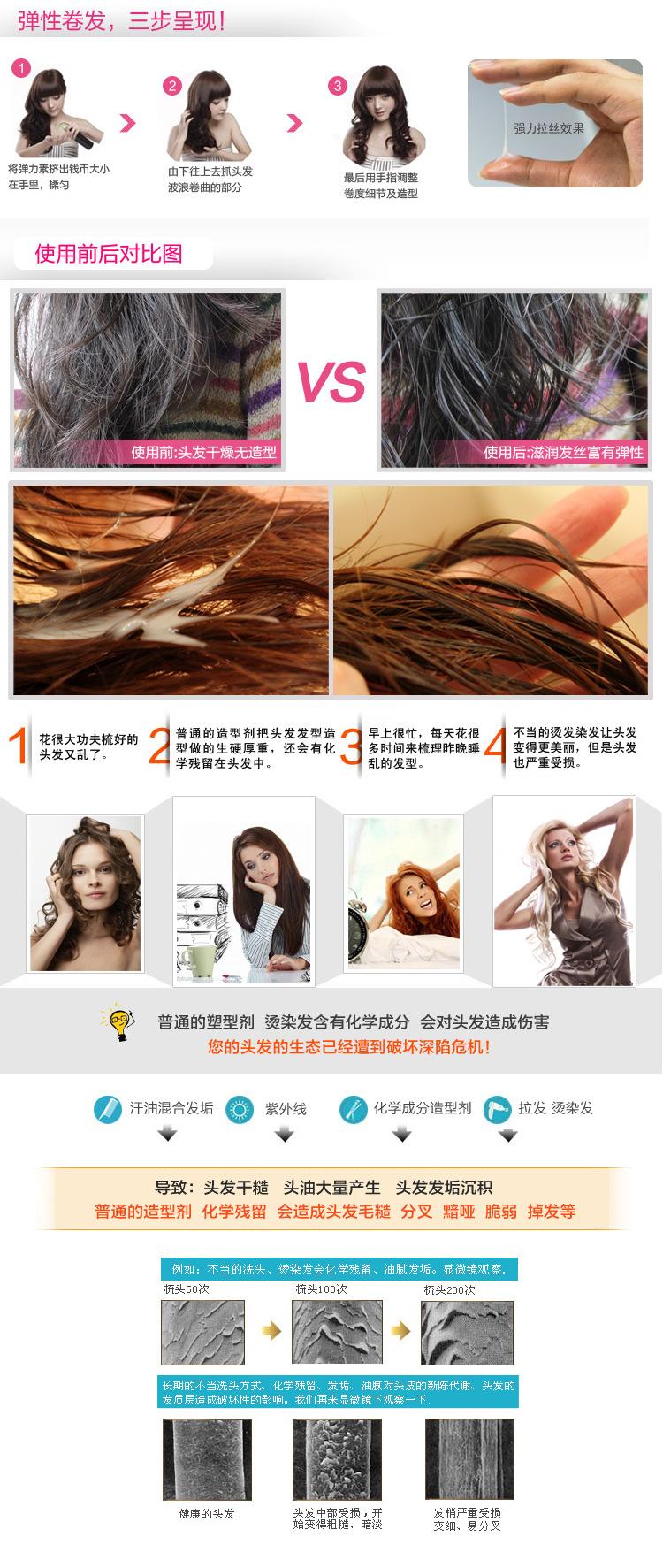 Look despeinado:Un buen producto para moldear la personalidad, con fuerte poder de fijación. Rocíe su cabello con agua limpia, exprima una cantidad apropiada de este producto en la palma de su mano, y podrá peinar su cabello. Es conveniente y sencillo, no graso, y no causará manchas blancas ni caspa.