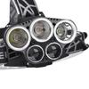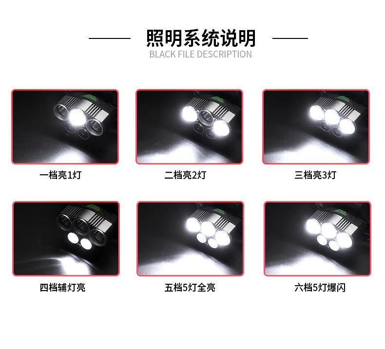 Función: 6 modos (1ª marcha enciende 1 luz, 2ª marcha enciende 2 luces, 3ª marcha enciende las 3 luces superiores, 4ª marcha enciende las 2 luces inferiores, 5ª marcha enciende las 5 luces, 6ª marcha estroboscópica) compartimento de batería advertencia de 2 marchas (luz roja, flash rojo) interfaz de carga directa por cable USB