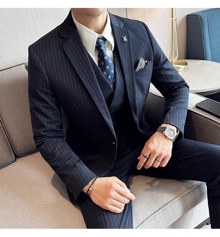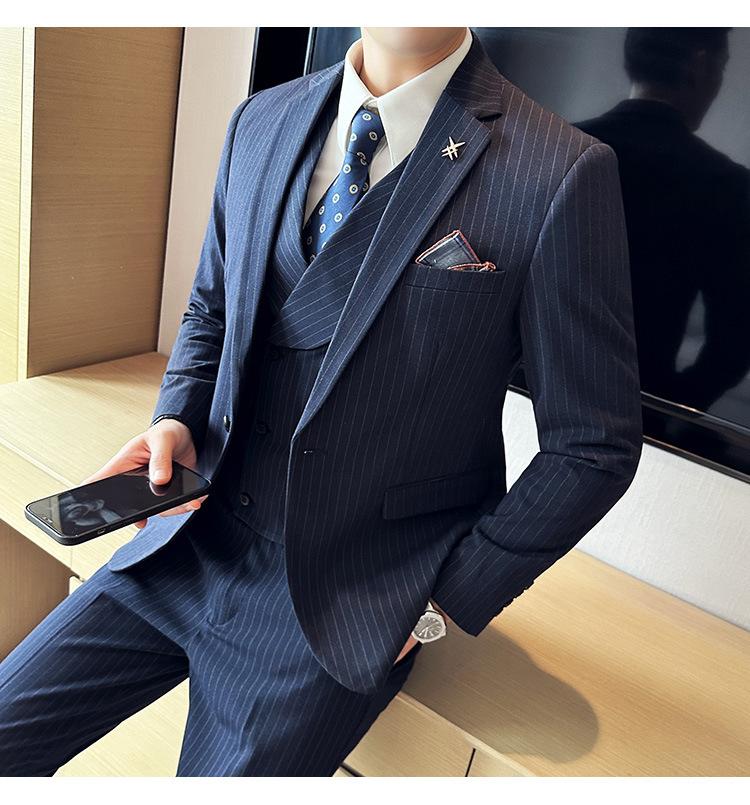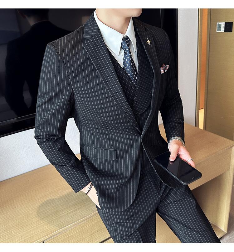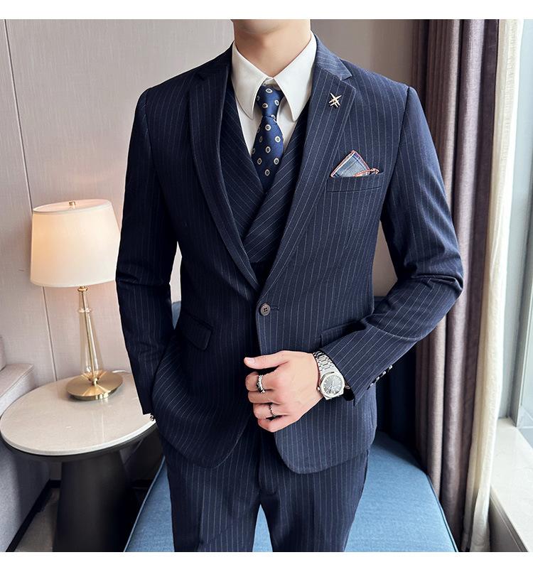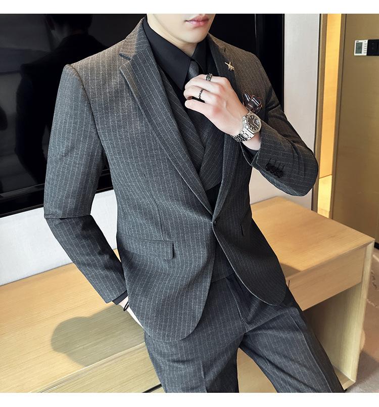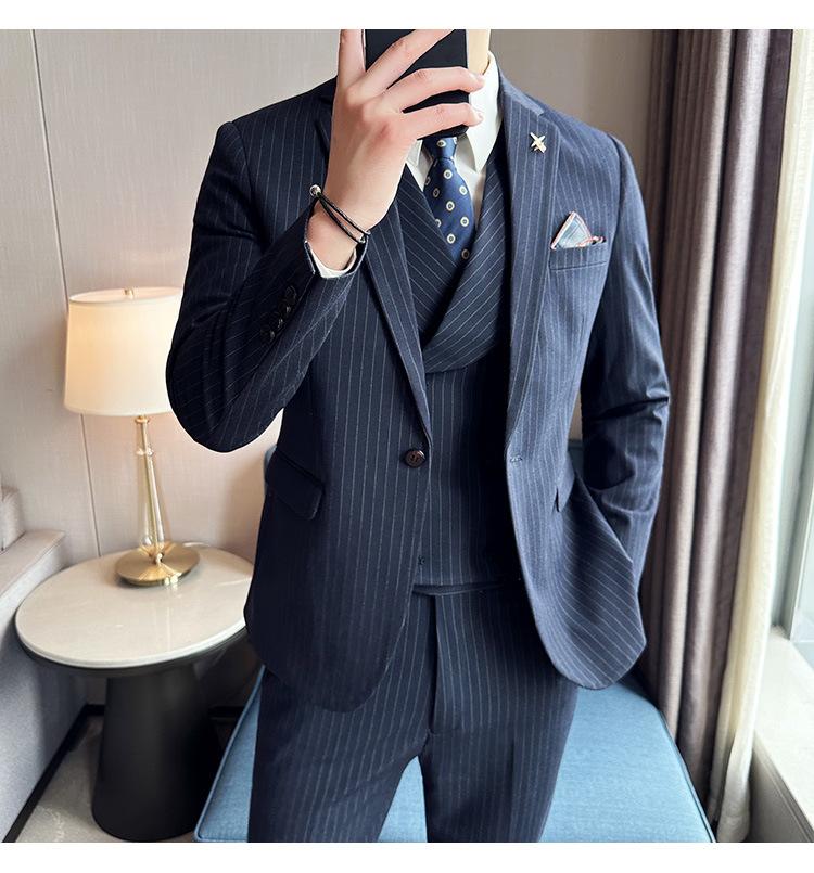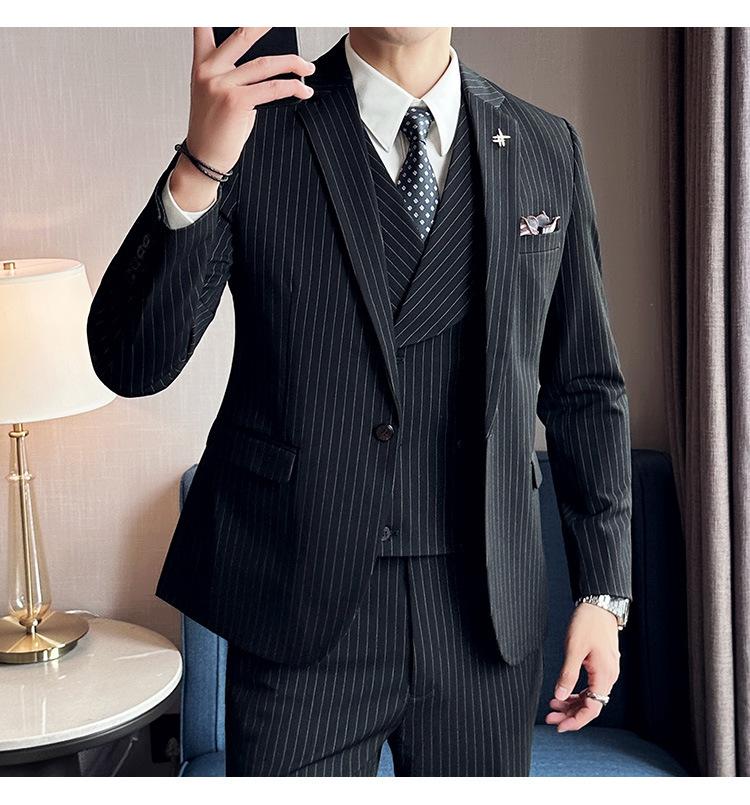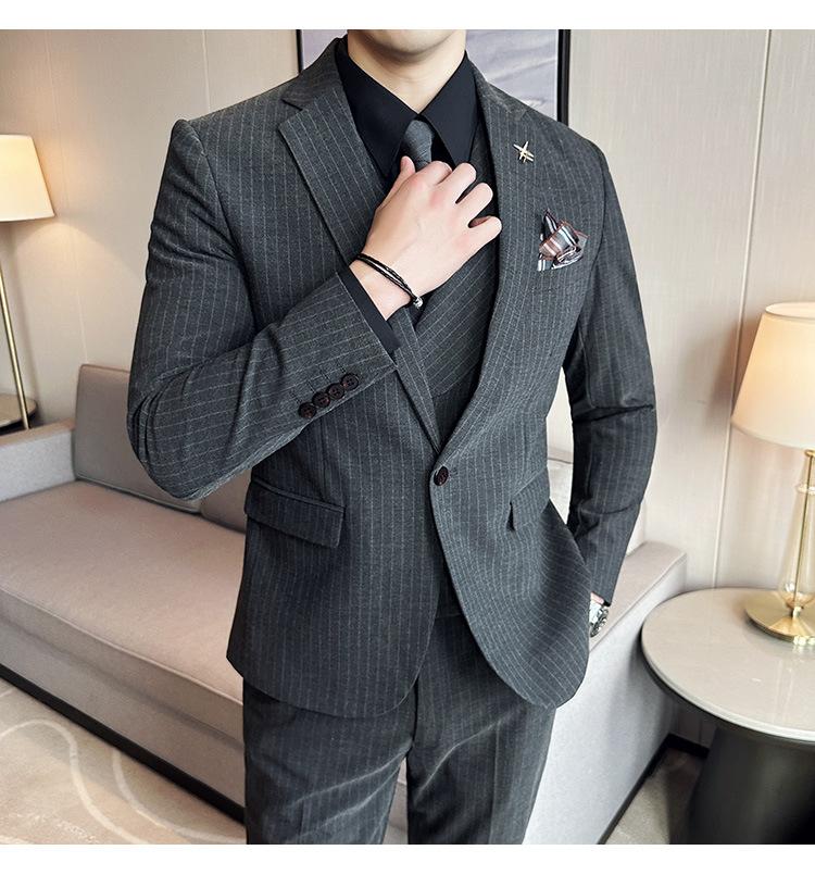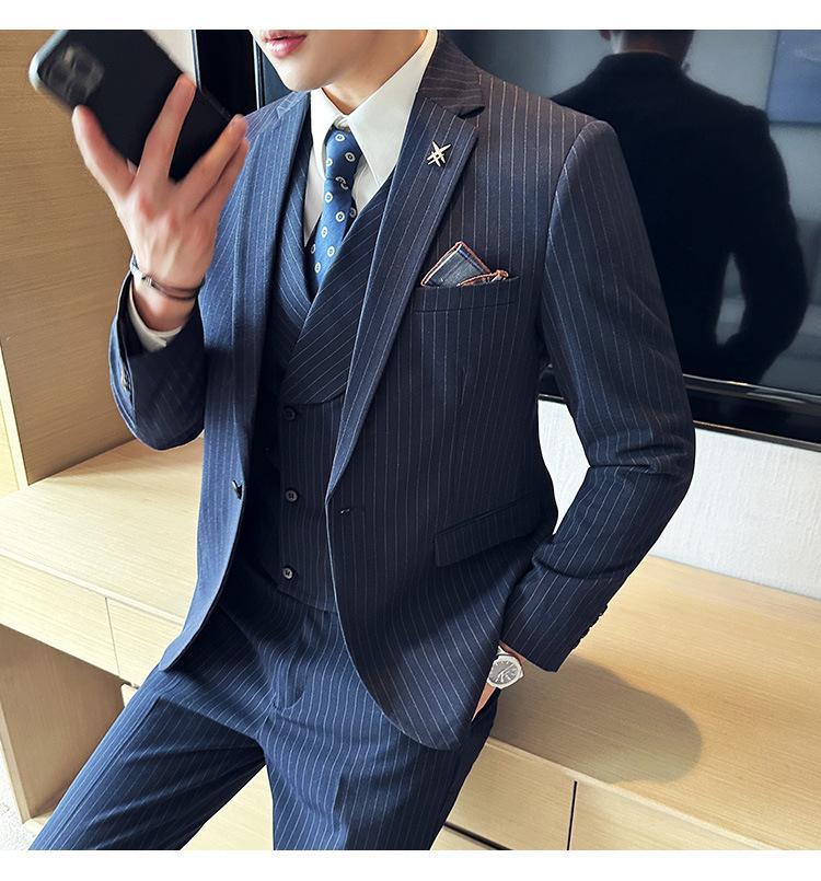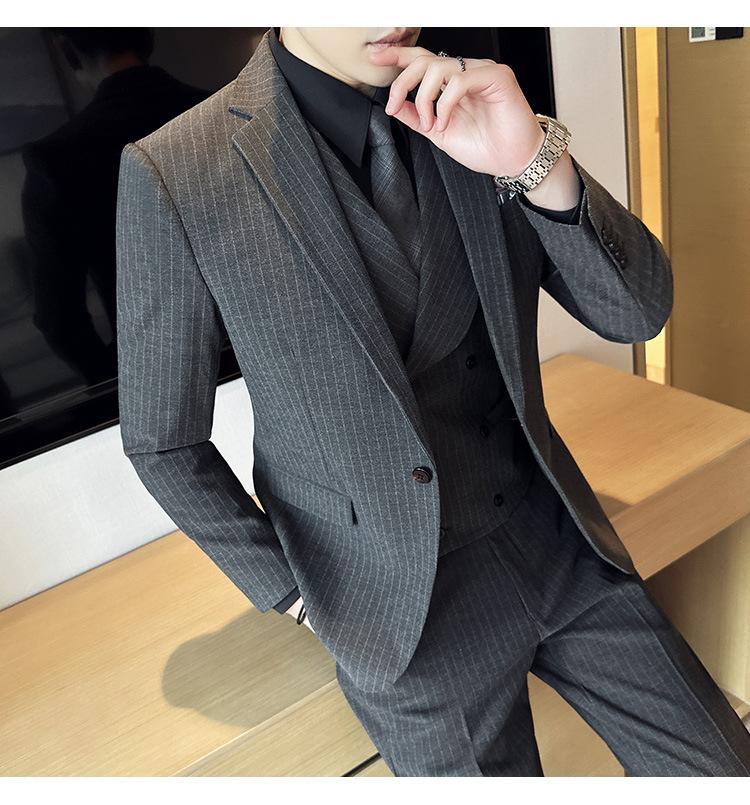 Traje de otoño 2023 para hombre, nuevo traje de tres piezas de estilo coreano para jóvenes, traje informal de negocios a rayas, traje ajustado para hombre