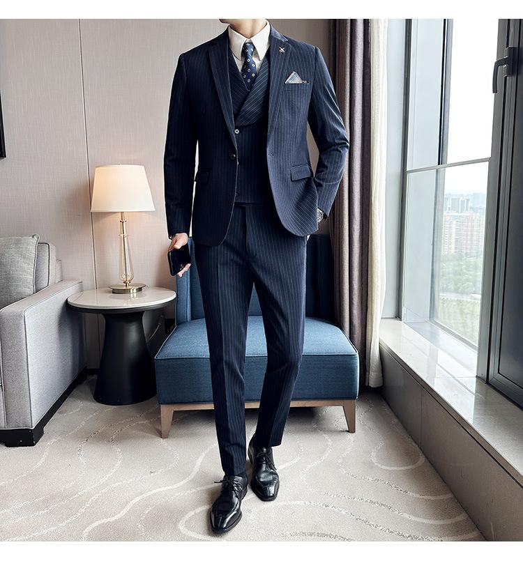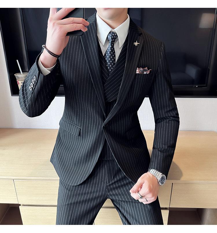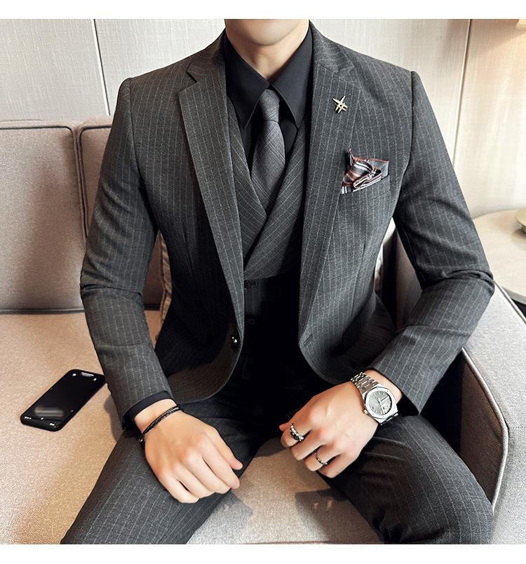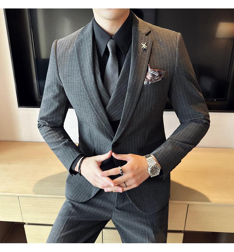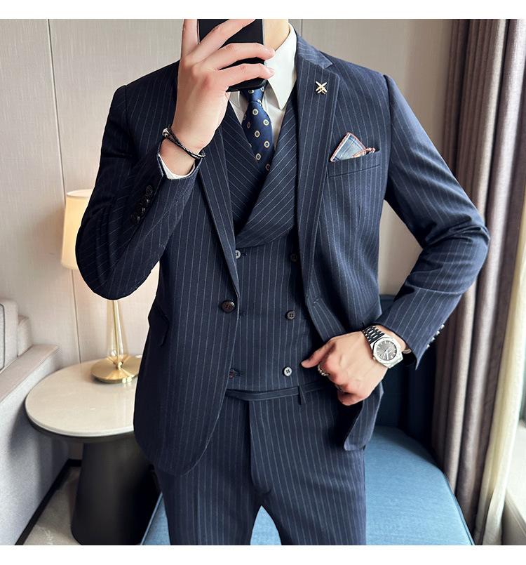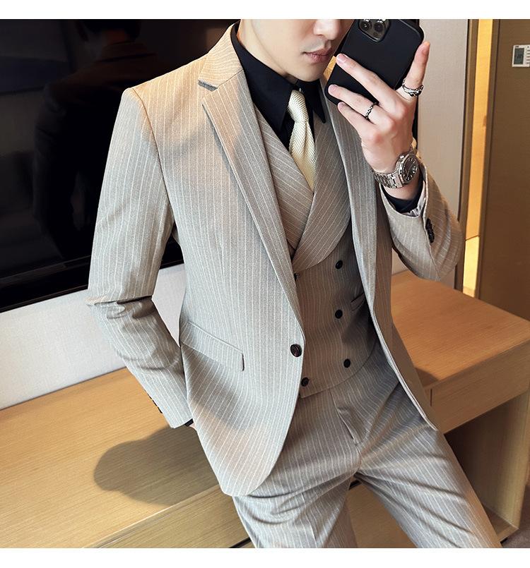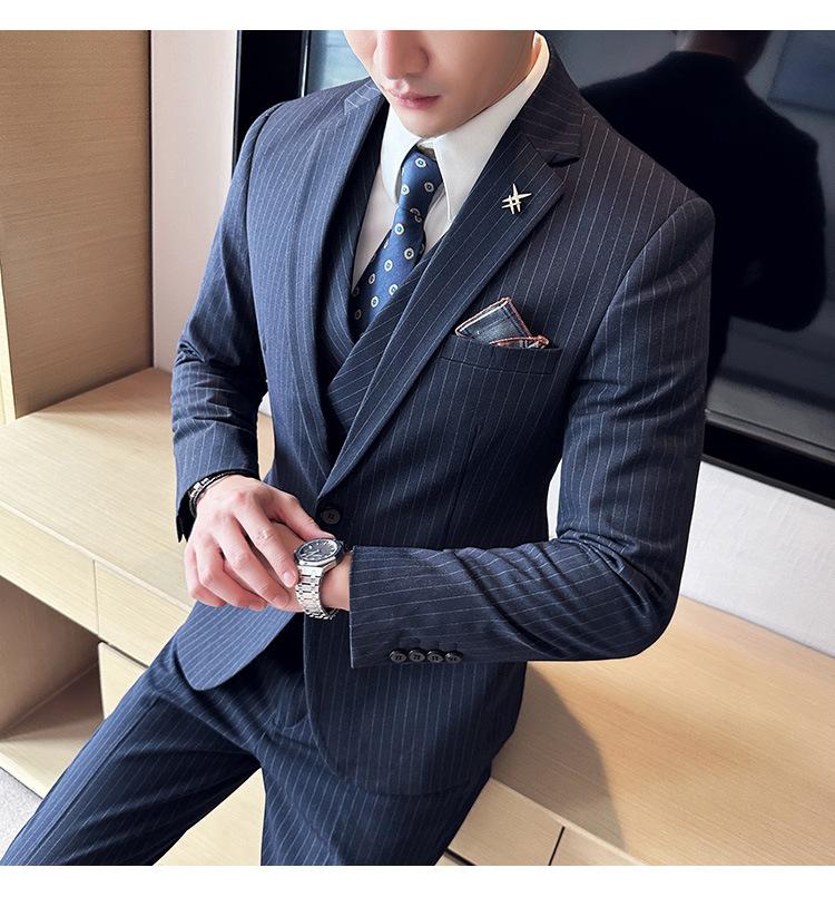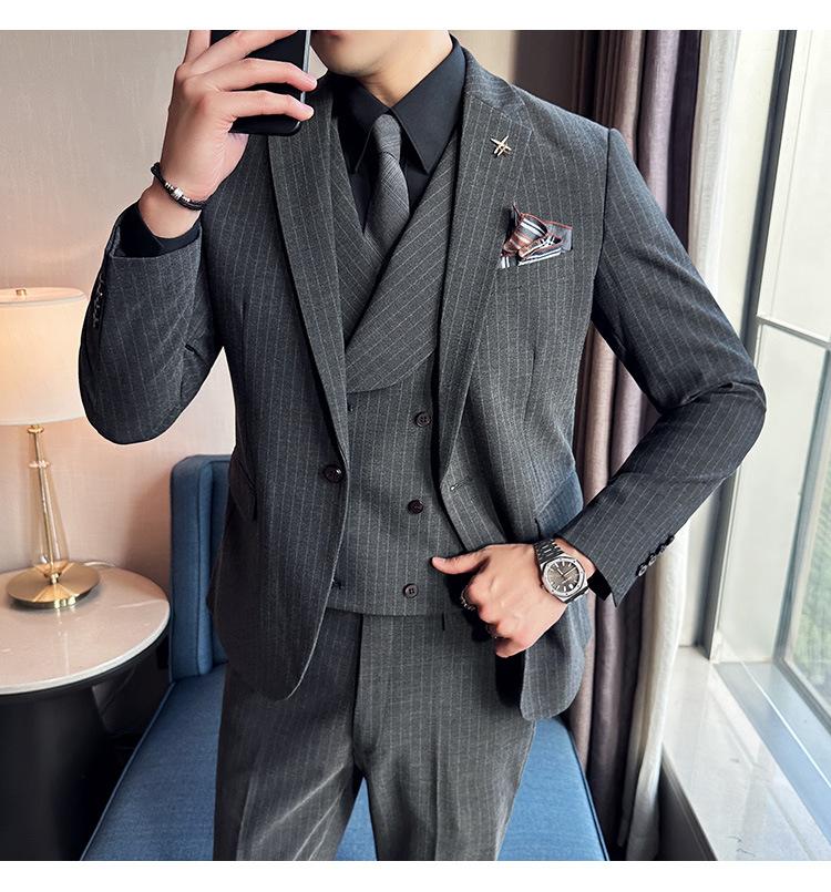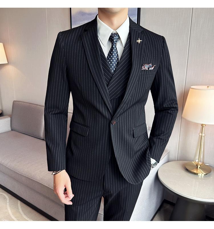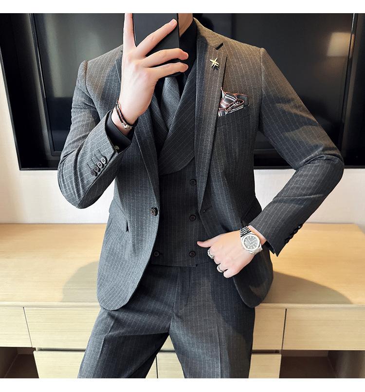Traje de otoño 2023 para hombre, nuevo traje de tres piezas de estilo coreano para jóvenes, traje informal de negocios a rayas, traje ajustado para hombre