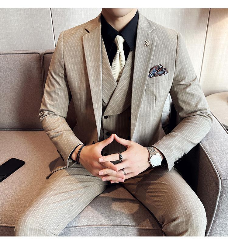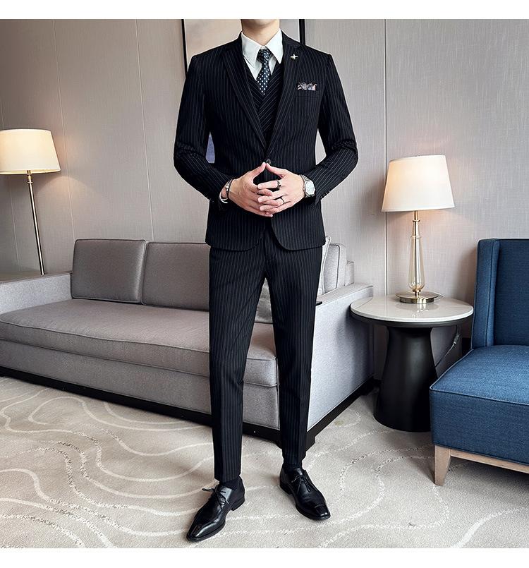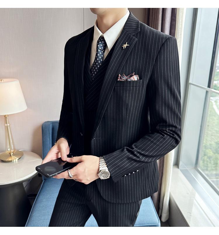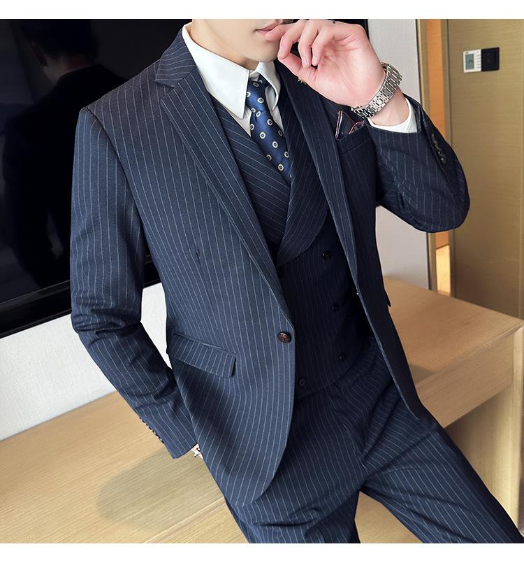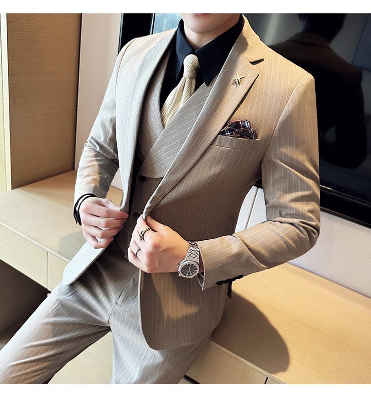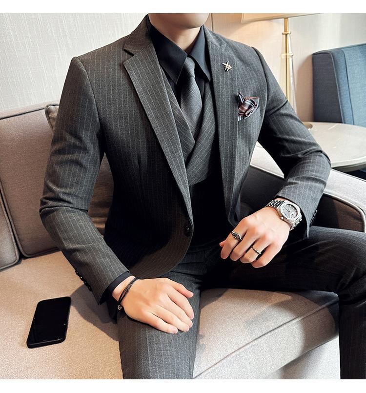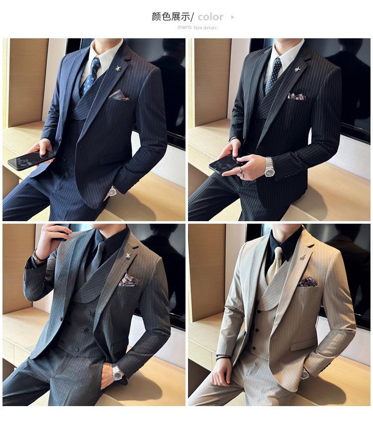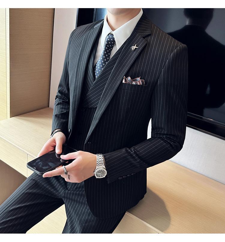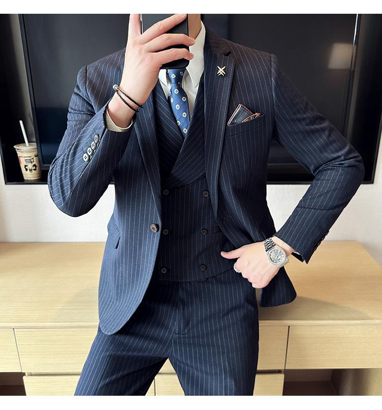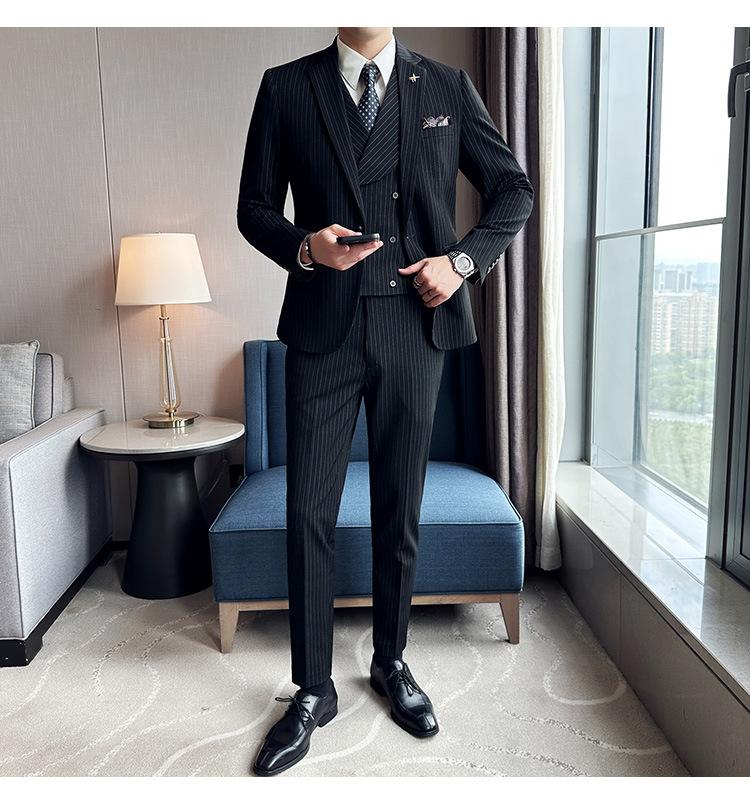 Traje de otoño 2023 para hombre, nuevo traje de tres piezas de estilo coreano para jóvenes, traje informal de negocios a rayas, traje ajustado para hombre