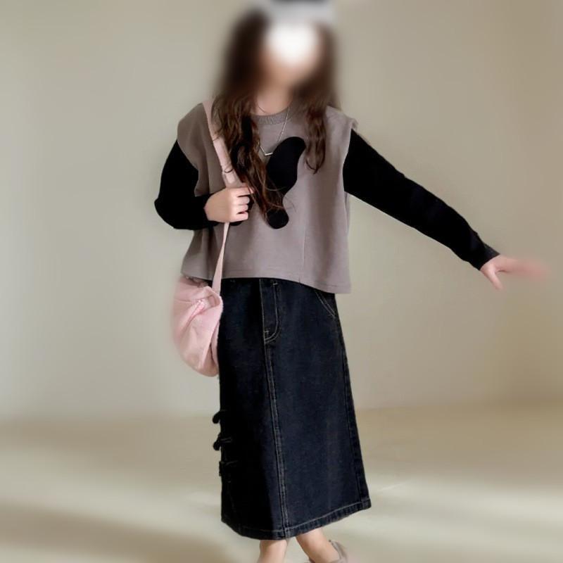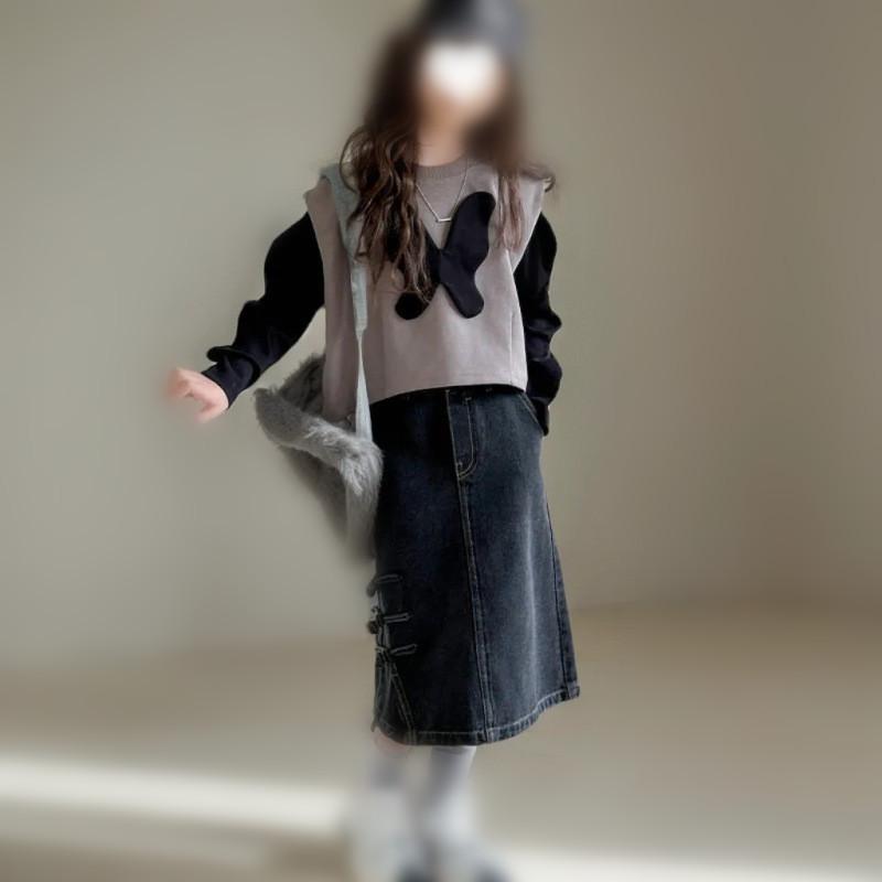 Compra Ropa para Niños al Mayoreo Conjunto para Niñas Otoño 2025 Nuevo Estilo Top de Dos Piezas Falso para Niños Más Falda Midi de Mezclilla Conjunto de Dos Piezas al por mayor en Joom.pro