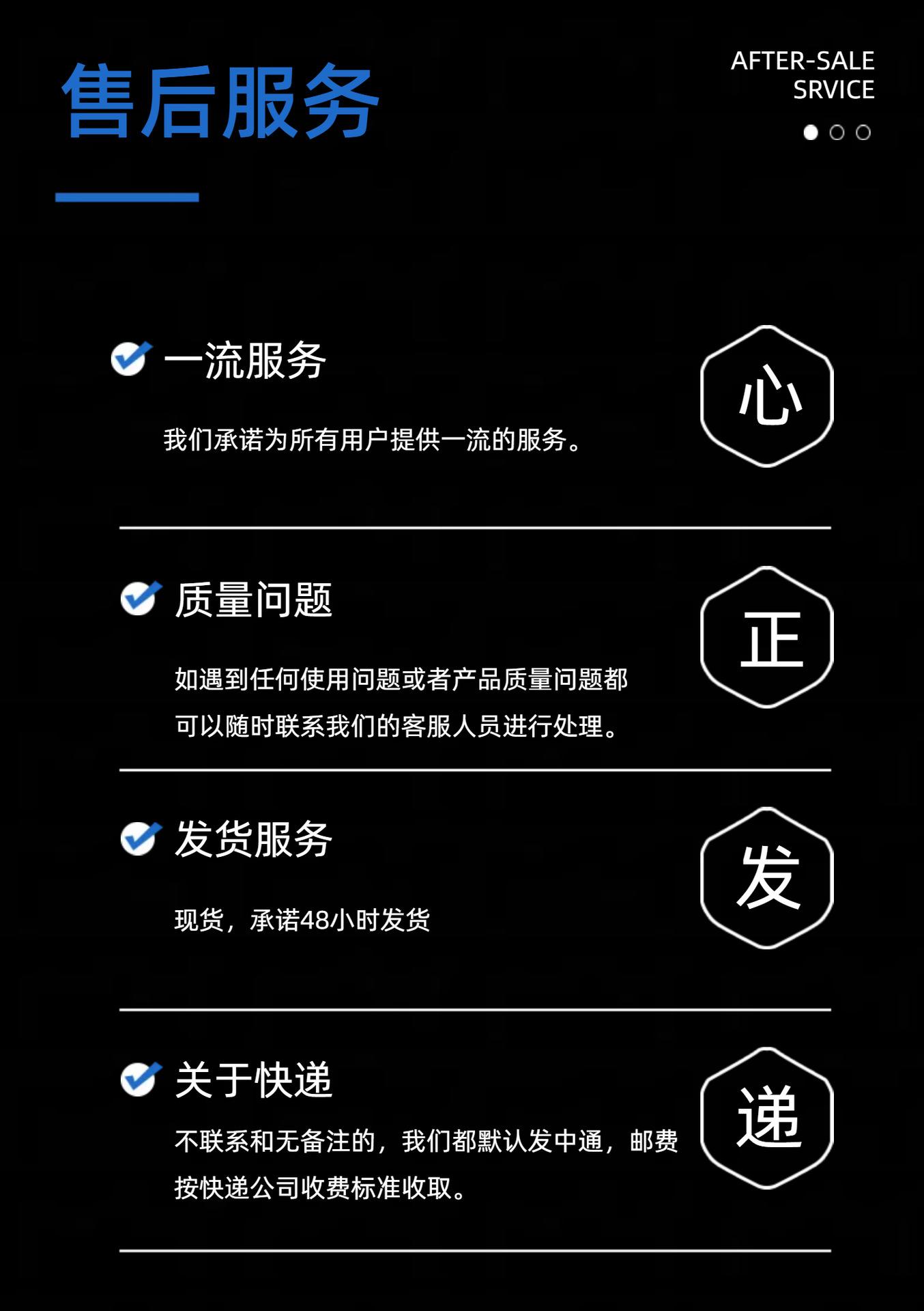 Acerca del servicio posventaSi nuestros productos son buenos y está satisfecho con nuestros servicios, por favor, denos una reseña positiva. Si tiene alguna pregunta, póngase en contacto con nuestro Wangwang a tiempo y negociaremos la mejor solución con usted. Por favor, comprenda nuestras dificultades y no haga comentarios al azar. ¡Muchas gracias!