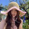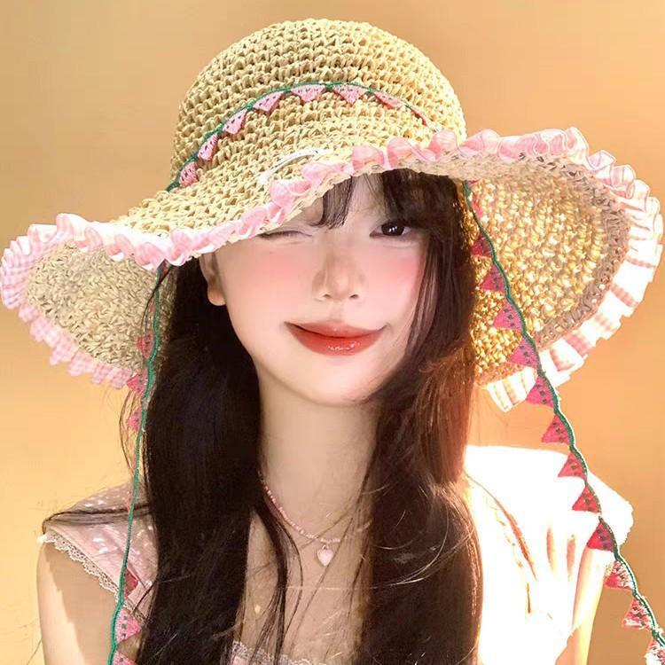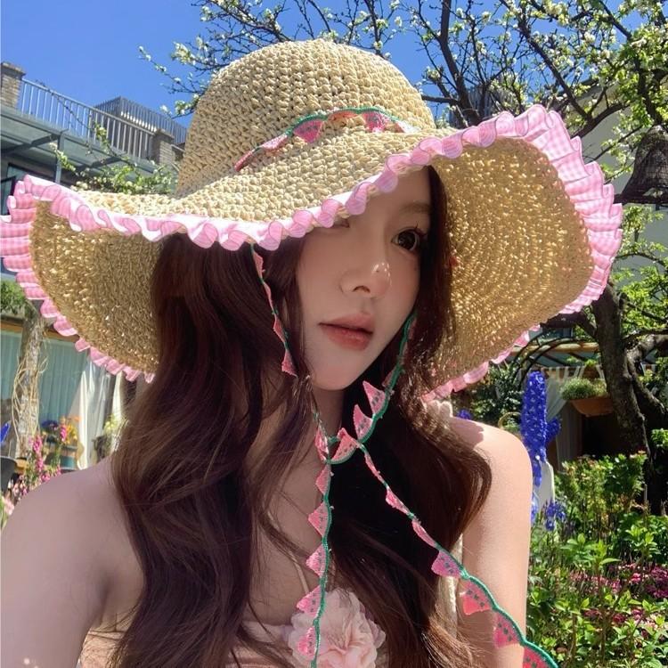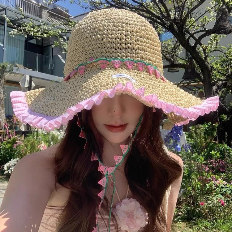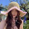 Vacaciones Junto al Mar Sombrero de Paja Trenzado con Flores Dulces con Recortes para Mujer Verano 2025 Nuevo Sombrero para el Sol Ala Ancha Sombrero de Protección Solar