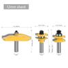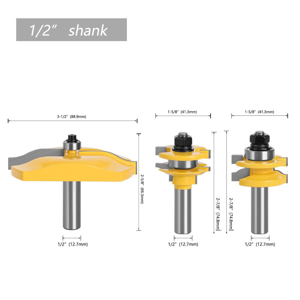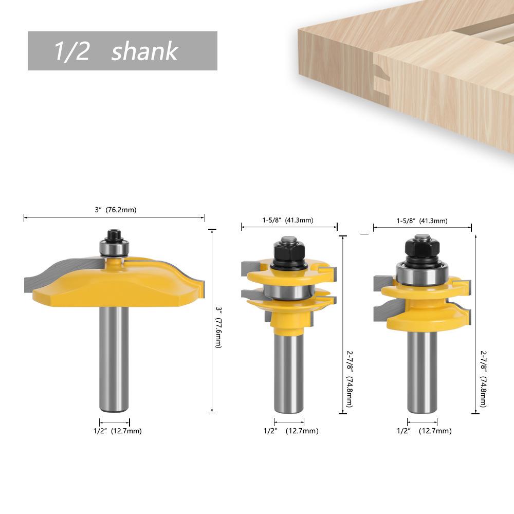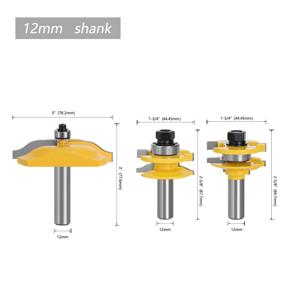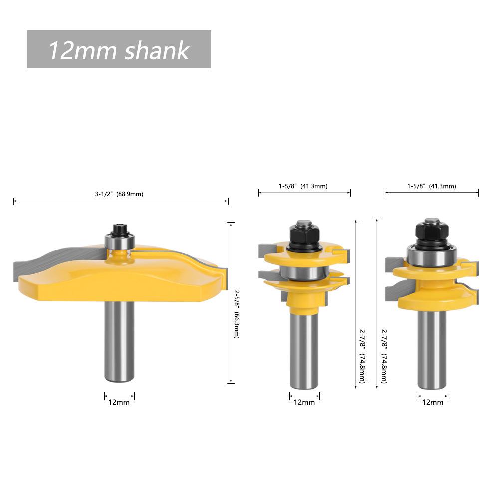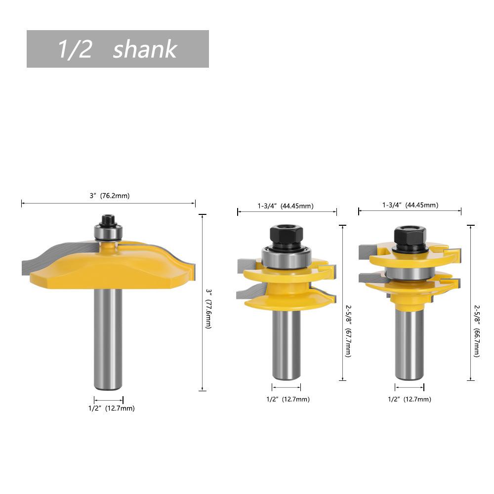 Los mangos de las fresas para carpintería son: 3 mm, 6 mm, 1/4" (6,35 mm), 8 mm, 12 mm, 1/2" (12,7 mm)
