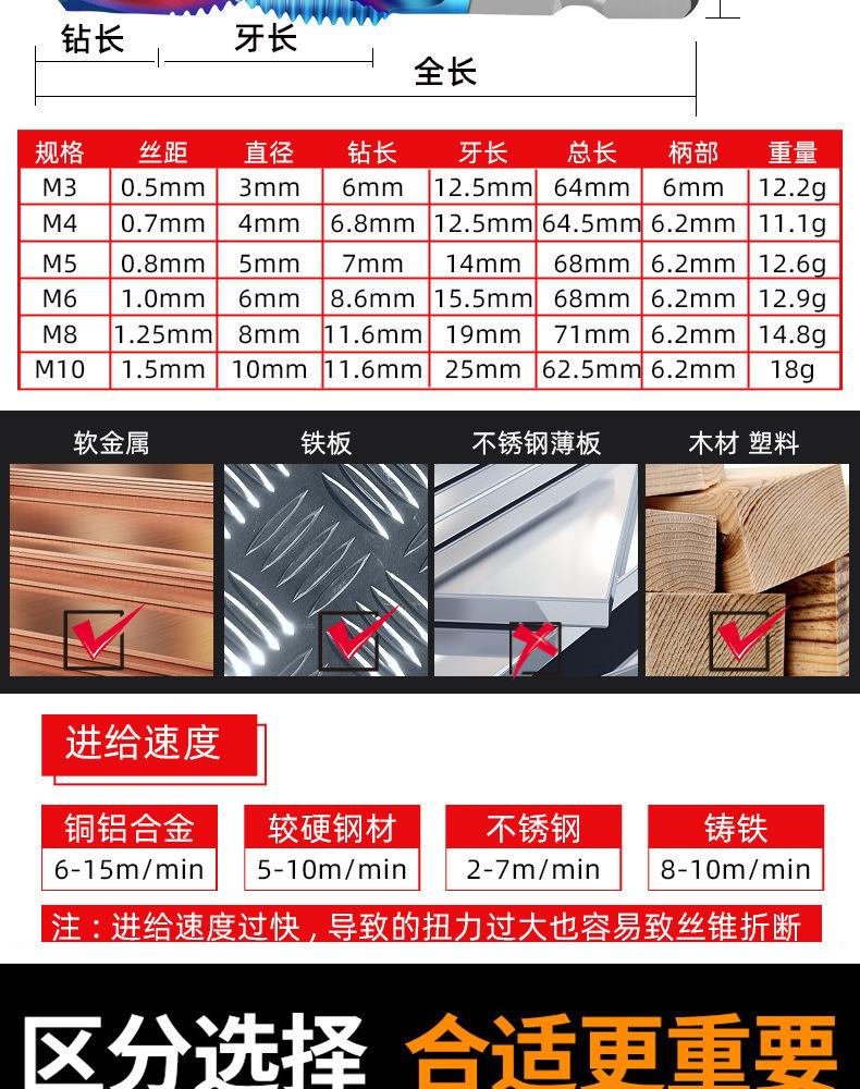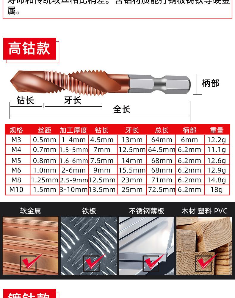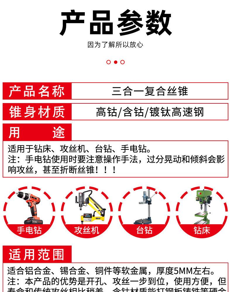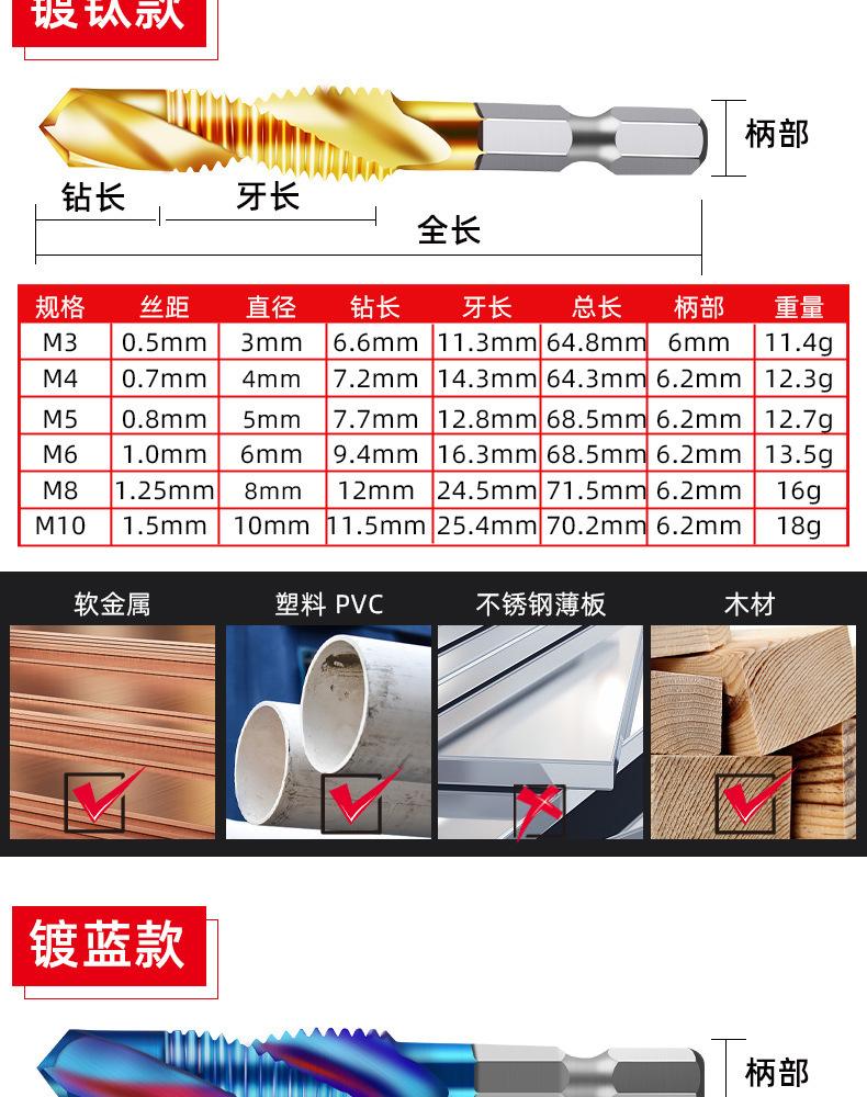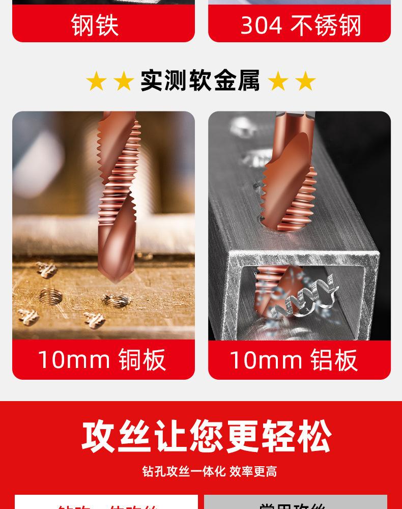 Broca Espiral para Macho de Roscar Compuesto Tres en Uno Integrado para Taladrar y Roscado para Roscado de Tornillos Autorroscantes