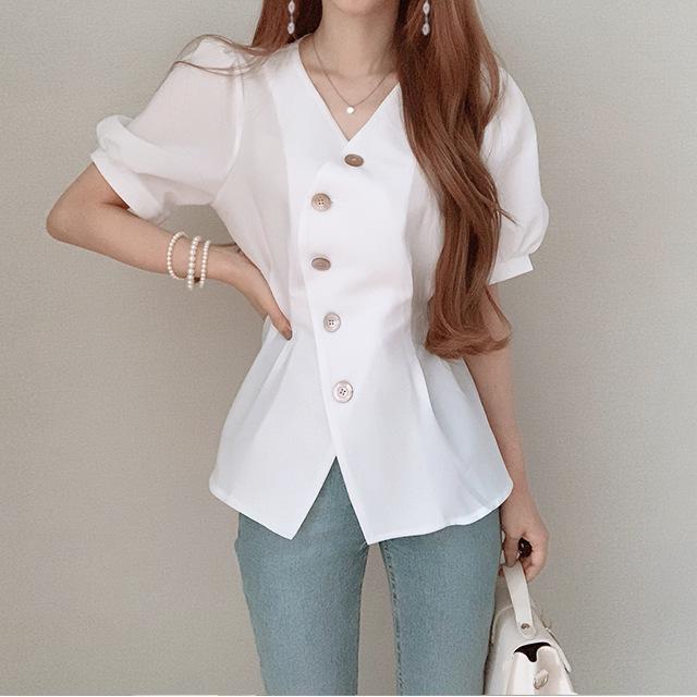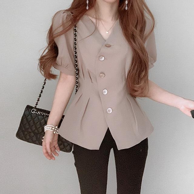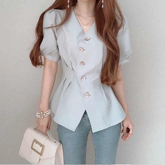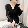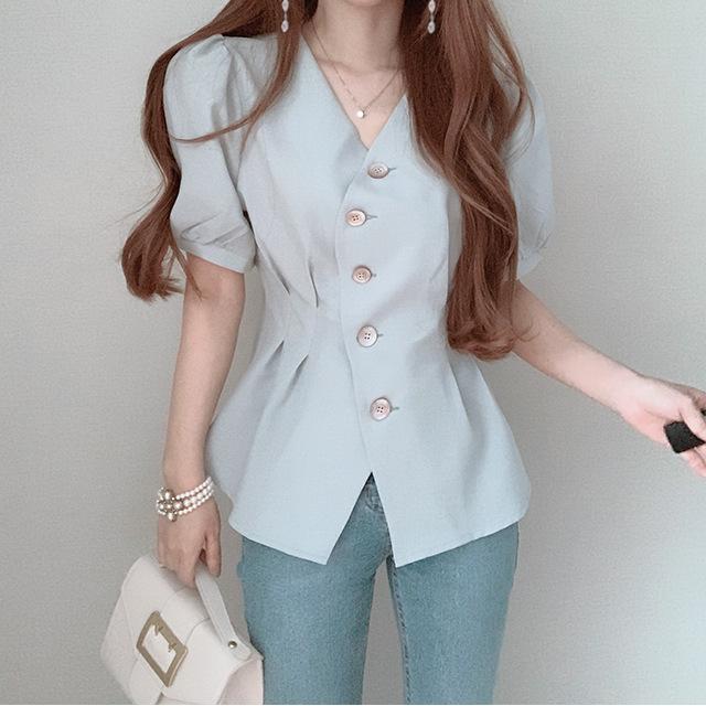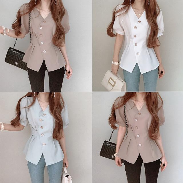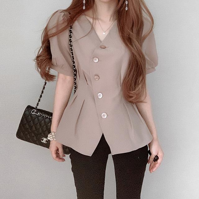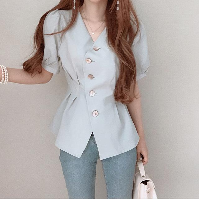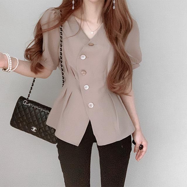En stock Diseño nicho sentido cuello en V manga larga camisa irregular retro ceñida a la cintura top ajustado