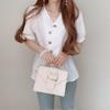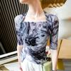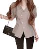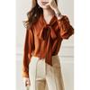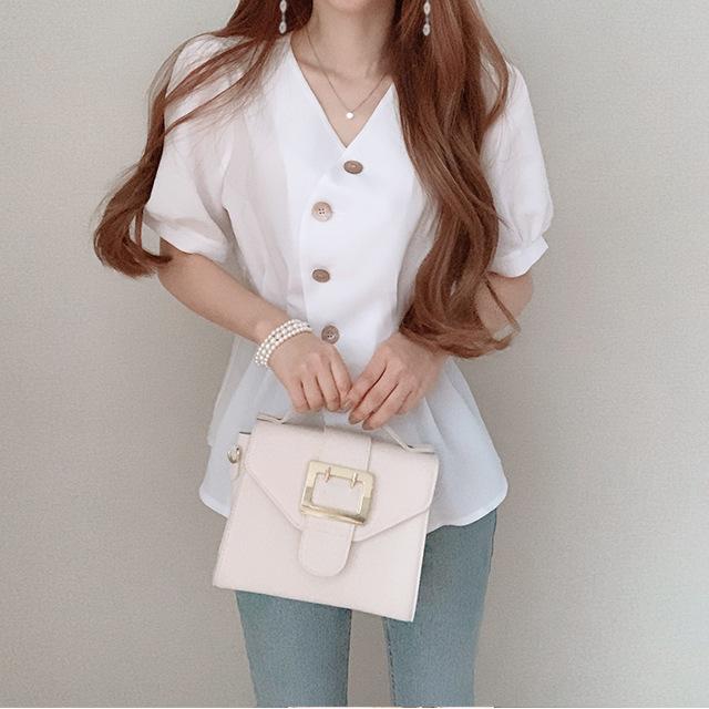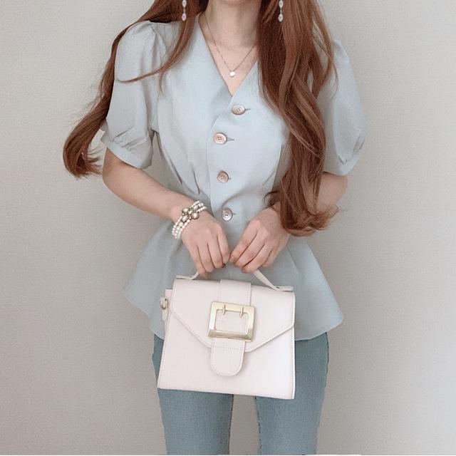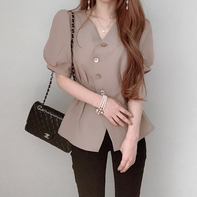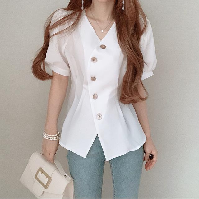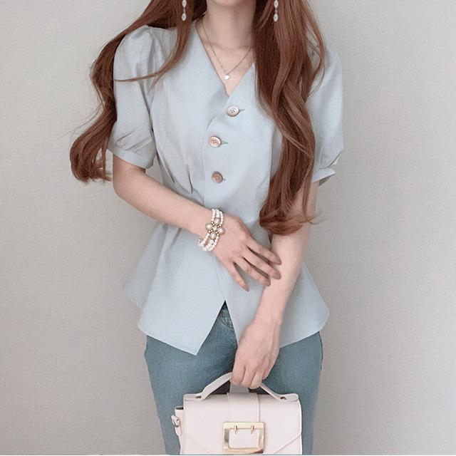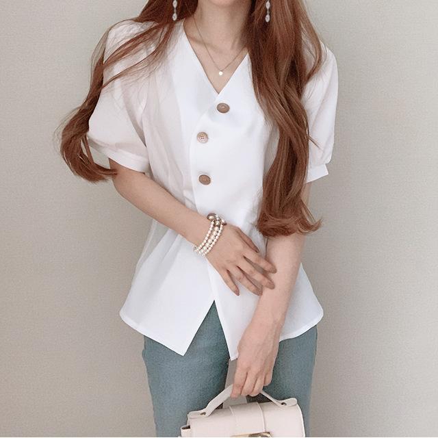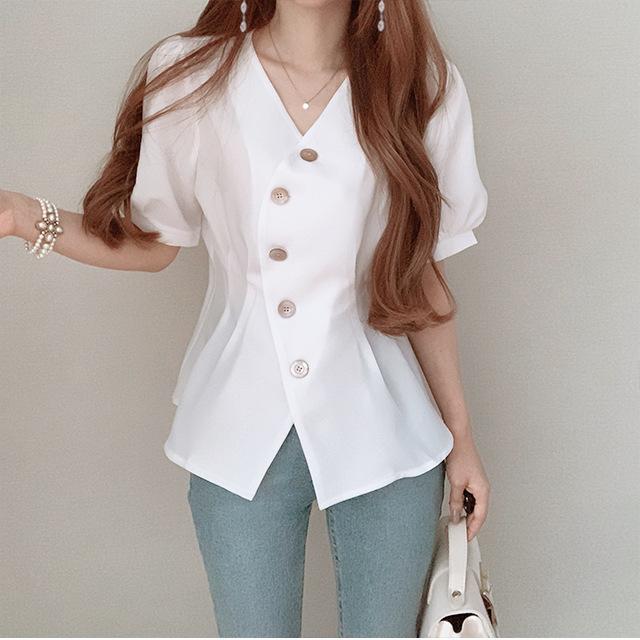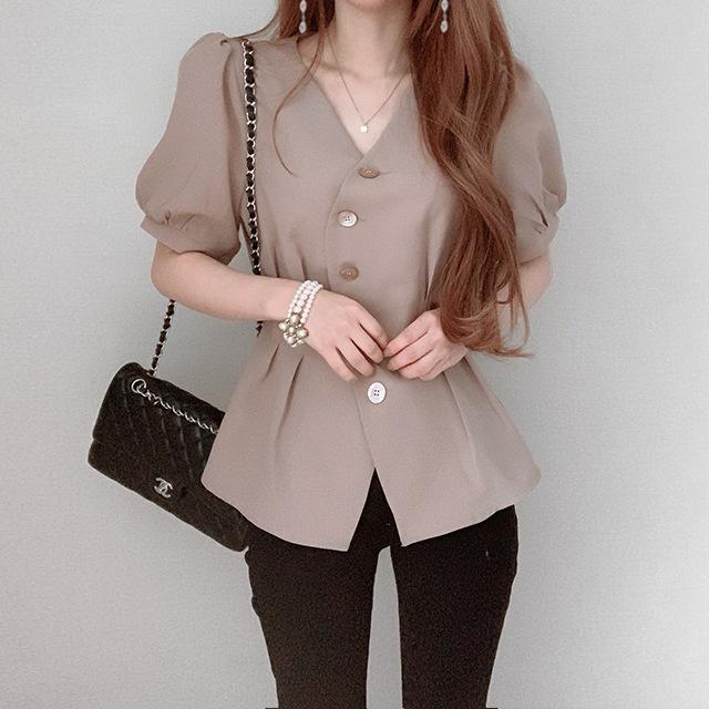 En stock Diseño nicho sentido cuello en V manga larga camisa irregular retro ceñida a la cintura top ajustado