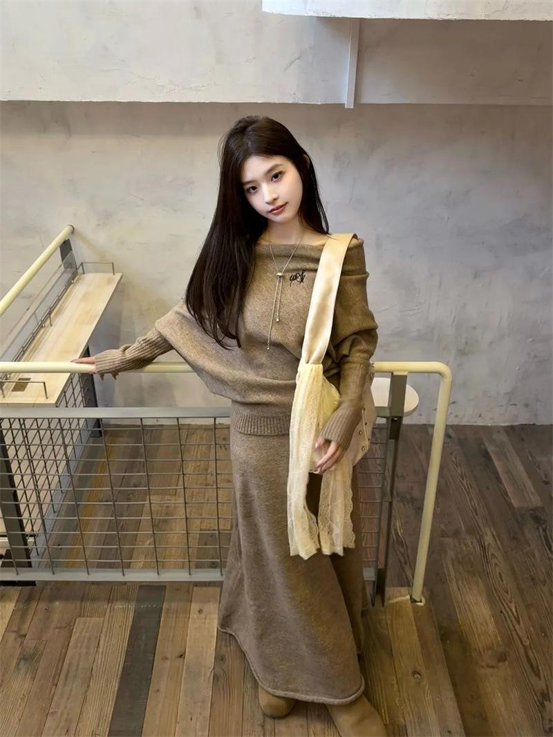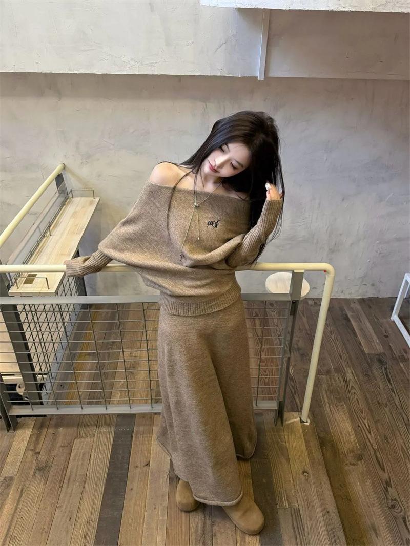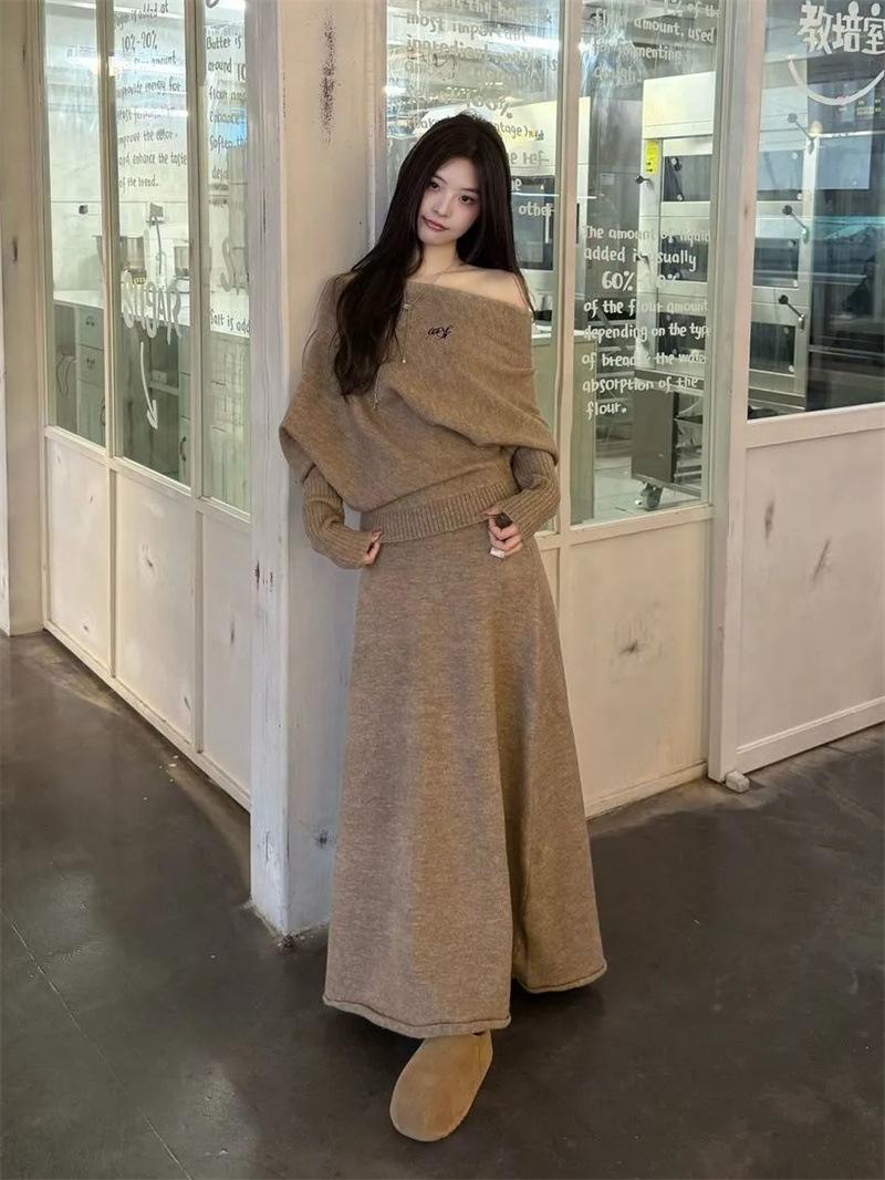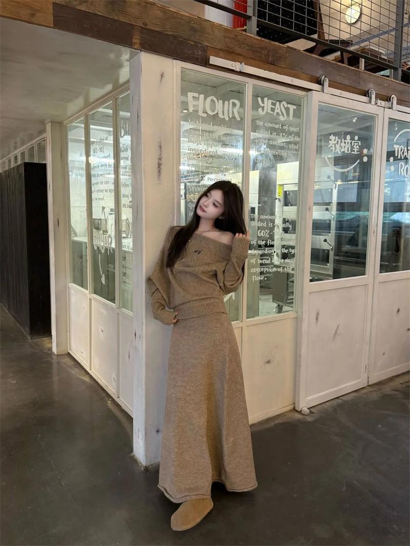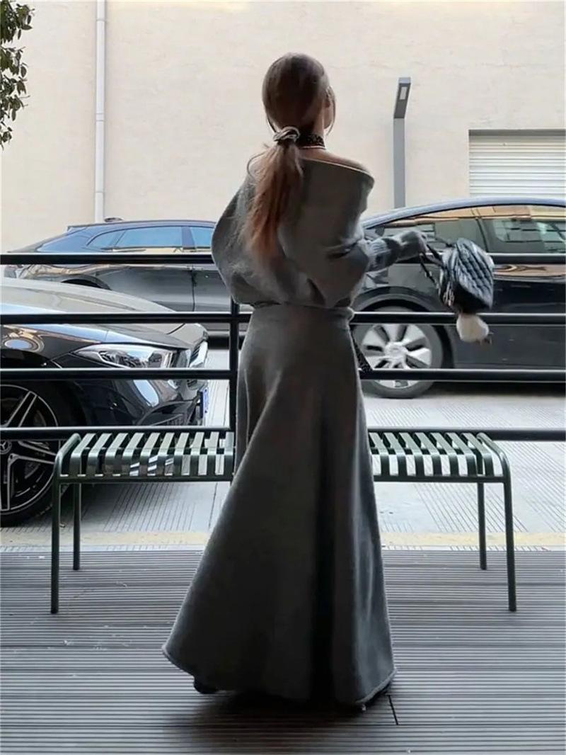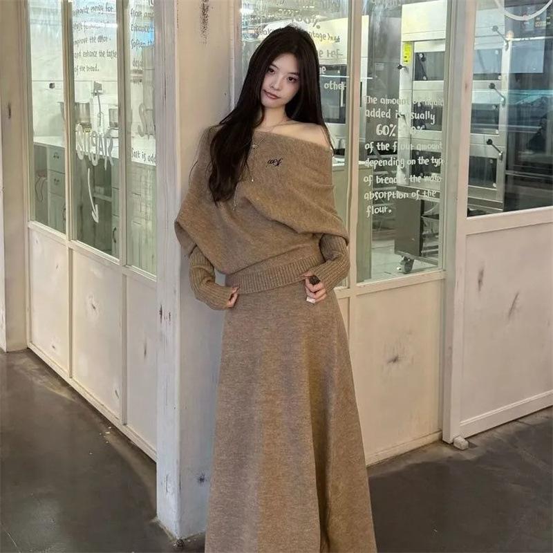 Conjunto de atuendo estilo coreano de comercio transfronterizo europeo y americano, top de punto holgado con hombros descubiertos y manga larga con falda midi, conjunto de dos piezas