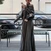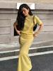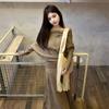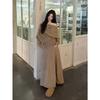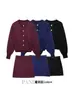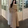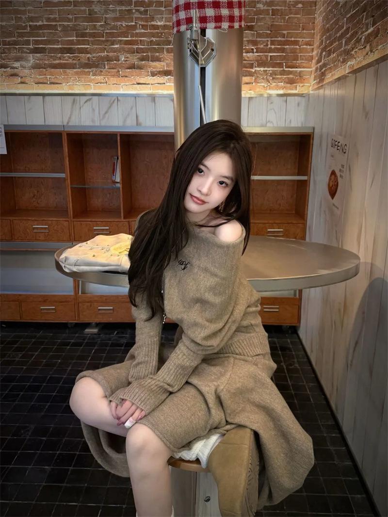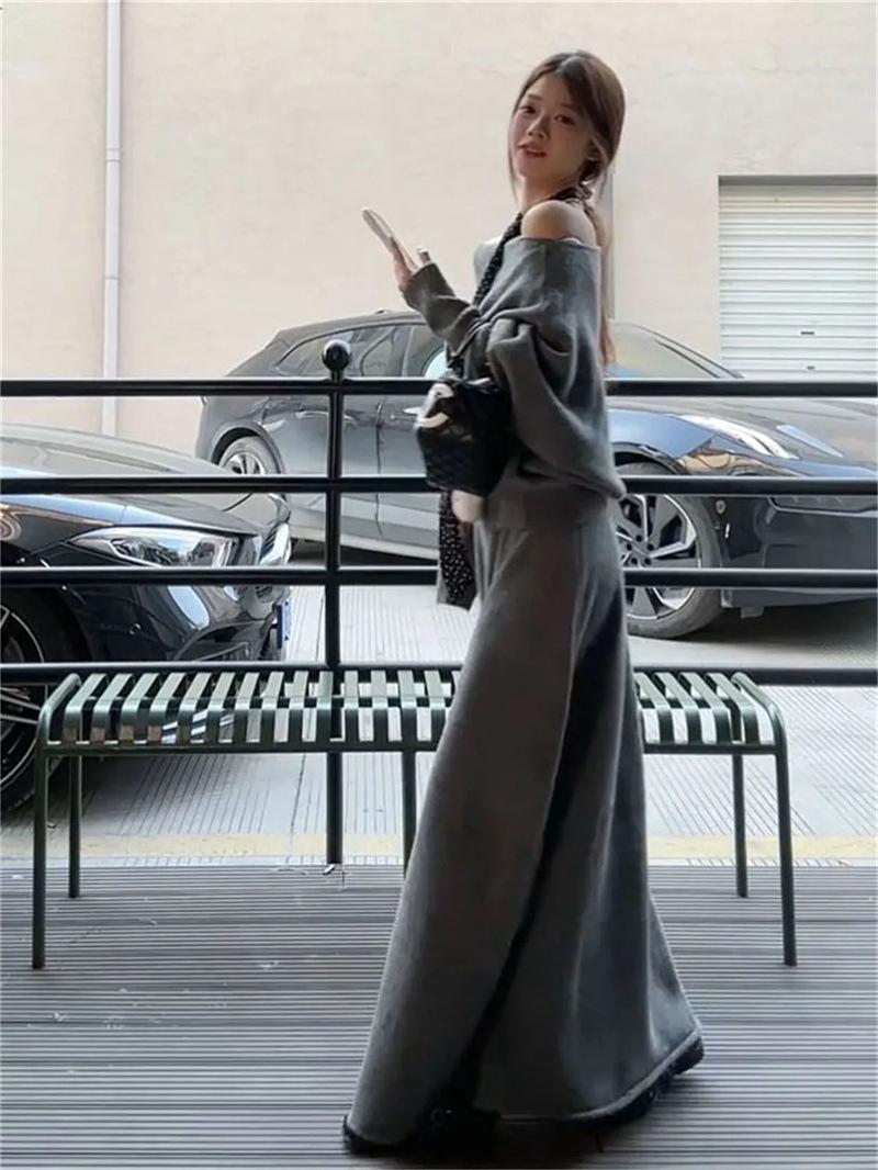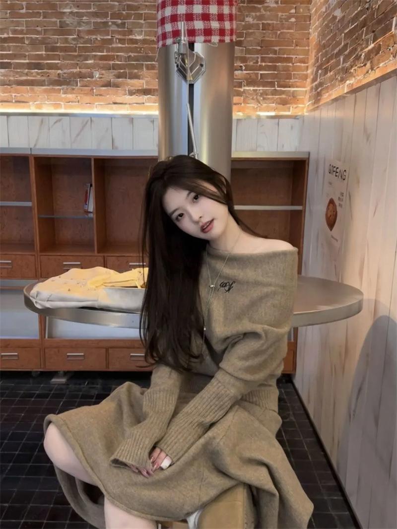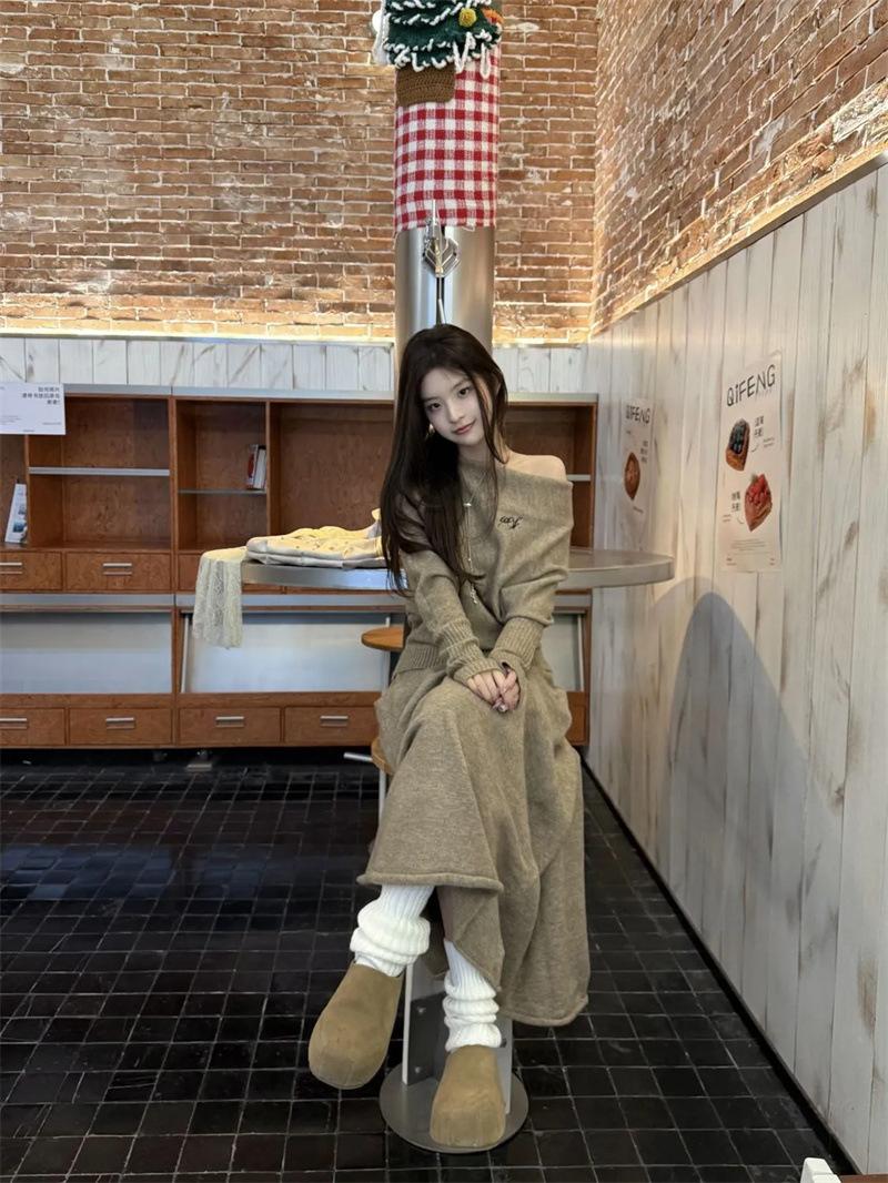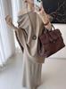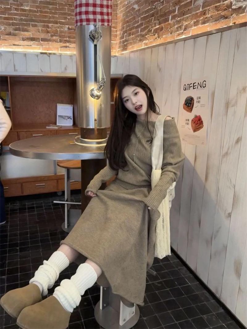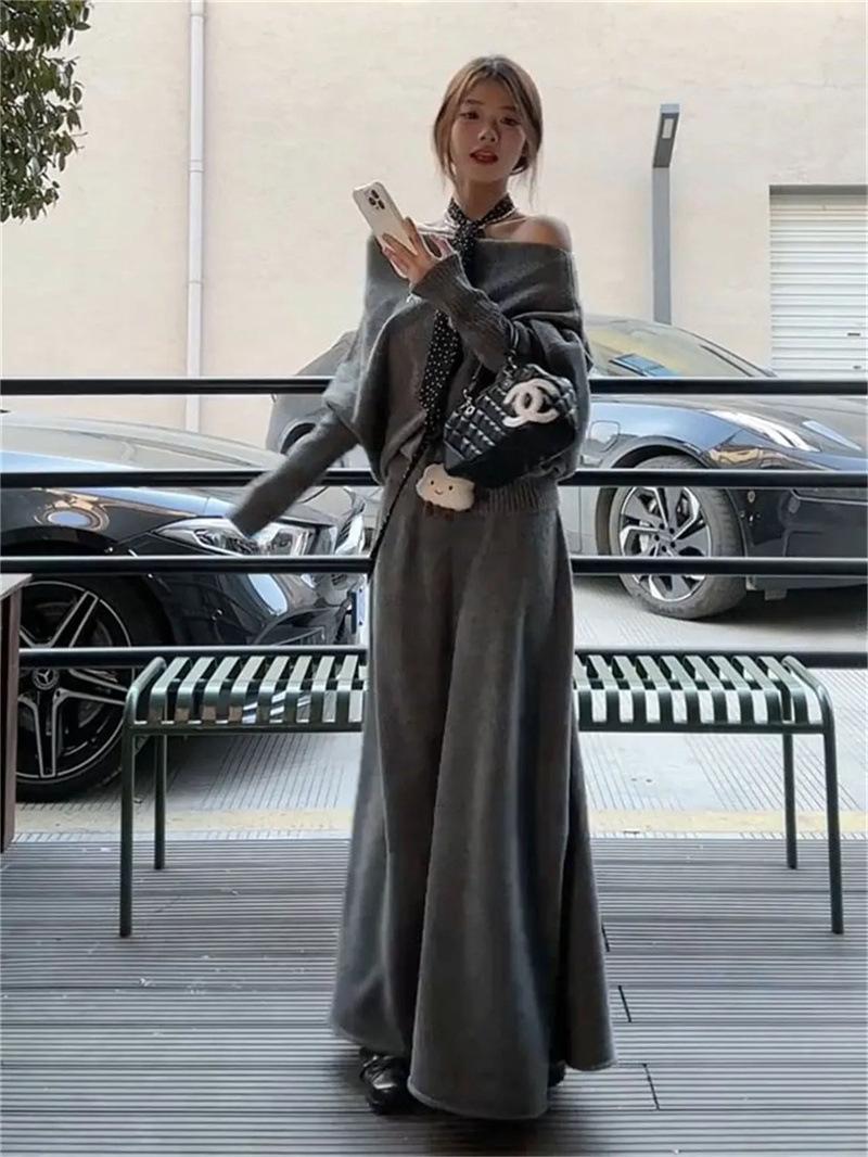 Conjunto de atuendo estilo coreano de comercio transfronterizo europeo y americano, top de punto holgado con hombros descubiertos y manga larga con falda midi, conjunto de dos piezas
