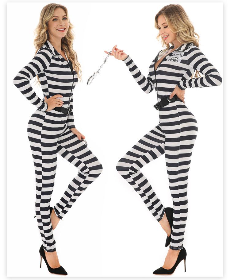 Compra Disfraz de Cosplay de Escena de Halloween Ropa de Diablo para Adulto Mujer Rayas Blancas y Negras Sexy Prisionera de una Pieza al por mayor en Joom.pro