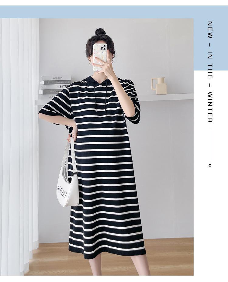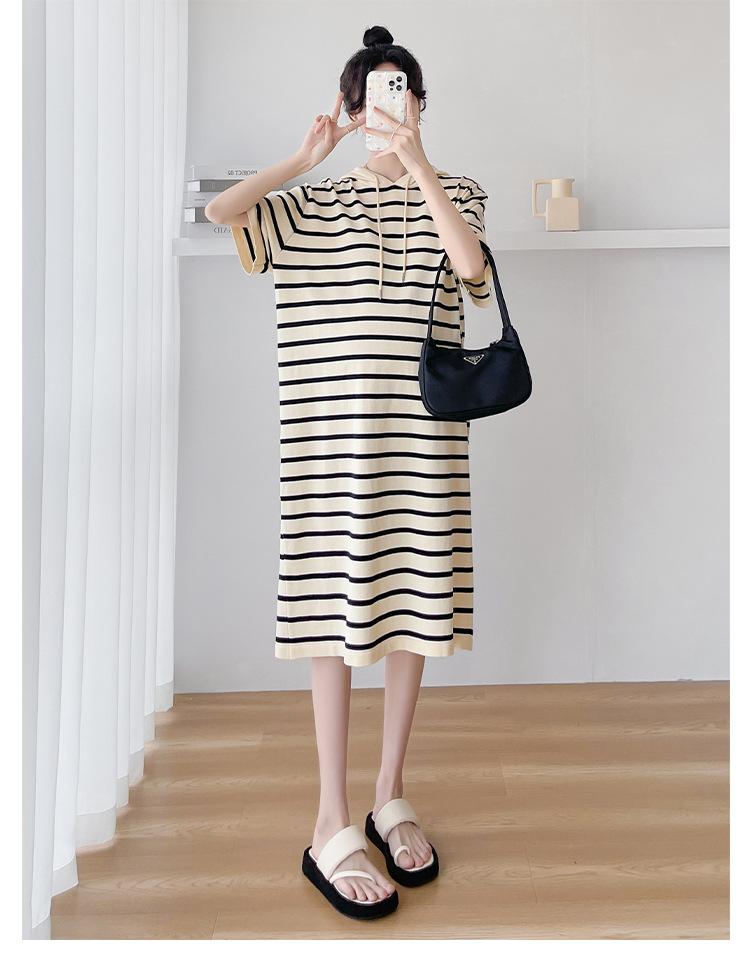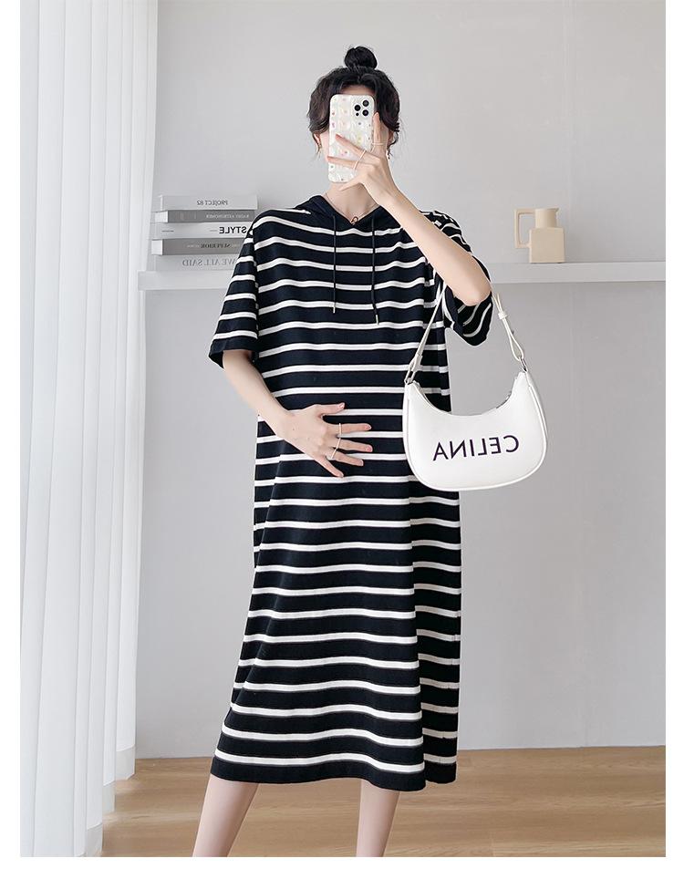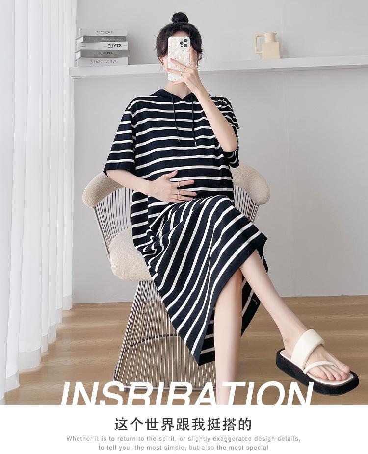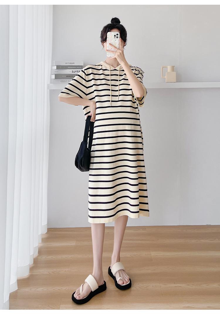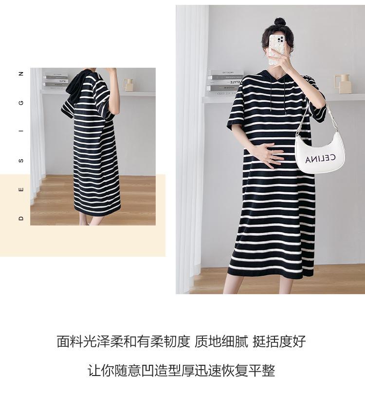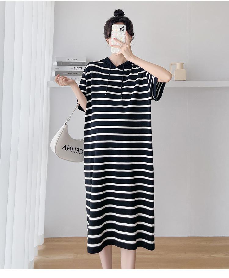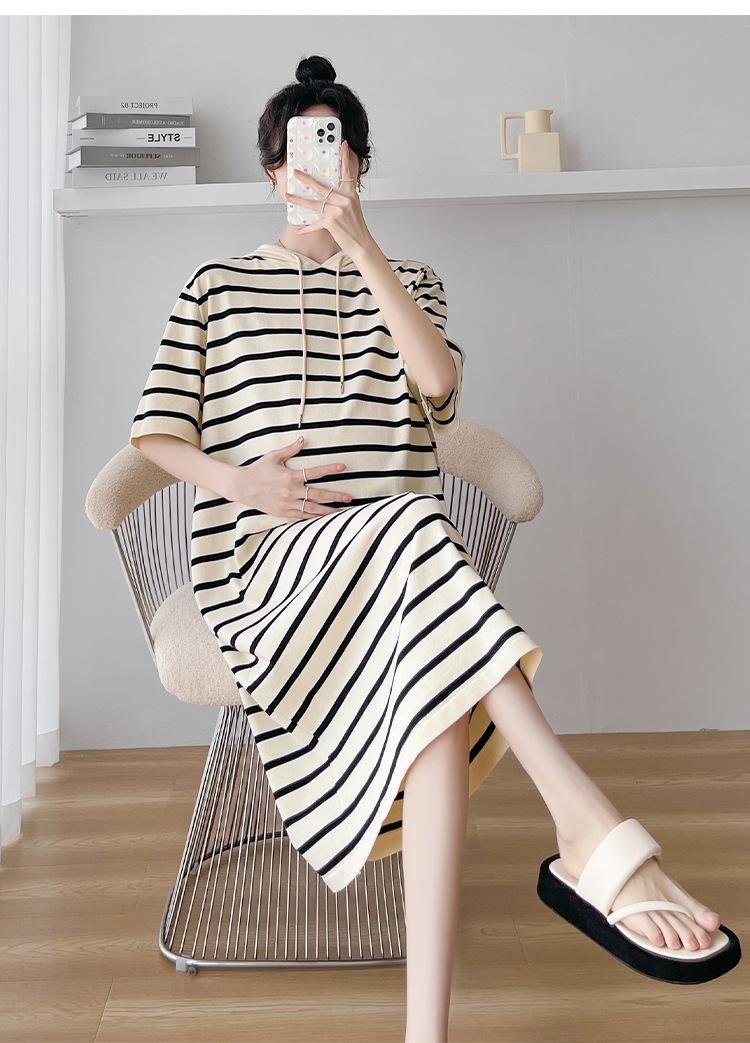 Ropa de Maternidad 2025 Verano Nuevo Talla Grande Rayado con Capucha Seda Helada Suelto Adelgazante Vestido Midi