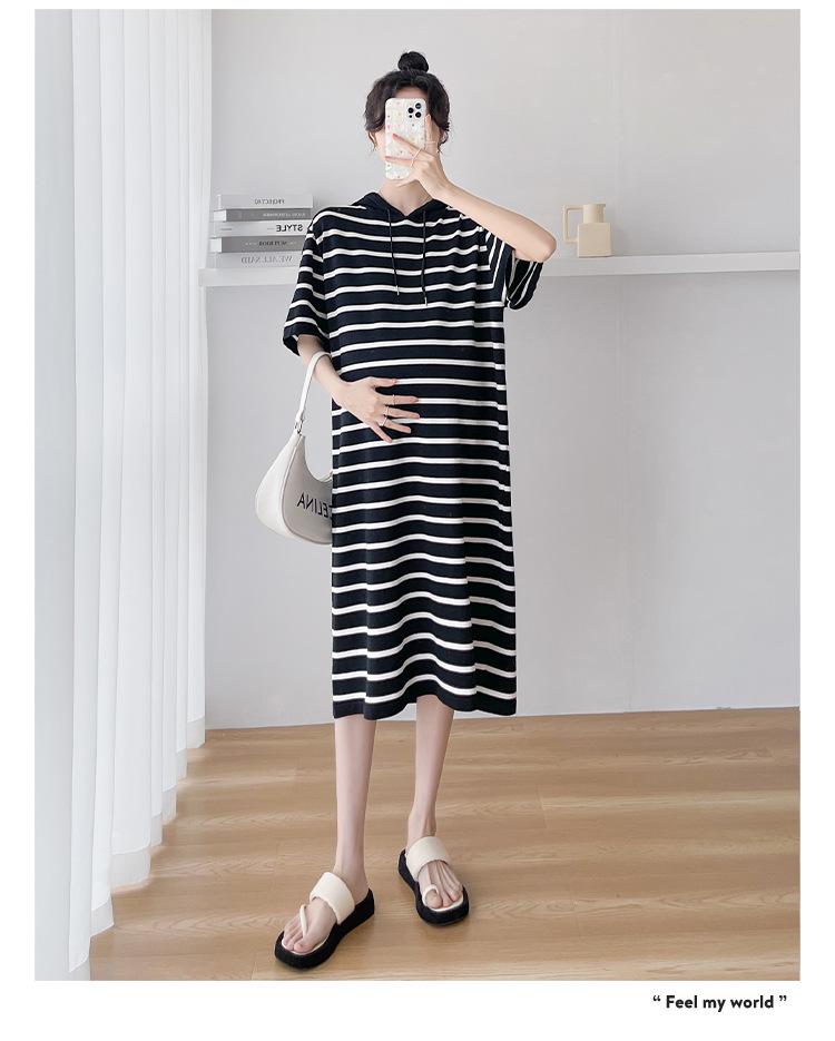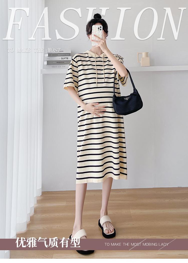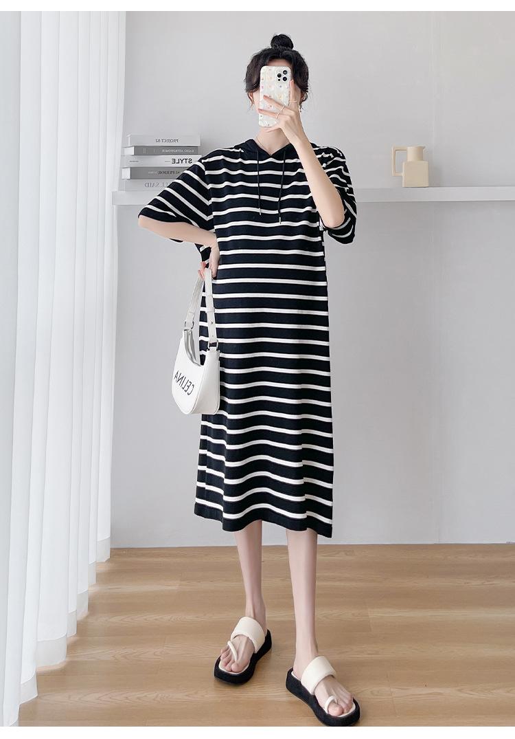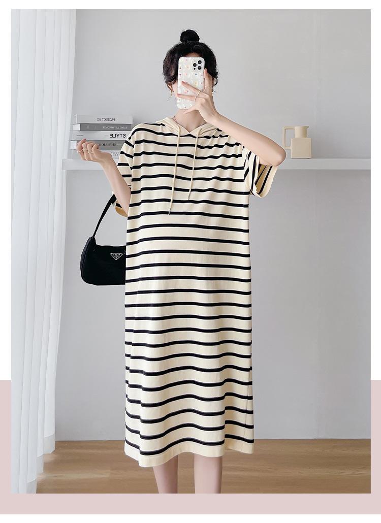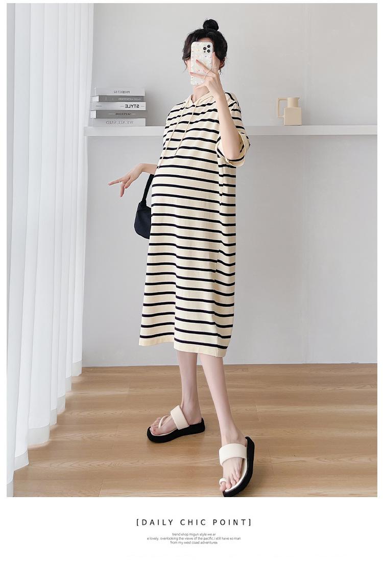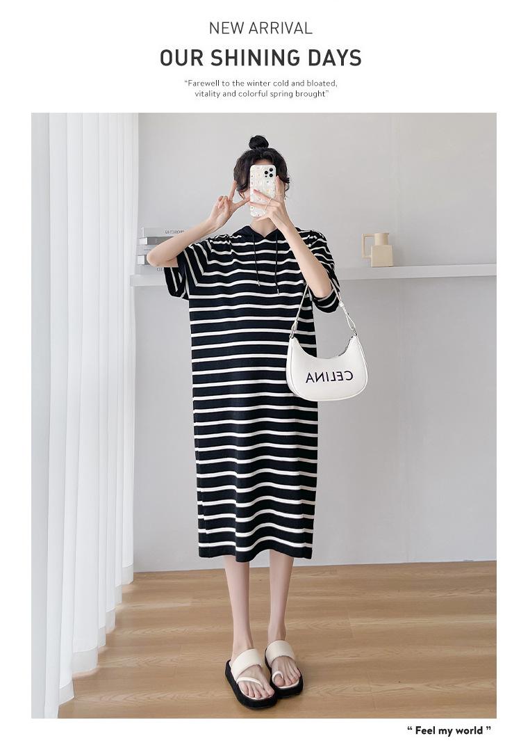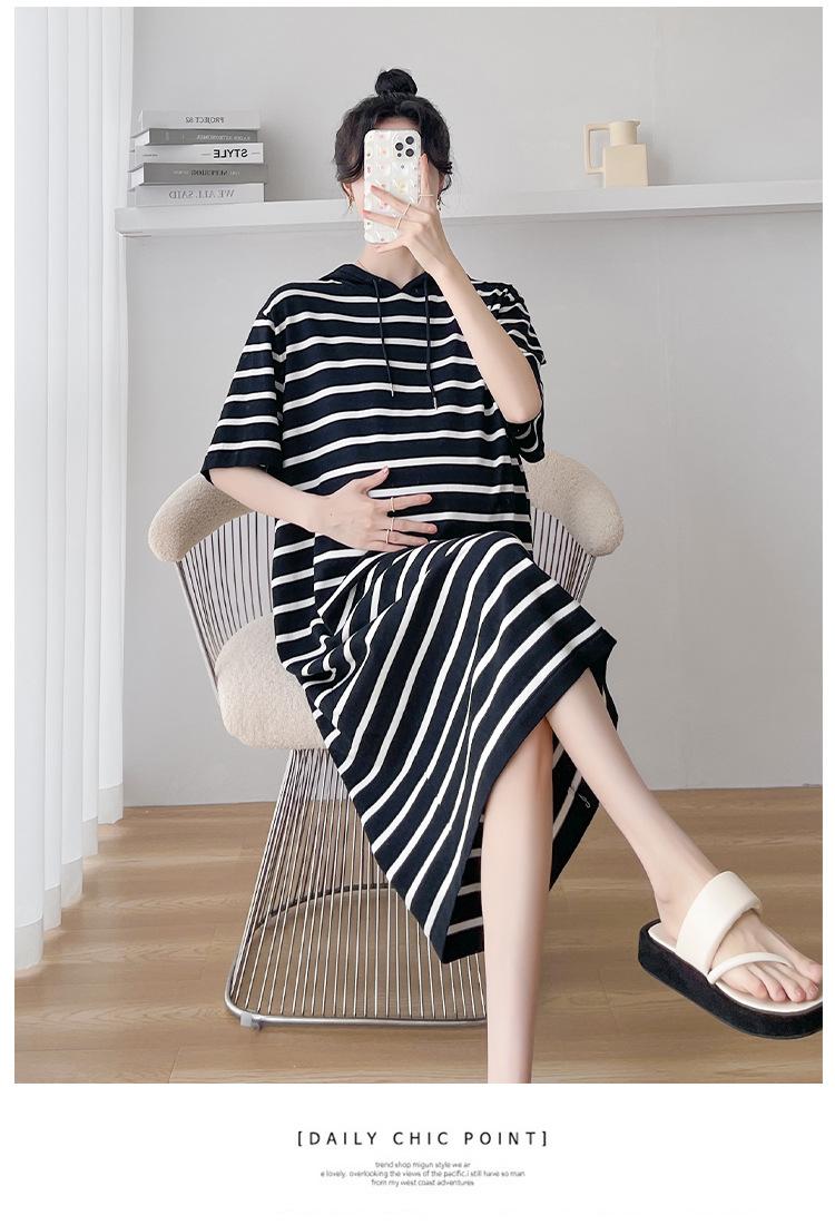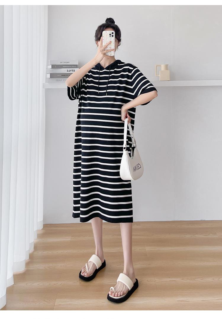 Ropa de Maternidad 2025 Verano Nuevo Talla Grande Rayado con Capucha Seda Helada Suelto Adelgazante Vestido Midi