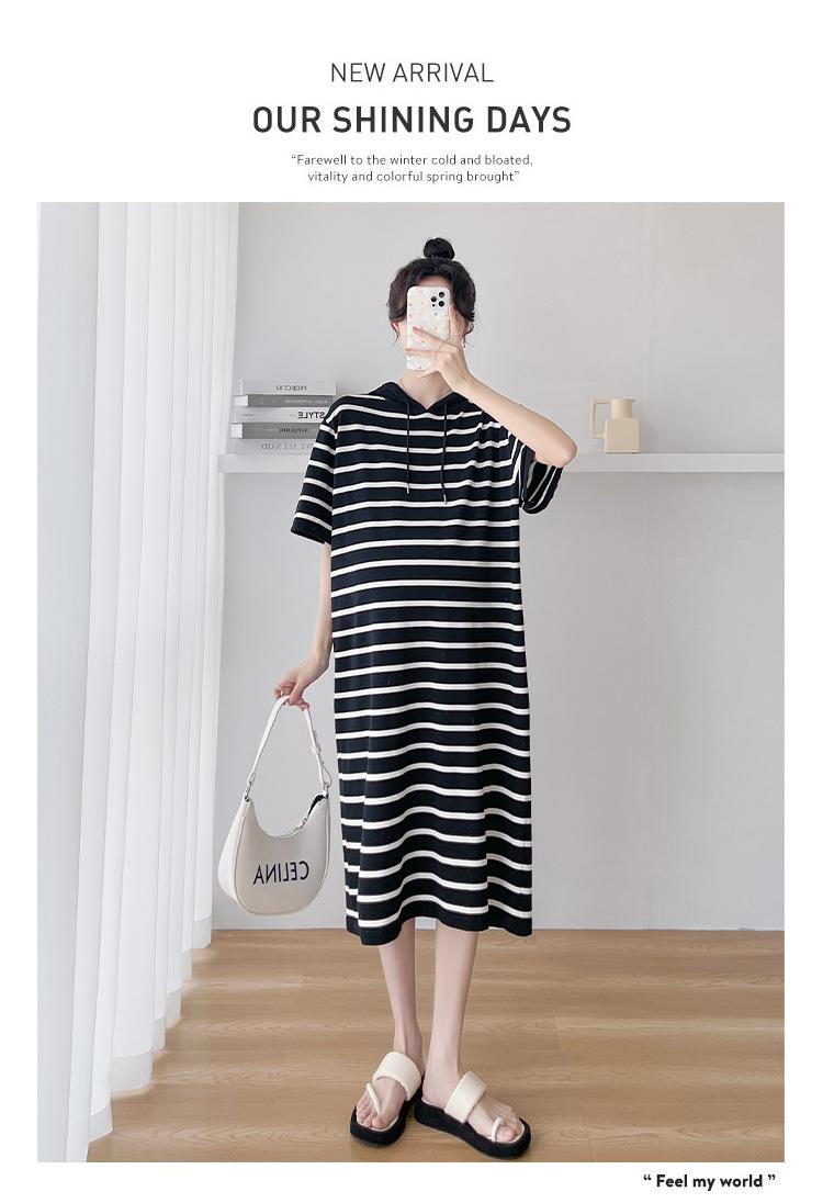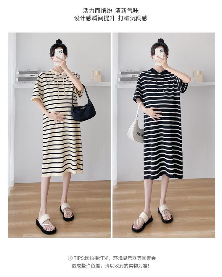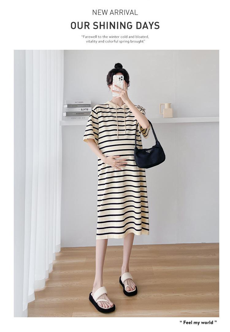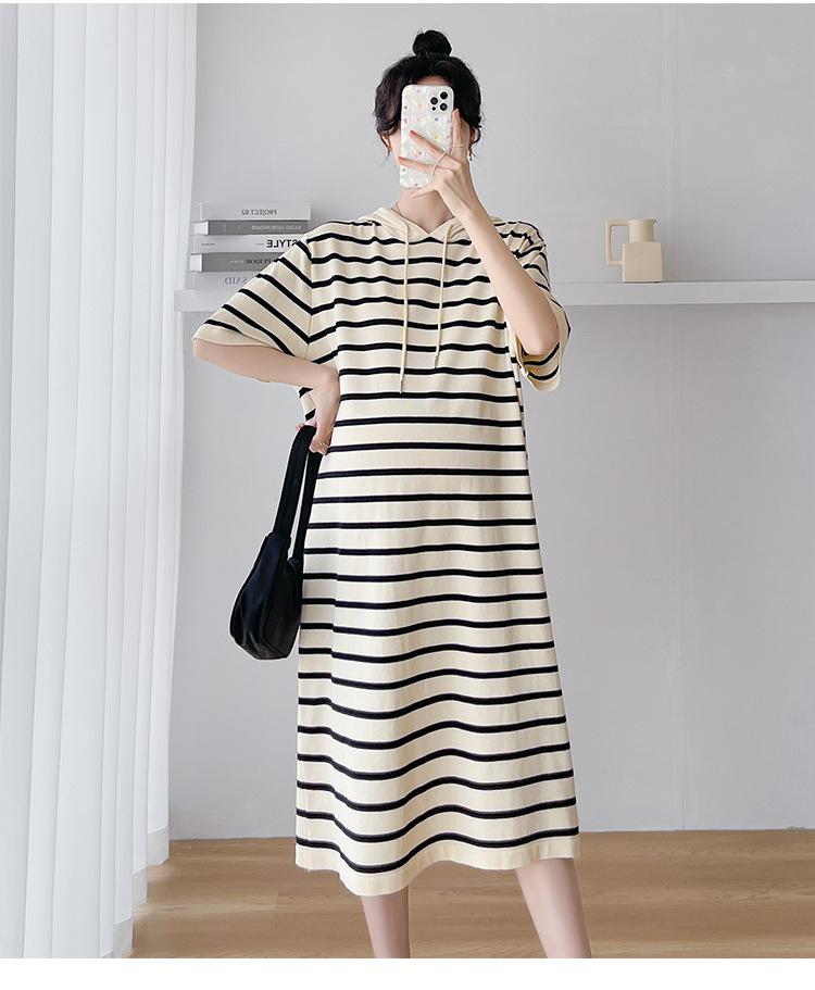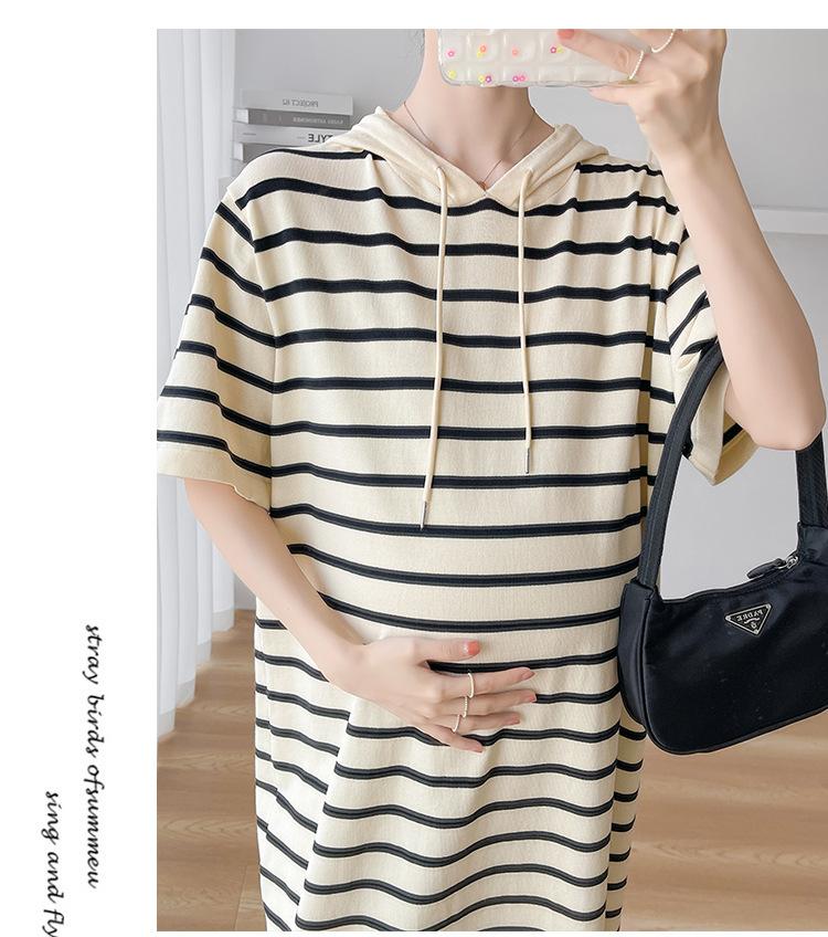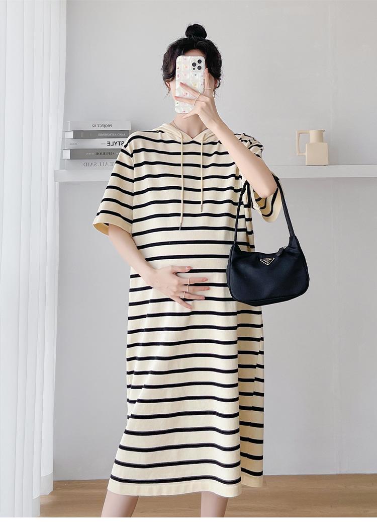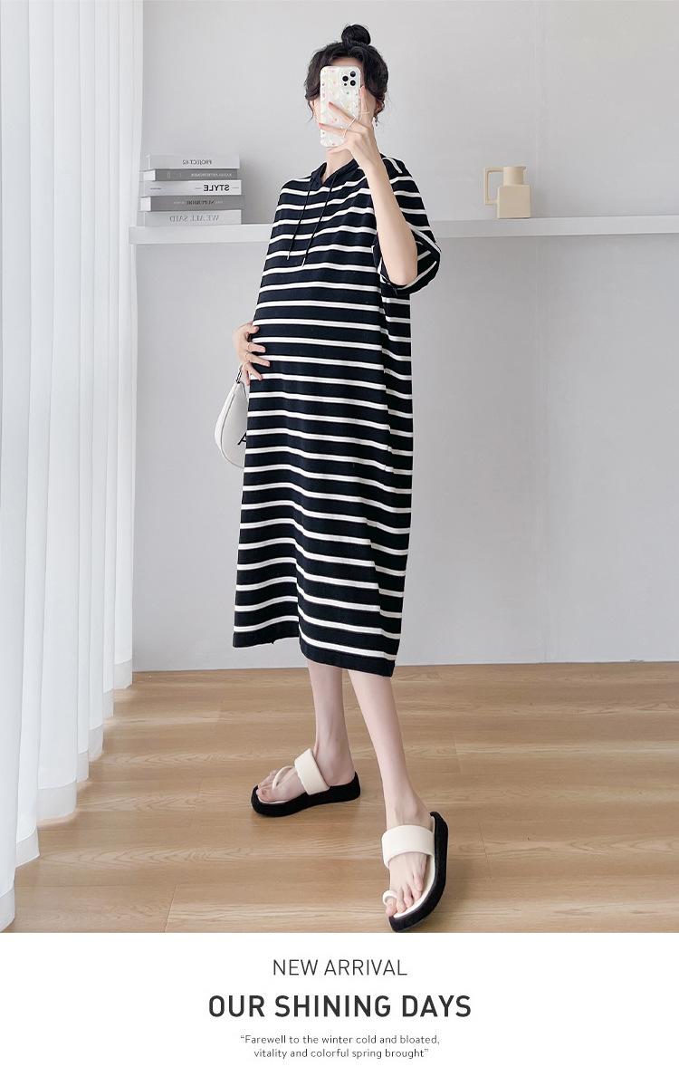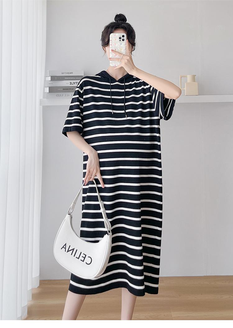Ropa de Maternidad 2025 Verano Nuevo Talla Grande Rayado con Capucha Seda Helada Suelto Adelgazante Vestido Midi