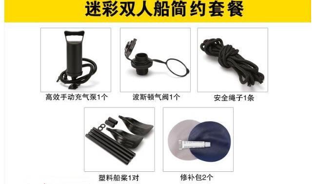 Accesorios para bote de 2 personas: 1. Una cuerda de remolque 2. Un par de remos de plástico reforzado 3. Un kit de reparación 4. Una bomba de pie