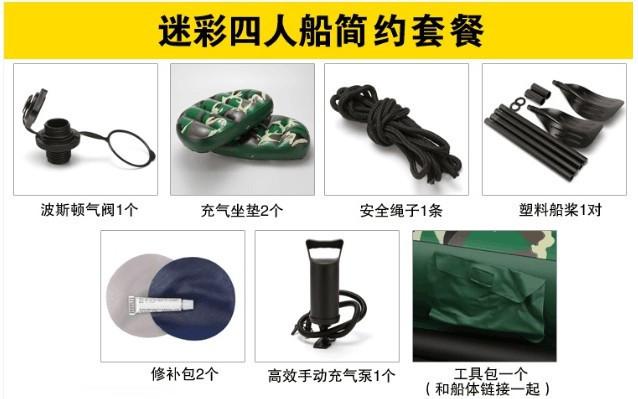 Accesorios para bote de 4 personas:.una cuerda de remolque, 2. un par de remos de plástico reforzado 3. un kit de reparación 4. como se suministró originalmenteEstribo5. Par de cojines inflables 6. Par de asientos de pesca