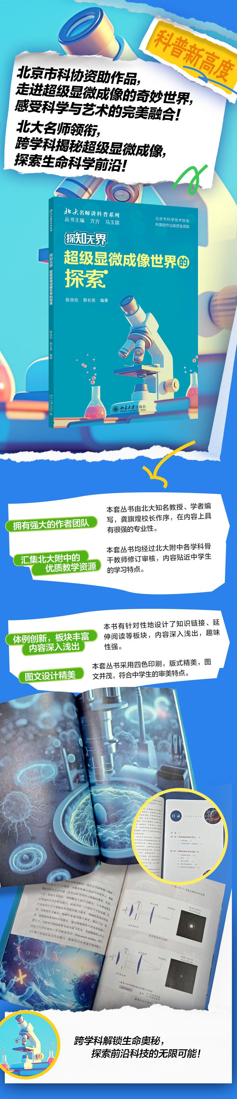 《Explorando lo Ilimitado·La Exploración del Mundo Supermicroscópico》 es uno de los libros de la serie "Profesores Famosos de la Universidad de Pekín Hablan de Ciencia". Esta serie está escrita por profesores y académicos de renombre de la Universidad de Pekín, y revisada por profesores destacados de diversas disciplinas de la Escuela Secundaria de la Universidad de Pekín. El contenido es profesional y estrechamente relacionado con las características de aprendizaje de los estudiantes de secundaria, y ha sido seleccionado como un proyecto financiado para la creación y publicación de divulgación científica por la Asociación de Ciencia y Tecnología de Beijing en 2024. Este libro integra conocimientos de biología, matemáticas, química y otras disciplinas, explora profundamente los misterios de la vida, y los estudiantes aprenderán cómo trascender los límites disciplinarios y utilizar el pensamiento integral para resolver problemas complejos.