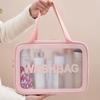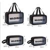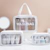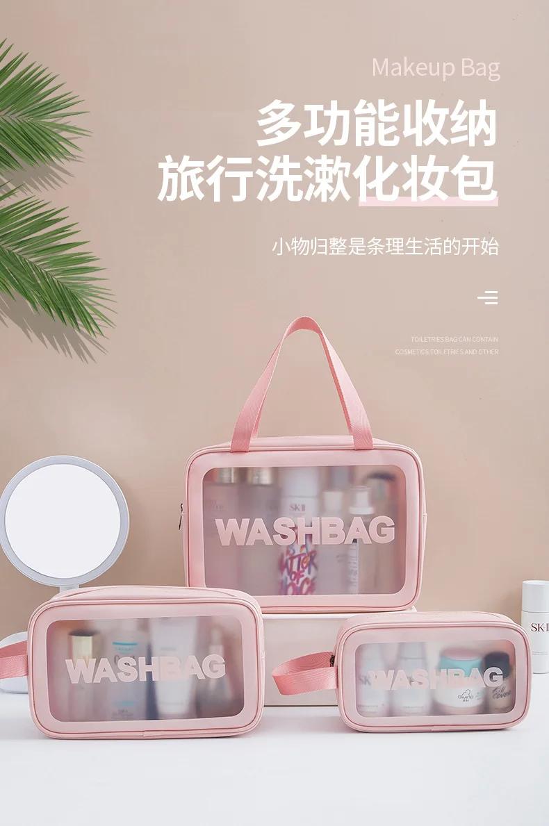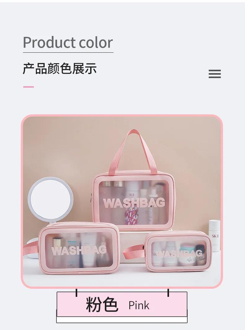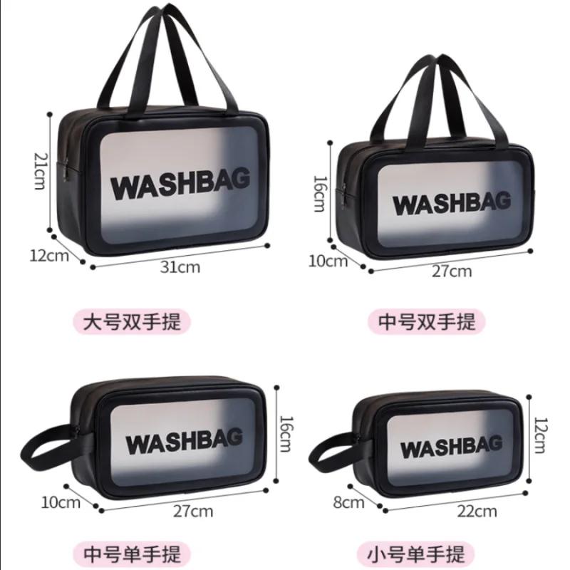Este práctico juego de neceser transparente de 3 piezas está diseñado para viajes y uso diario. Hechas de material de PVC de alta calidad, estas bolsas presentan un estilo minimalista moderno con ribetes y asas negras.. El set incluye tamaños pequeño, mediano y grande para satisfacer todas sus necesidades cosméticas y de aseo personal.. Cada bolsa está claramente marcada con la marca WASHBAG en el frente.