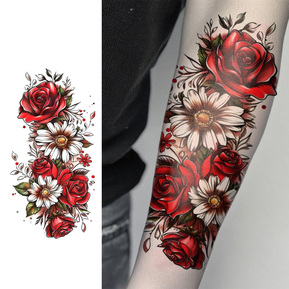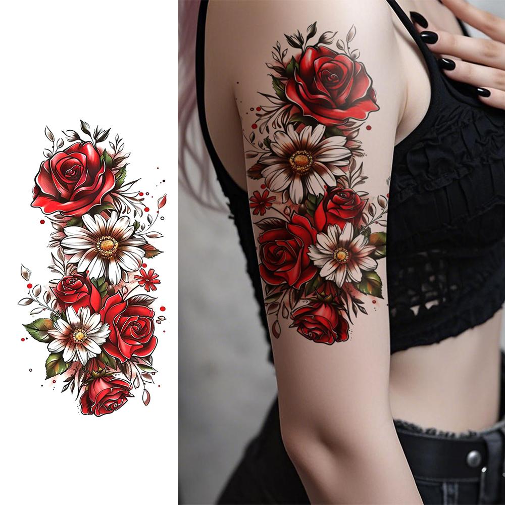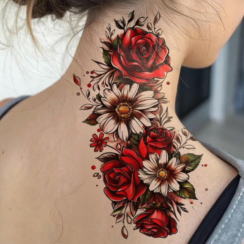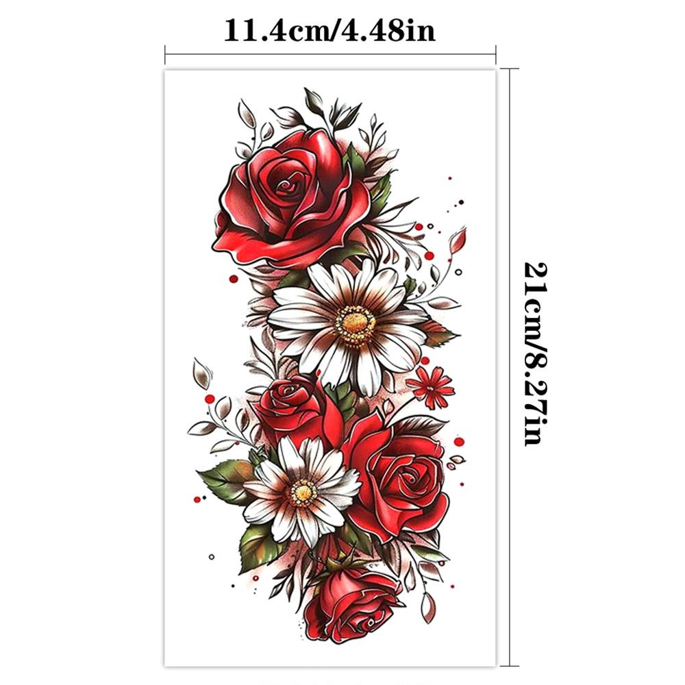 Flor roja brillante deslumbrante patrón de tatuaje floral rosa crisantemo peonía alas de ángel pegatinas de tatuajes temporales impermeables de larga duración tatuajes falsos adecuados para brazos, hombros, cuello, espalda, cintura y piernas de hombres y mujeres, fiestas navideñas, maquillaje corporal, cobertura de cicatrices, decoración corporal de moda diaria