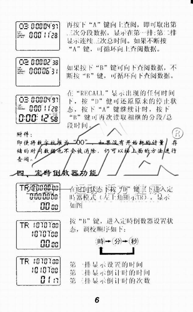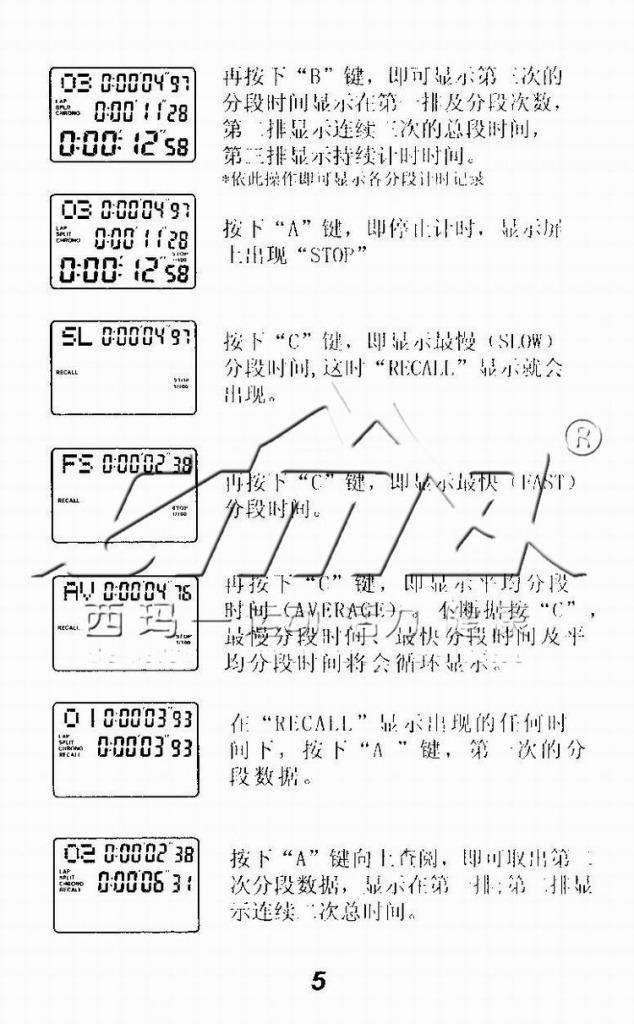 2. Registrar múltiples tiempos: Si desea registrar el movimiento de múltiples objetos que comienzan simultáneamente pero llegan a la línea de meta en diferentes momentos, puede usar la función de múltiples tiempos (el número específico que se puede registrar depende del manual del reloj). Es decir, primero presione START/STOP para iniciar el cronómetro en modo cronómetro, el cronómetro comienza a contar segundos automáticamente, cuando un objeto llega a la línea de meta, presione LAP/RESET una vez, el conteo para ese objeto se detiene y se muestra en la parte superior de la pantalla. En este momento, el cronómetro continúa registrando, y el circuito interno continúa acumulando segundos para los objetos posteriores. Después de que todos los objetos han sido registrados, detenga el cronómetro normalmente, presione RECALL para entrar y ver las situaciones de registro anteriores, use las teclas START/STOP y LAP/RESET para desplazarse hacia arriba y hacia abajo.