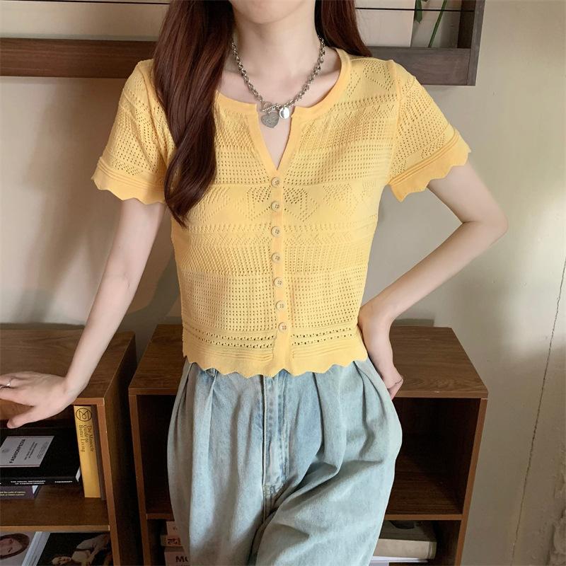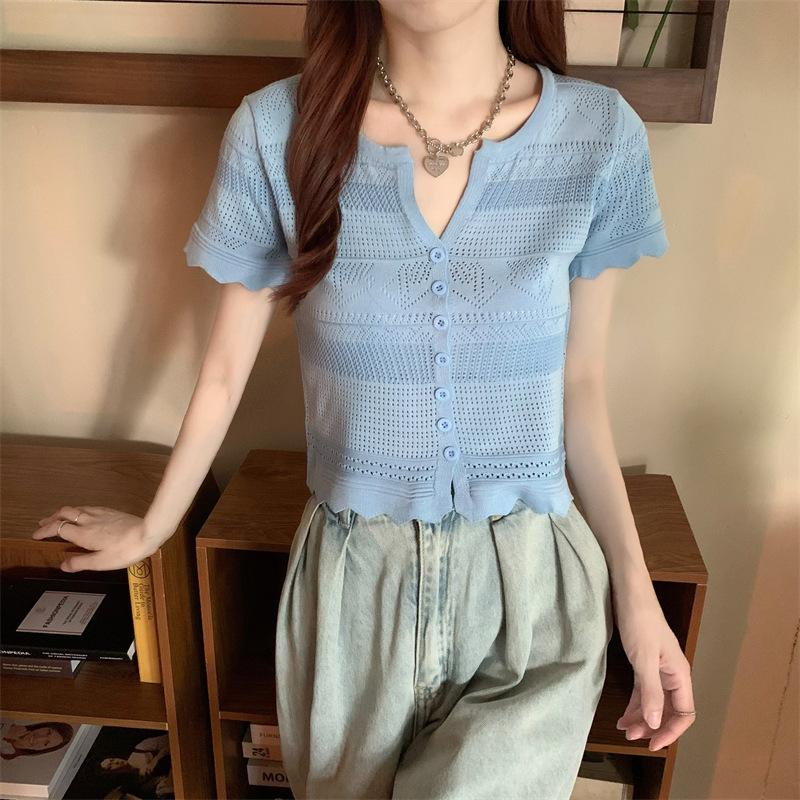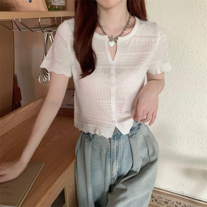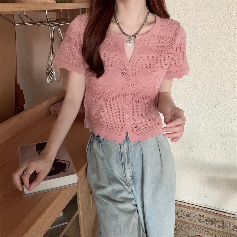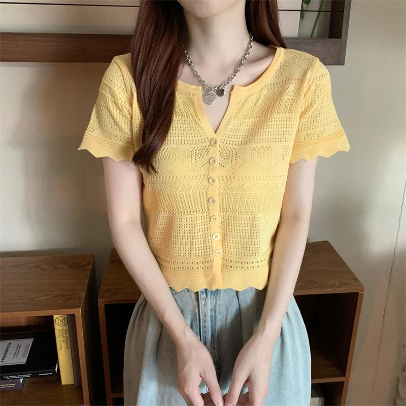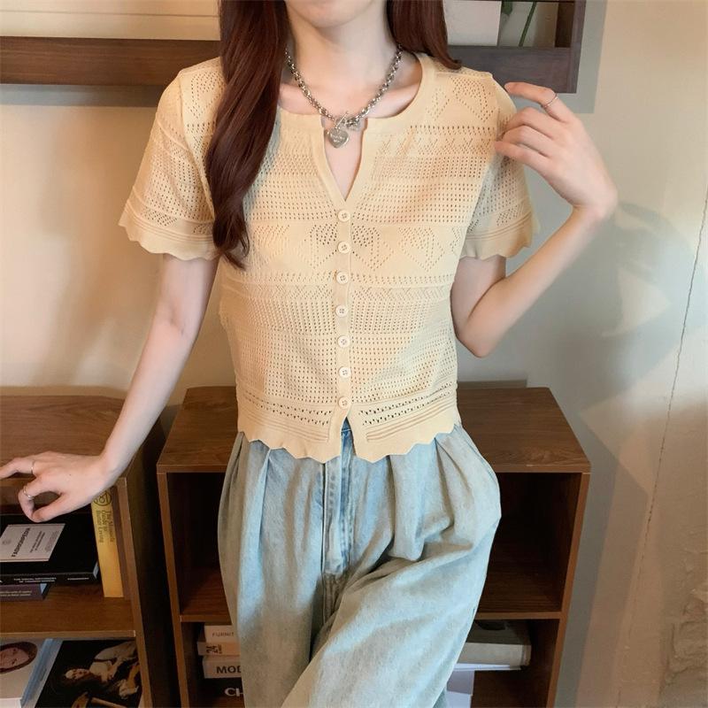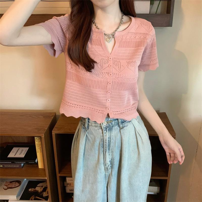 Compra Cárdigan de punto de manga corta camiseta corta fina Verano 2024 Nuevo moda francesa suave cuello en V top versátil para mujer al por mayor en Joom.pro