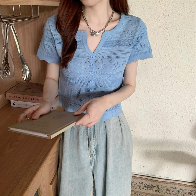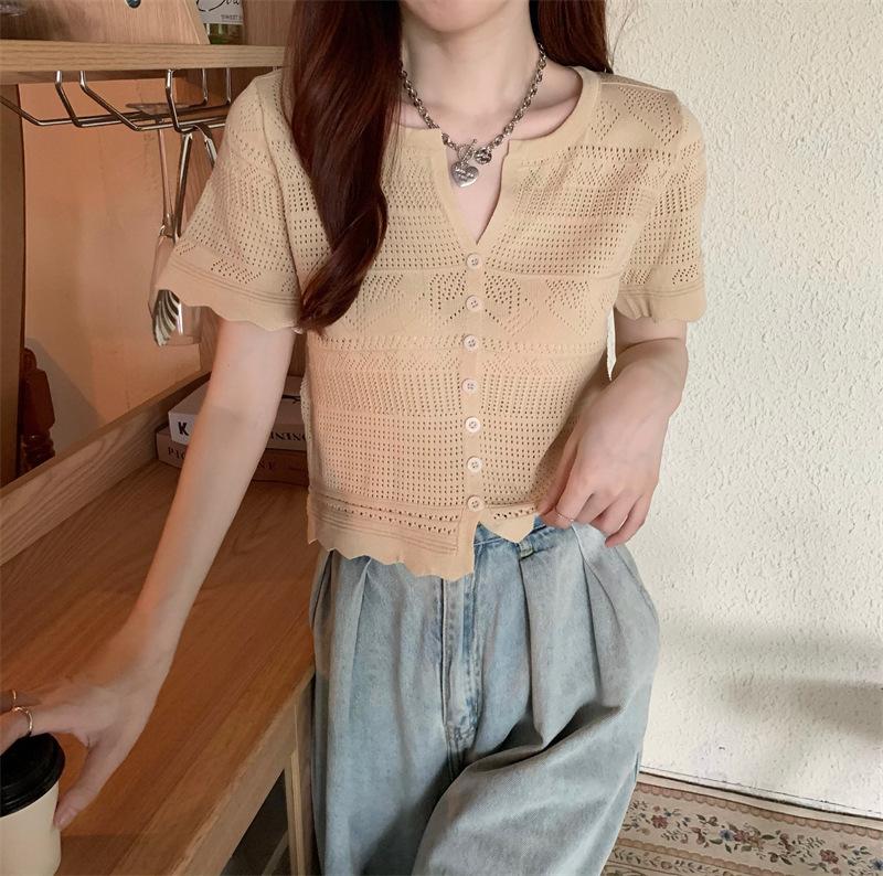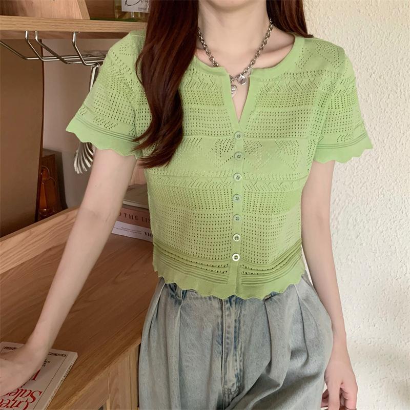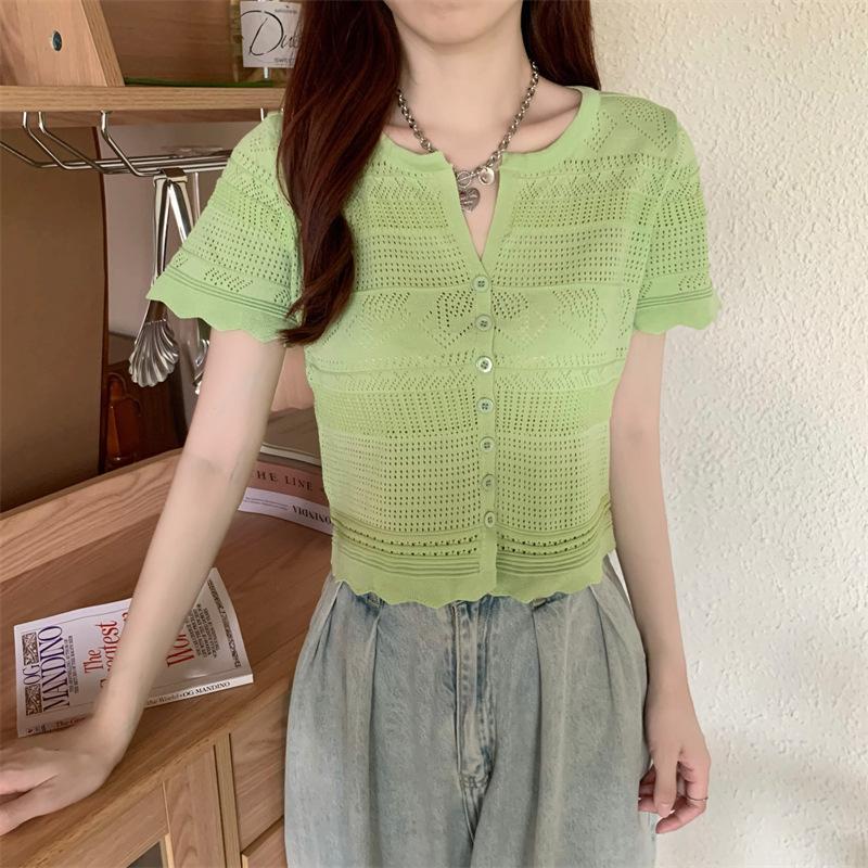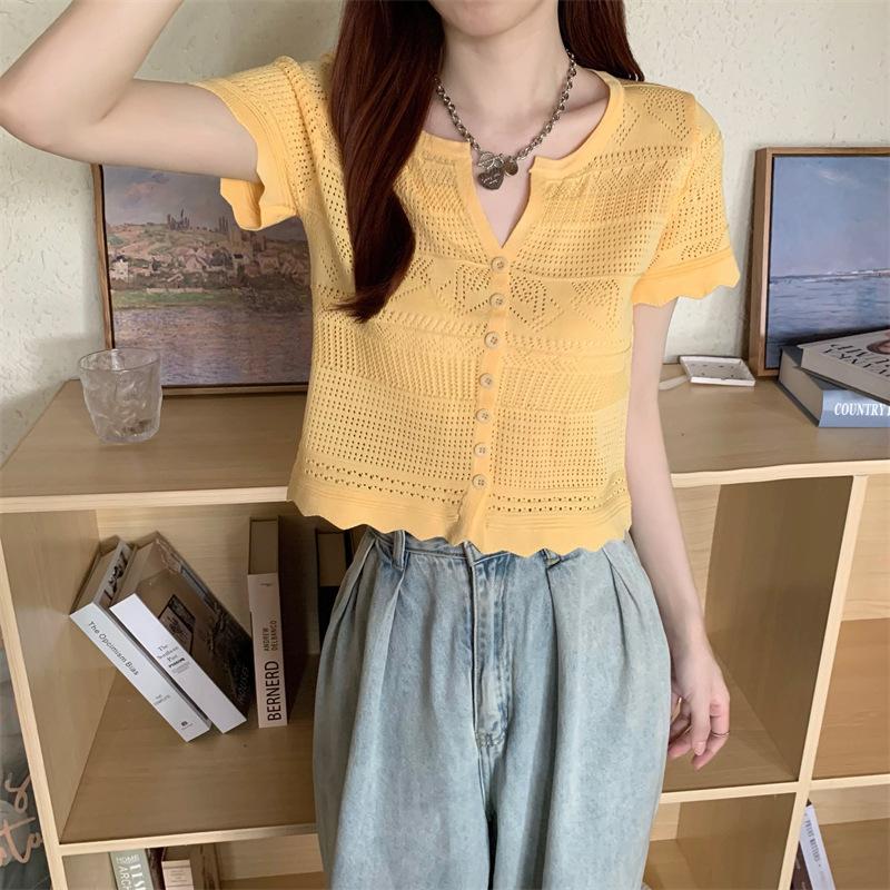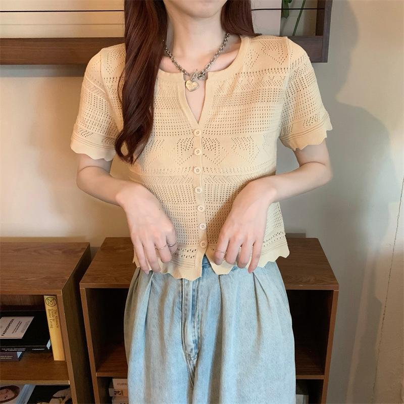 Compra Cárdigan de punto de manga corta camiseta corta fina Verano 2024 Nuevo moda francesa suave cuello en V top versátil para mujer al por mayor en Joom.pro