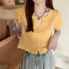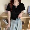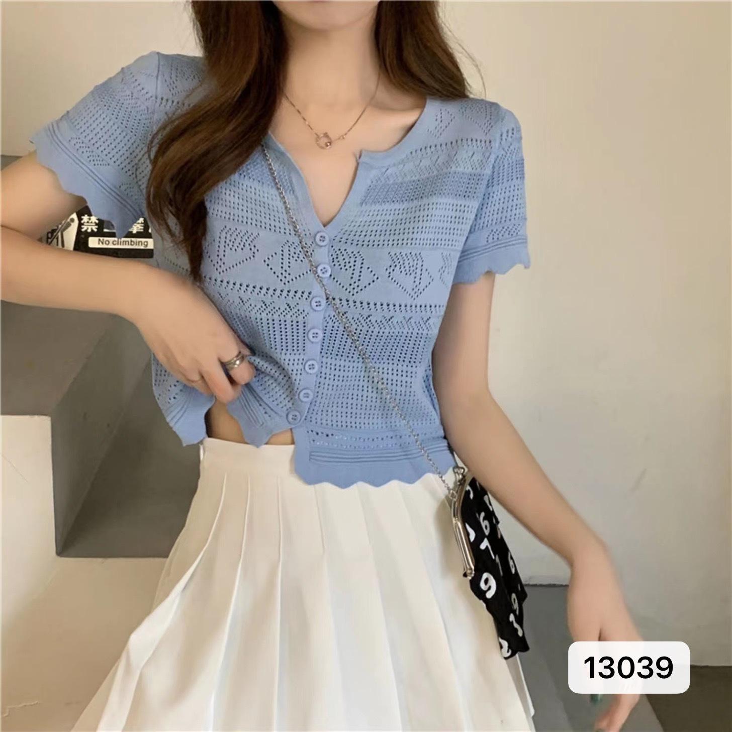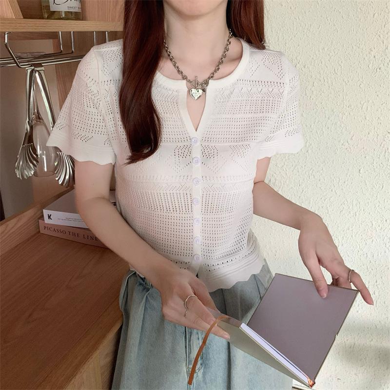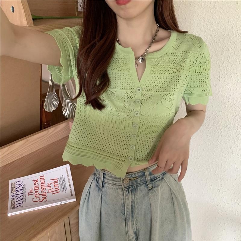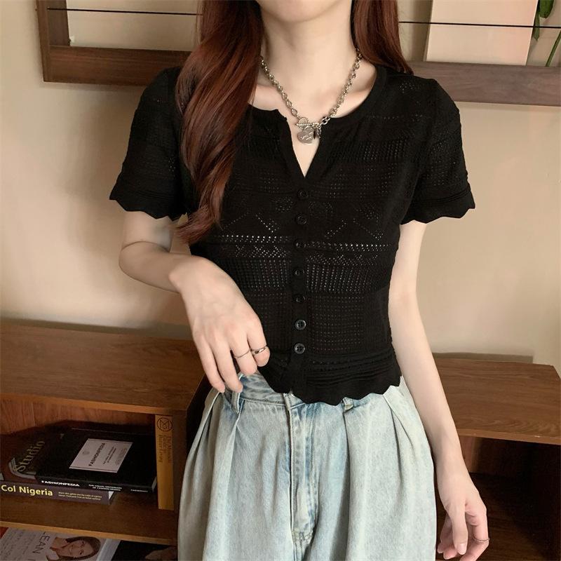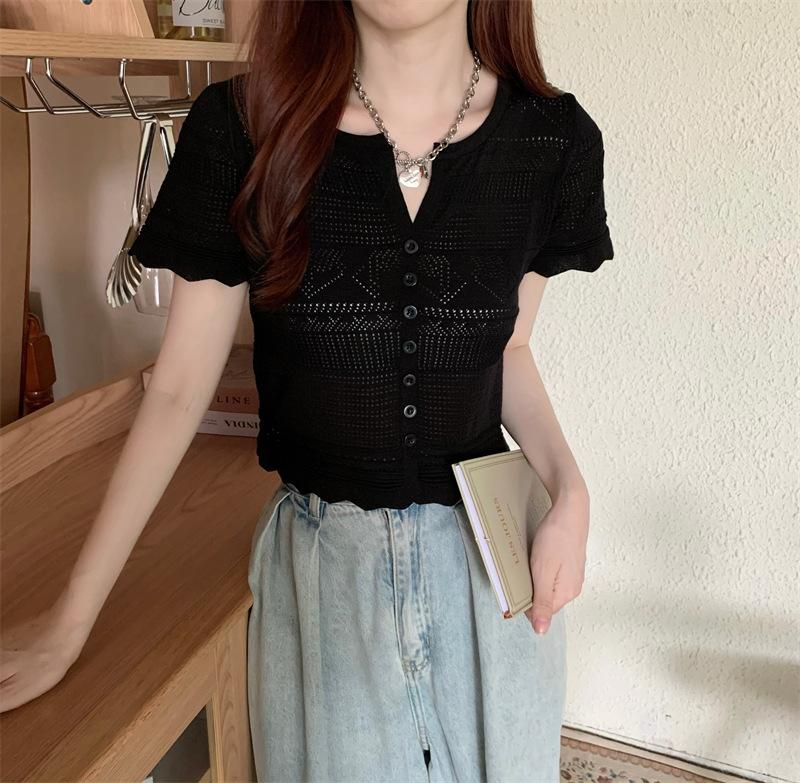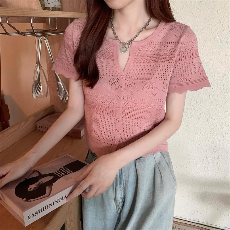Compra Cárdigan de punto de manga corta camiseta corta fina Verano 2024 Nuevo moda francesa suave cuello en V top versátil para mujer al por mayor en Joom.pro