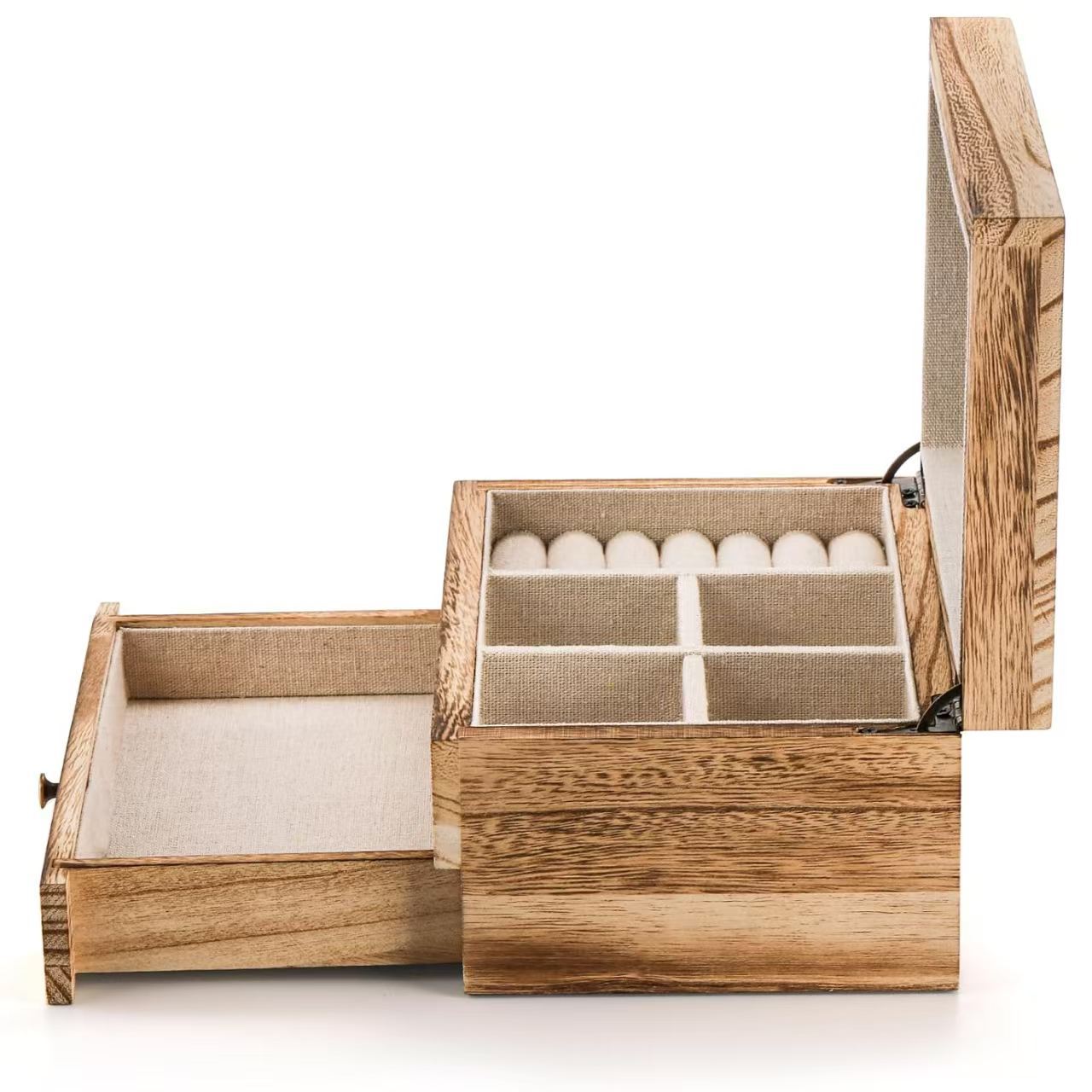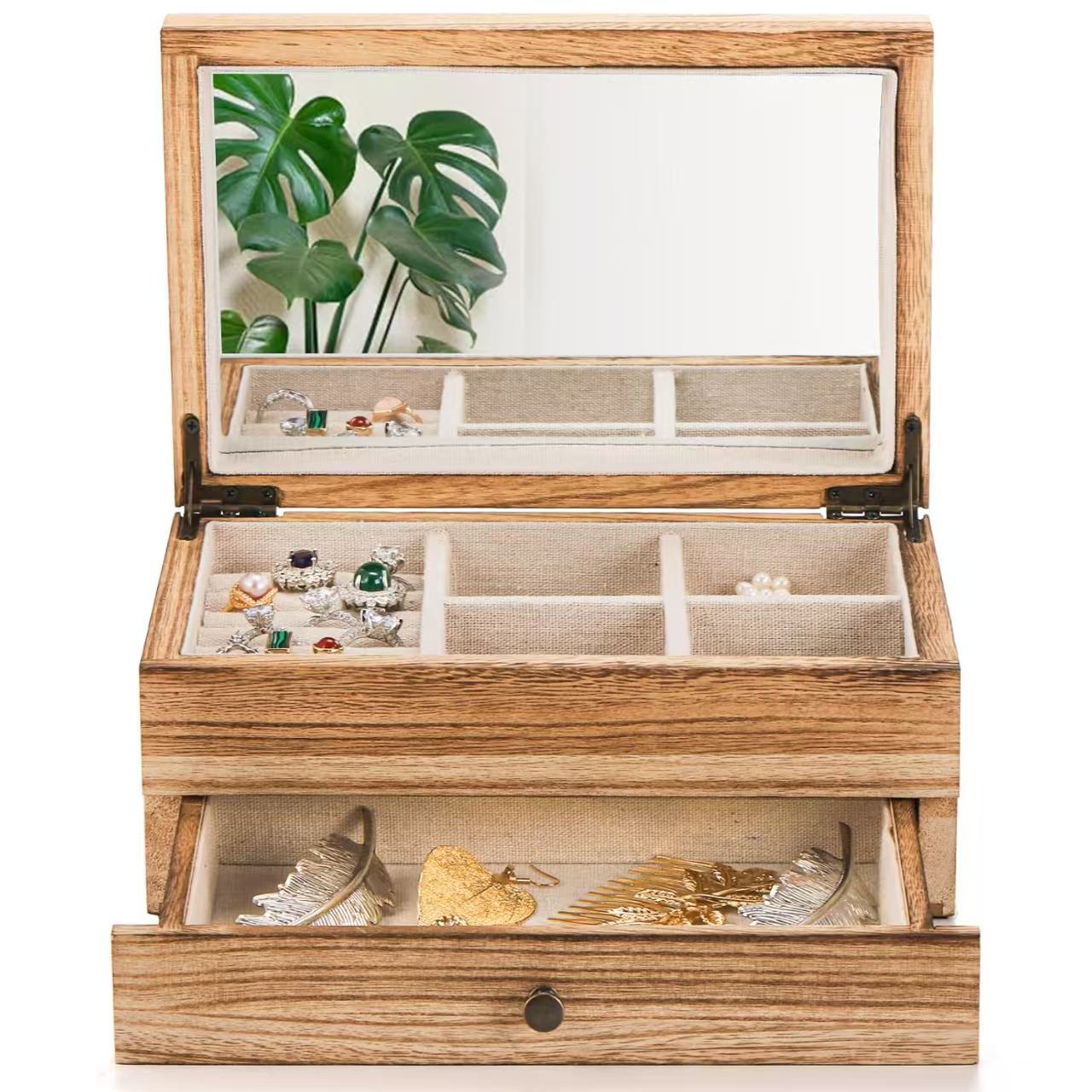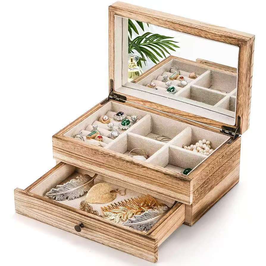 Caja de Joyería de Madera Maciza de Doble Capa para Mujer Transfronteriza con Espejo Caja de Joyería Bandeja para Anillos Exhibidor de Madera Caja Retro