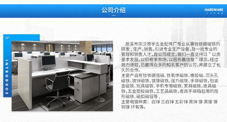 Los productos principales incluyen imanes fuertes de neodimio hierro boro, imanes de ferrita, imanes de goma, imanes para la salud, imanes con orificio avellanado, imanes galvanizados en zinc, imanes niquelados. Imanes potentes, imanes para bolsos, imanes para cajas de embalaje, imanes para juguetes, imanes específicos para teléfonos móviles, imanes para muebles, imanes para artículos de cuero, imanes para ferretería y plástico, imanes para manualidades, imanes invisibles para artículos de cuero, bolsos y equipaje, cierres magnéticos, botones magnéticos, etc.,