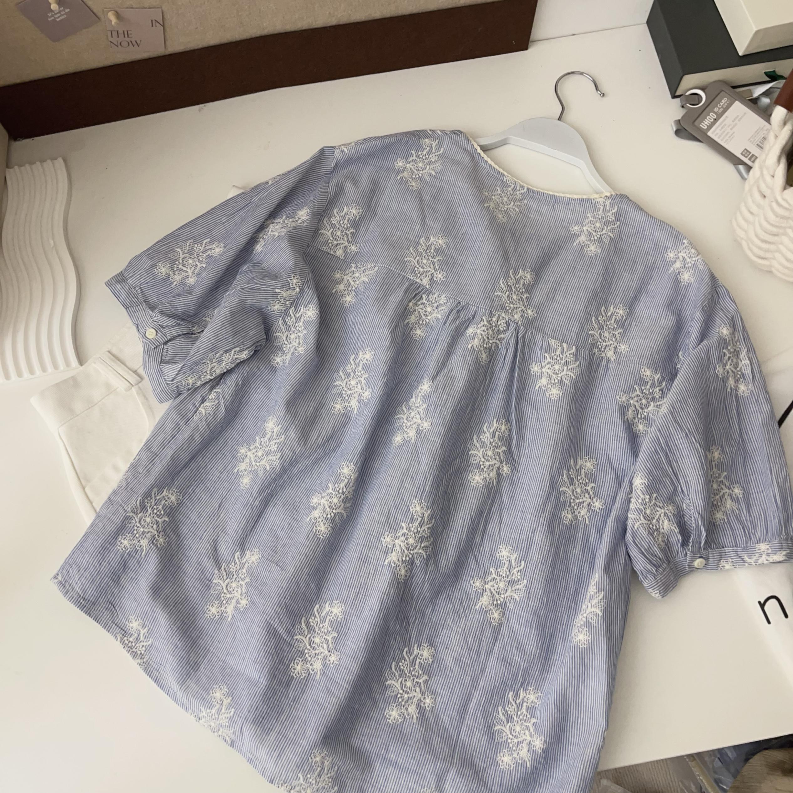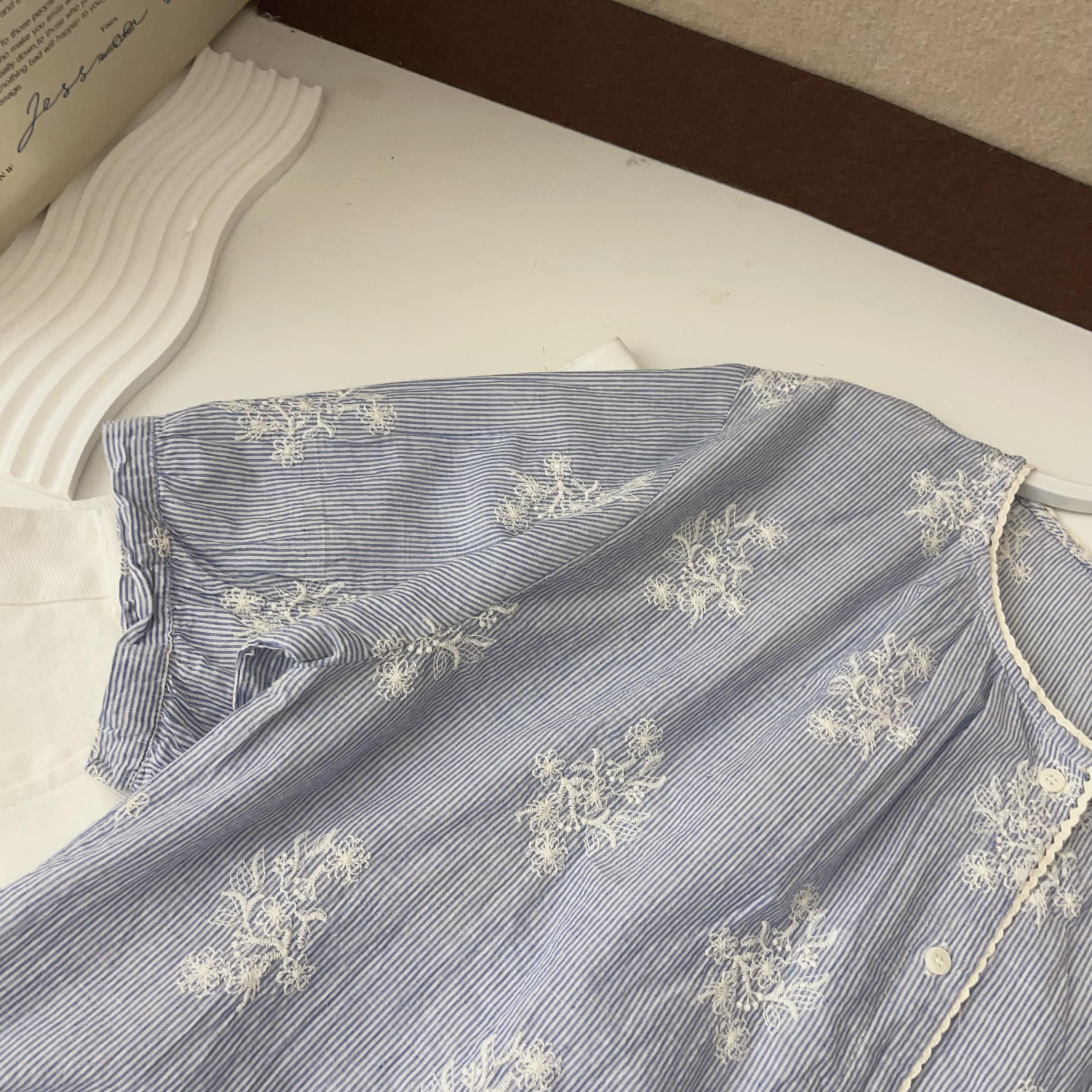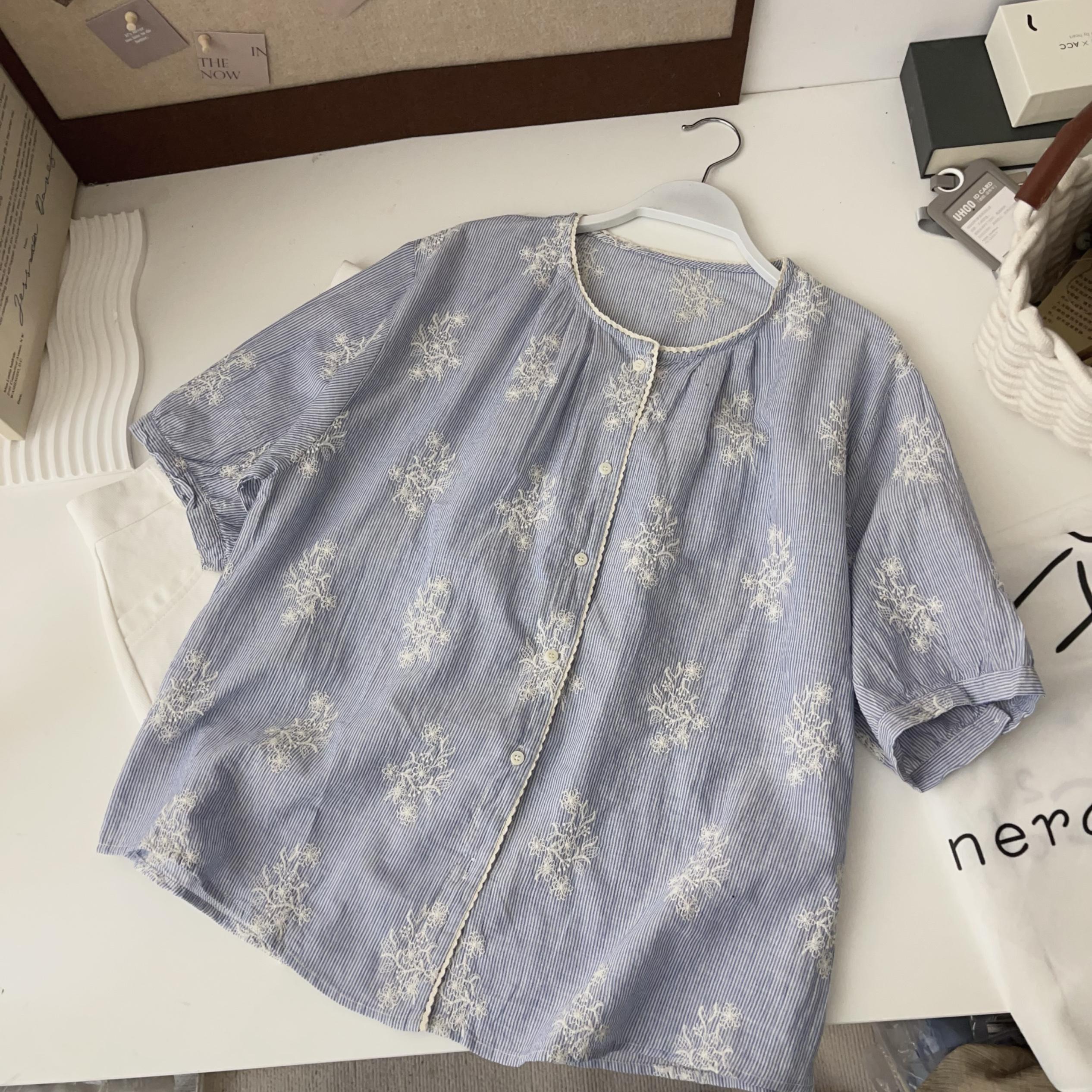 Verano 2025 Nuevo Estilo Coreano Moda Cuello Redondo Bordado Manga Corta Camisa para Mujer Diseño Holgado Sentido Pequeña Camisa Top Trendy