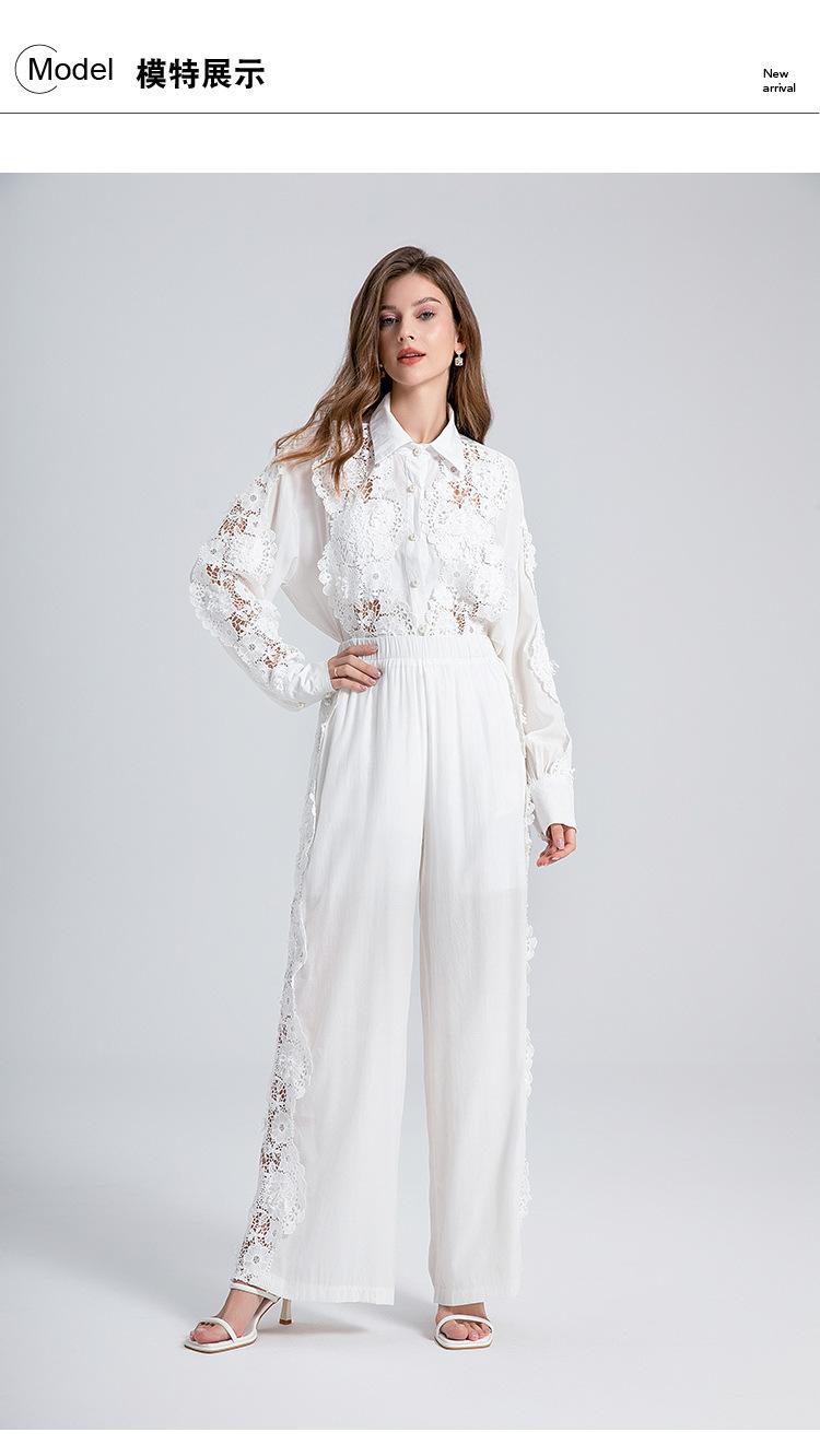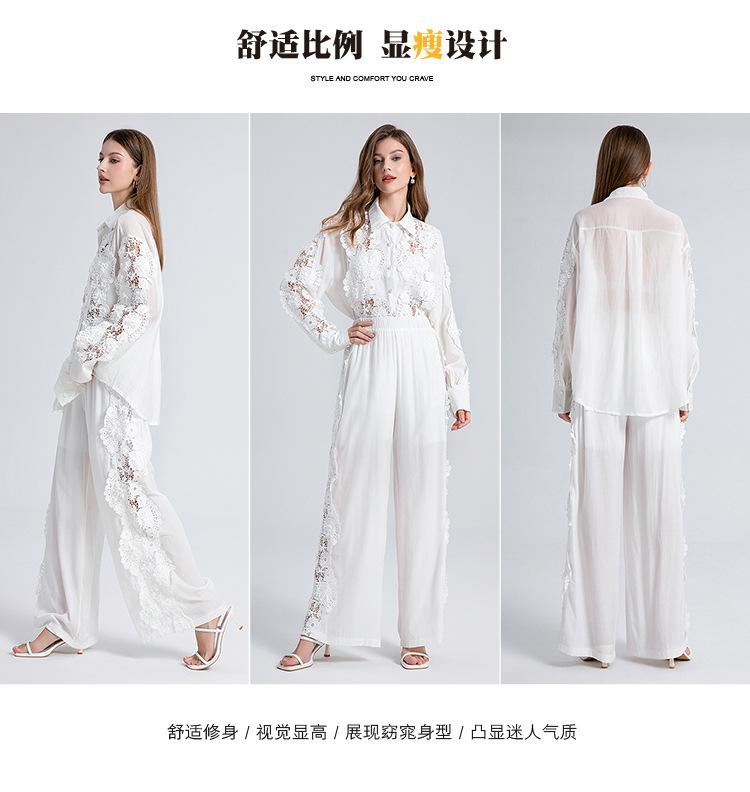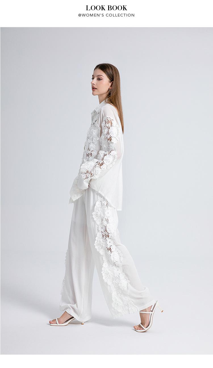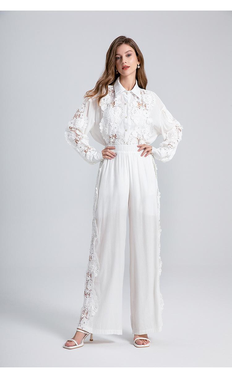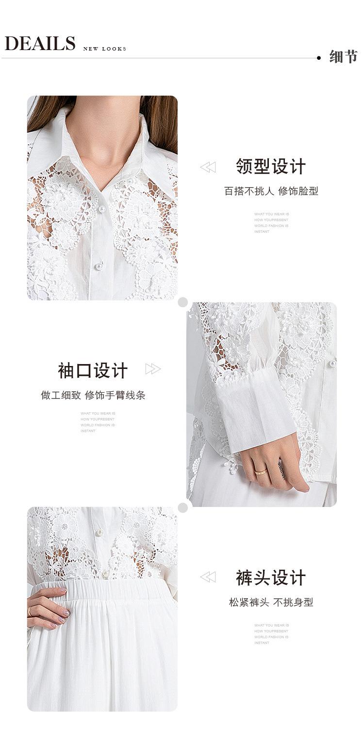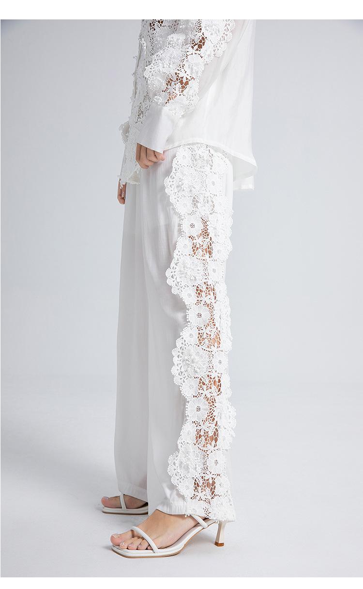 Camisa de Encaje Floral de Lujo Accesible a la Moda de Gama Alta de Manga Larga + Pantalones de Encaje de Cintura Elástica Traje de Dos Piezas