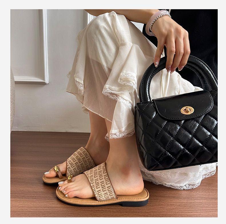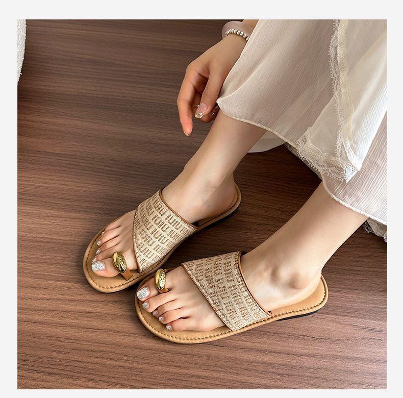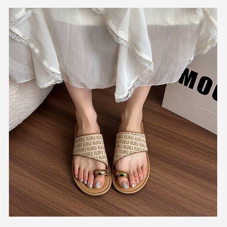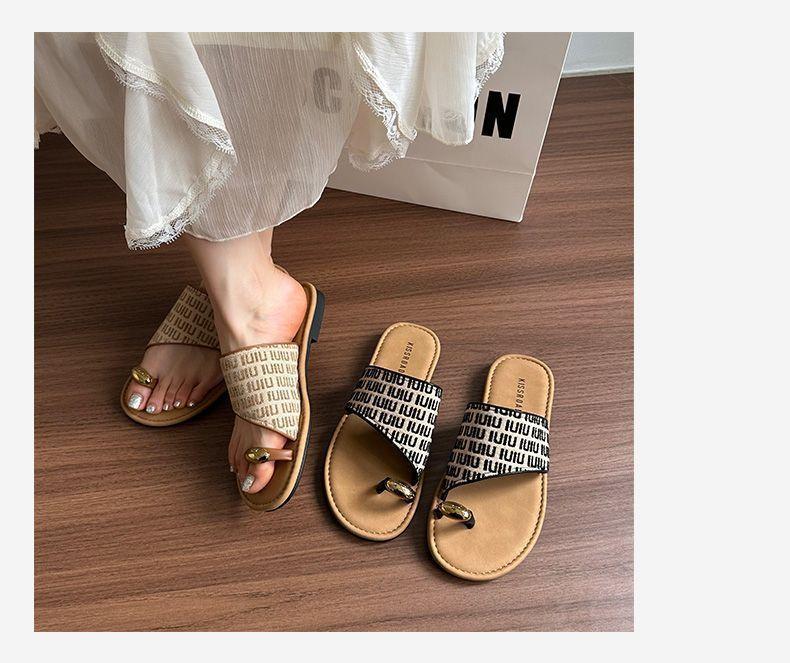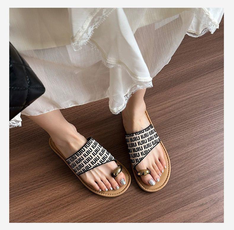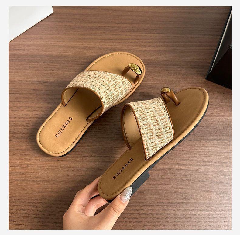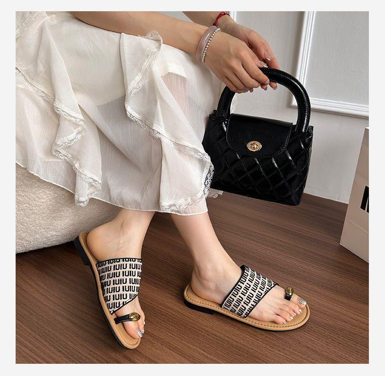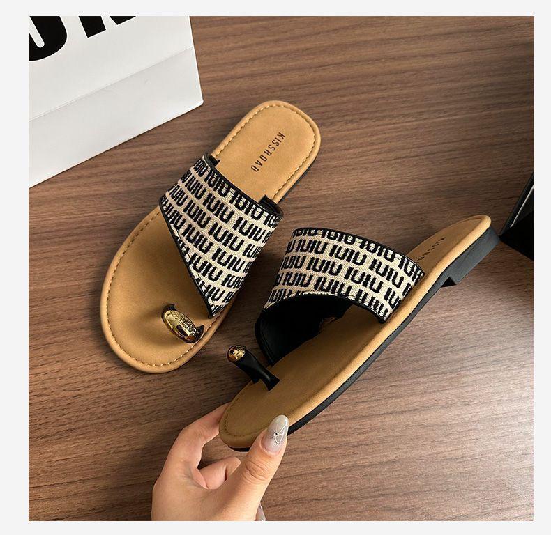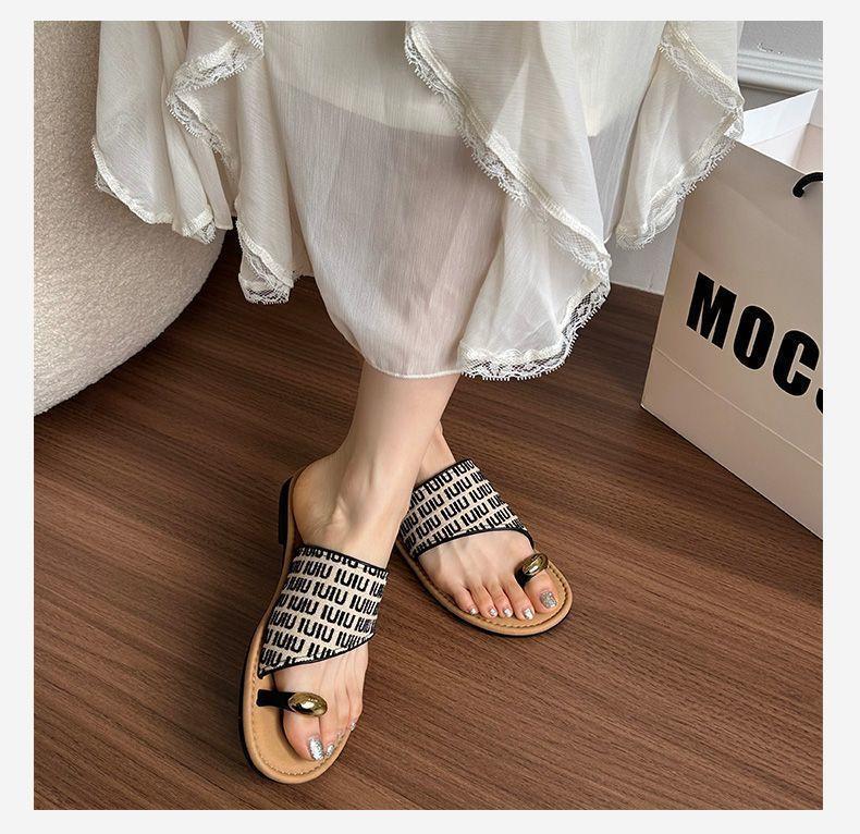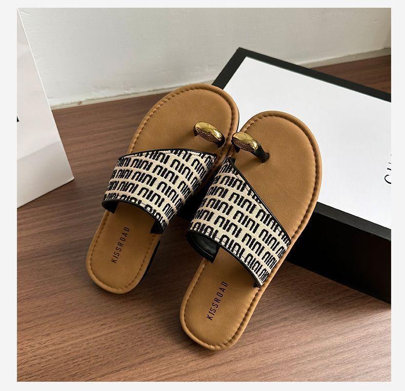 Zapatillas de Moda Retro con Lazo para el Dedo para Mujer 2025 Nuevo Verano para Exterior Estilo Coreano Suela Suave Tacón Plano Sandalias de Playa para Mujer