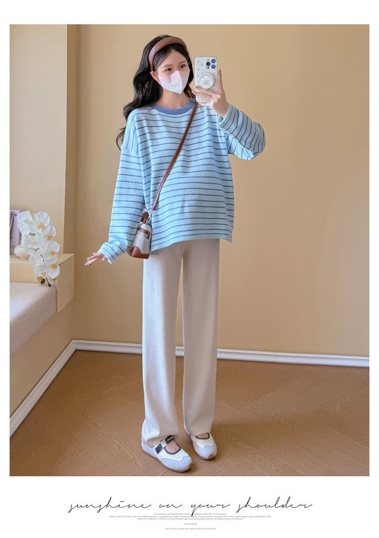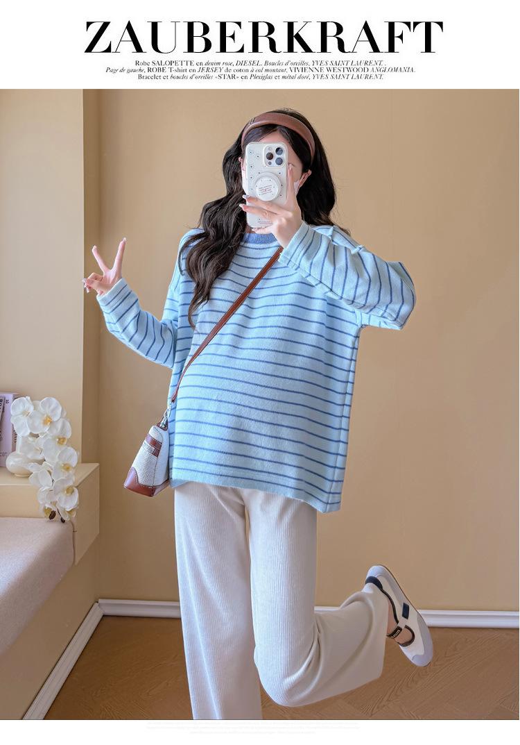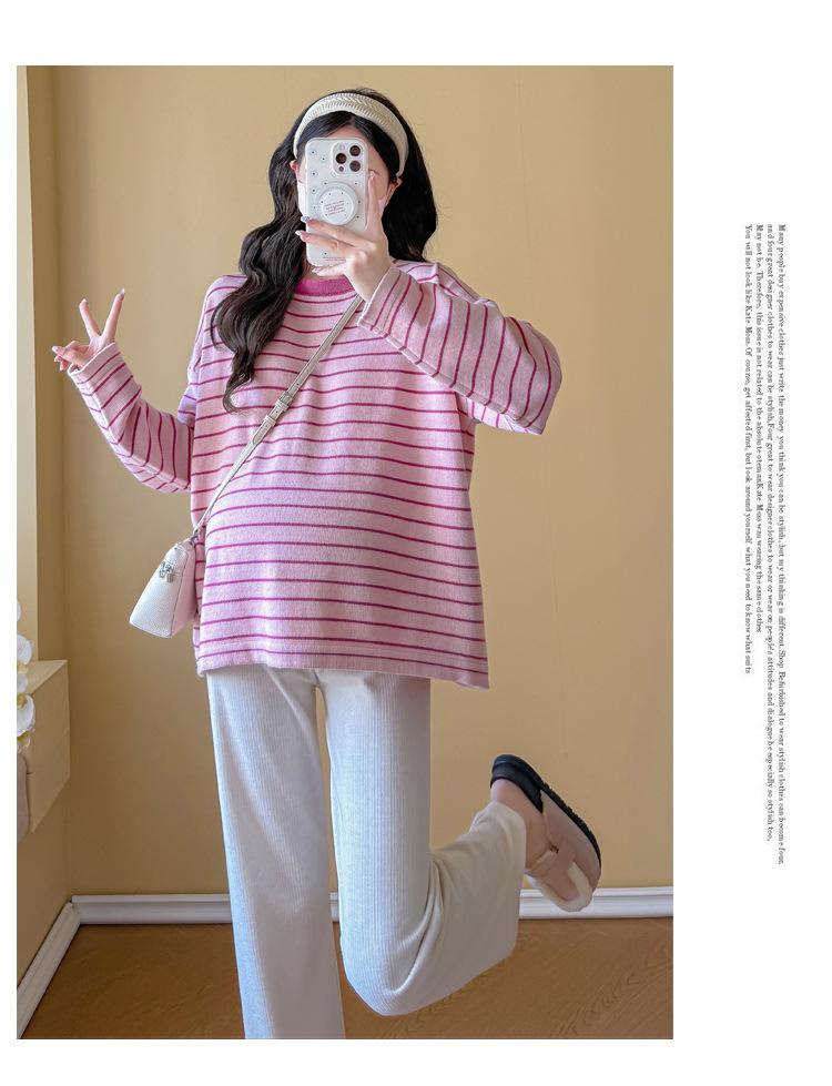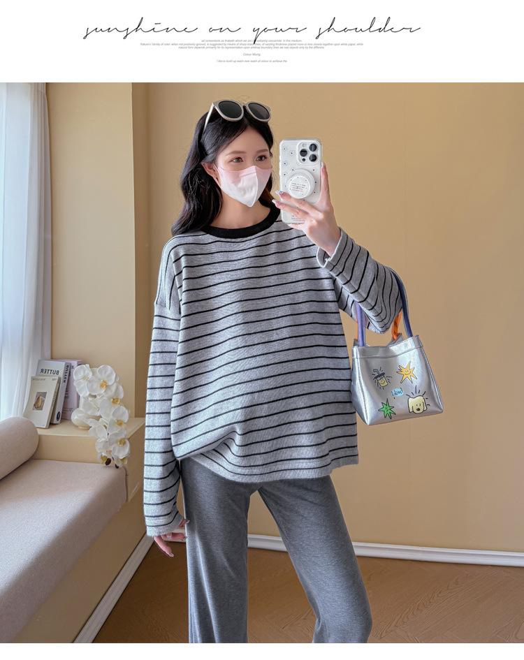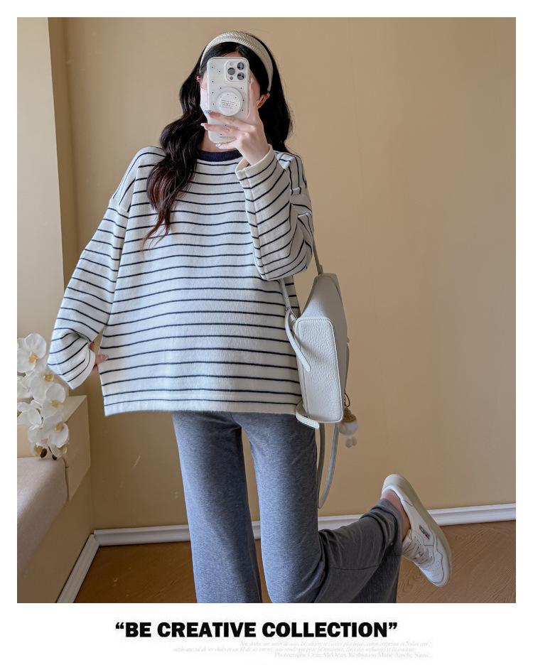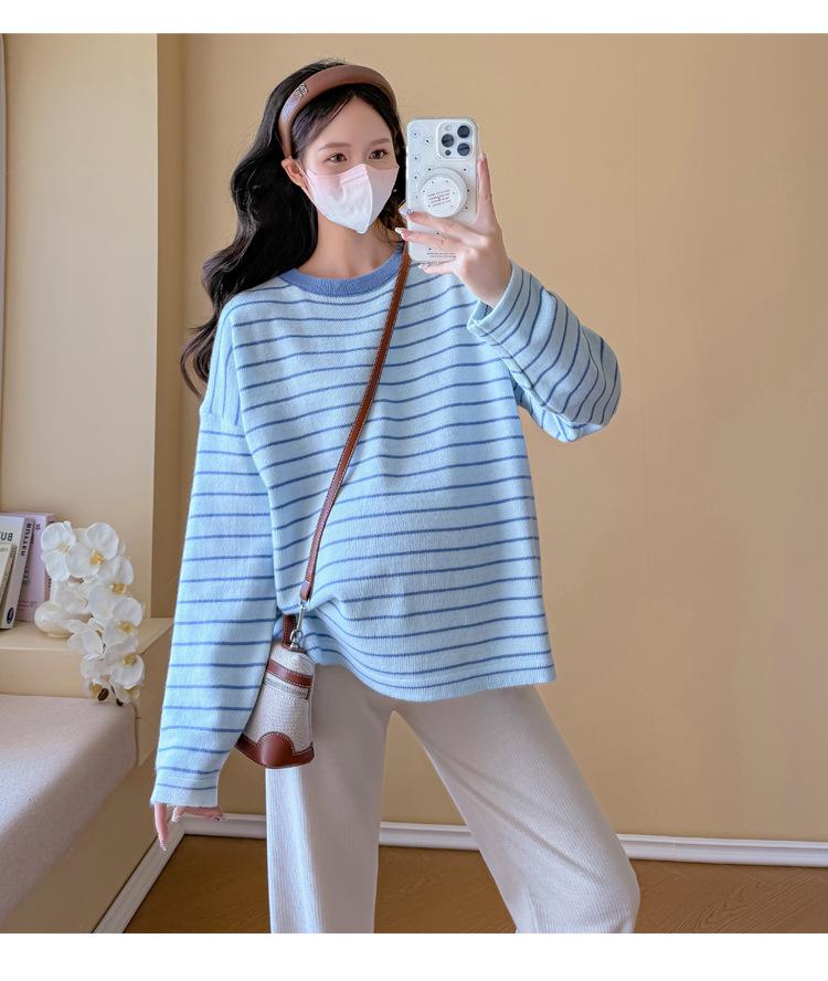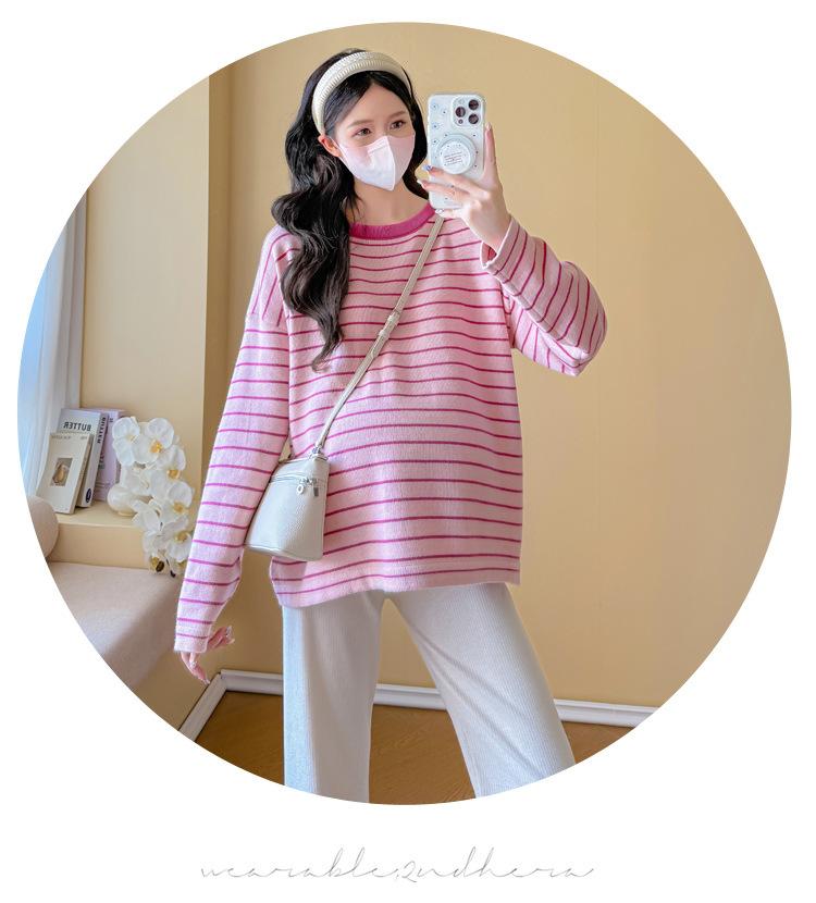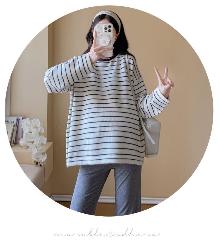 Ropa de Maternidad Suéter Rayado de Cuello Redondo Otoño e Invierno Nuevo Estilo Perezoso Casual Suelto Adelgazante Versátil Jersey Top de Maternidad